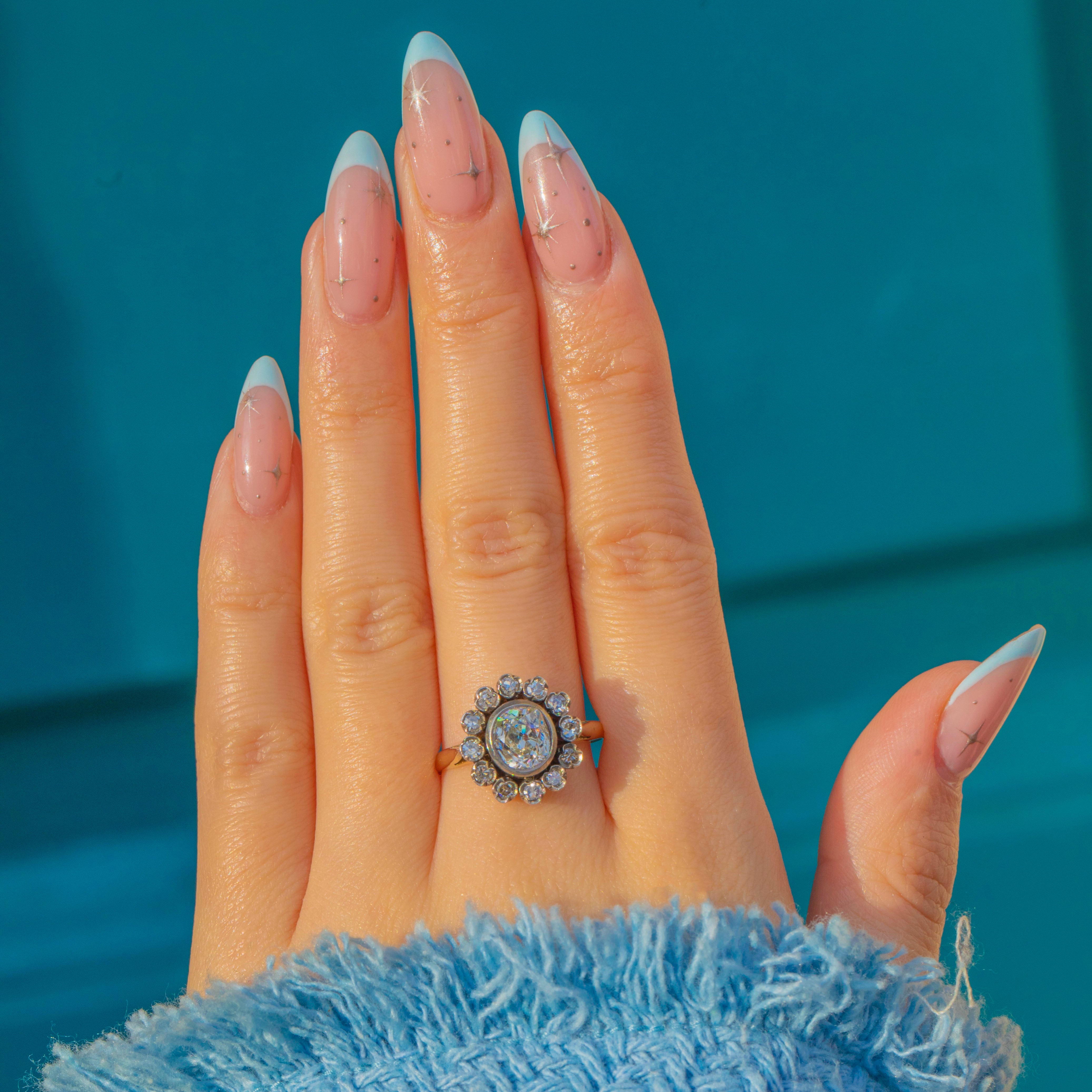 Beautifully two‑toned with a graceful, tapered Gold shank, this daisy cluster offers timeless elegance and scintillation in equal measure. With a combined Diamond weight of approximately 1.32ct, it’s a luminous choice for an engagement ring or a forever‑treasure from the Victorian era.