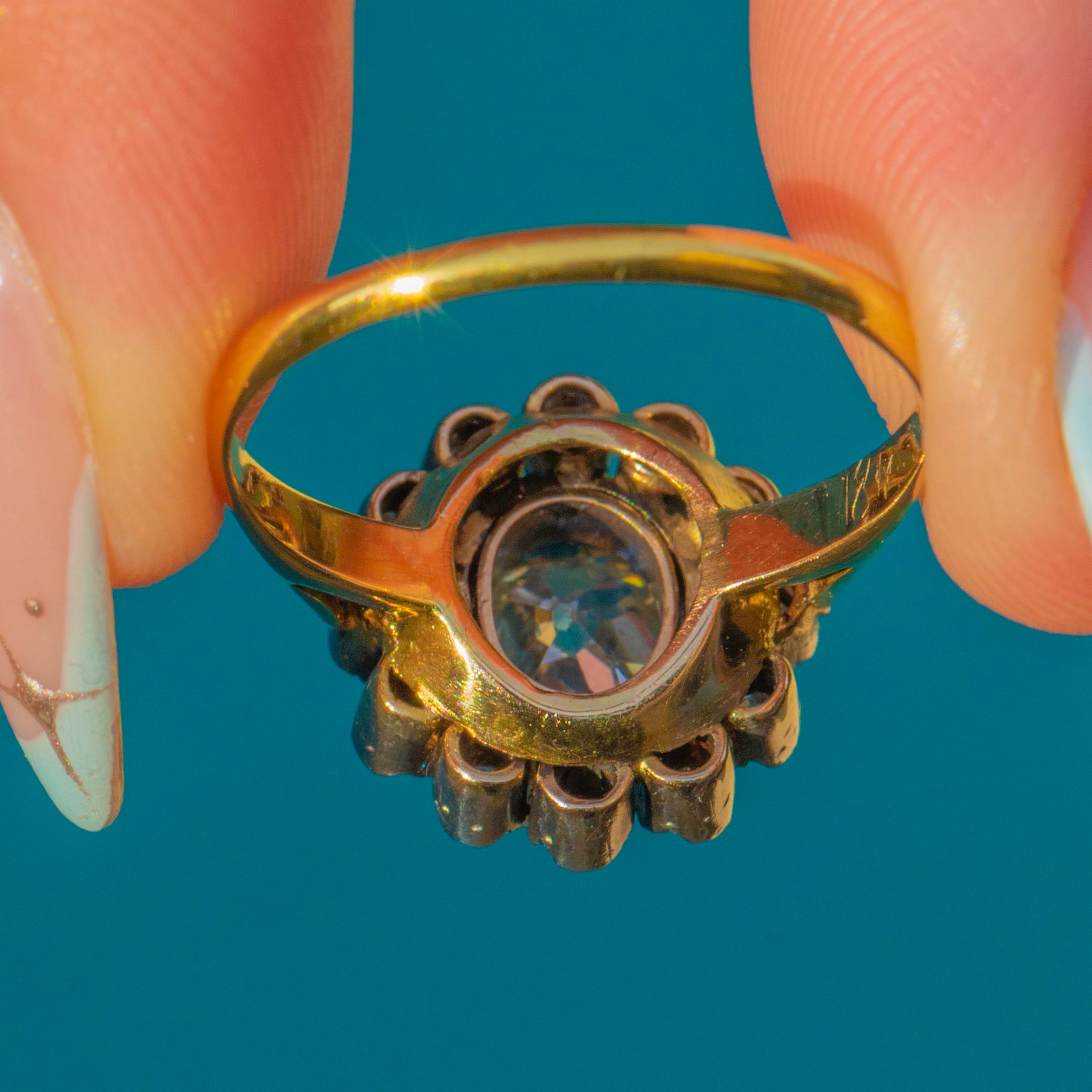 EXCELLENT: The Diamonds are bright and lively; the centre shows I/J colour and VS–SI clarity with some inclusions visible under 10x but no dark spot inclusions. The Sterling Silver settings are secure with a pleasing antique patina, and the 18ct Gold shank shows only minimal surface wear. There is evidence of a past resize to the back of the band, done to a high standard.