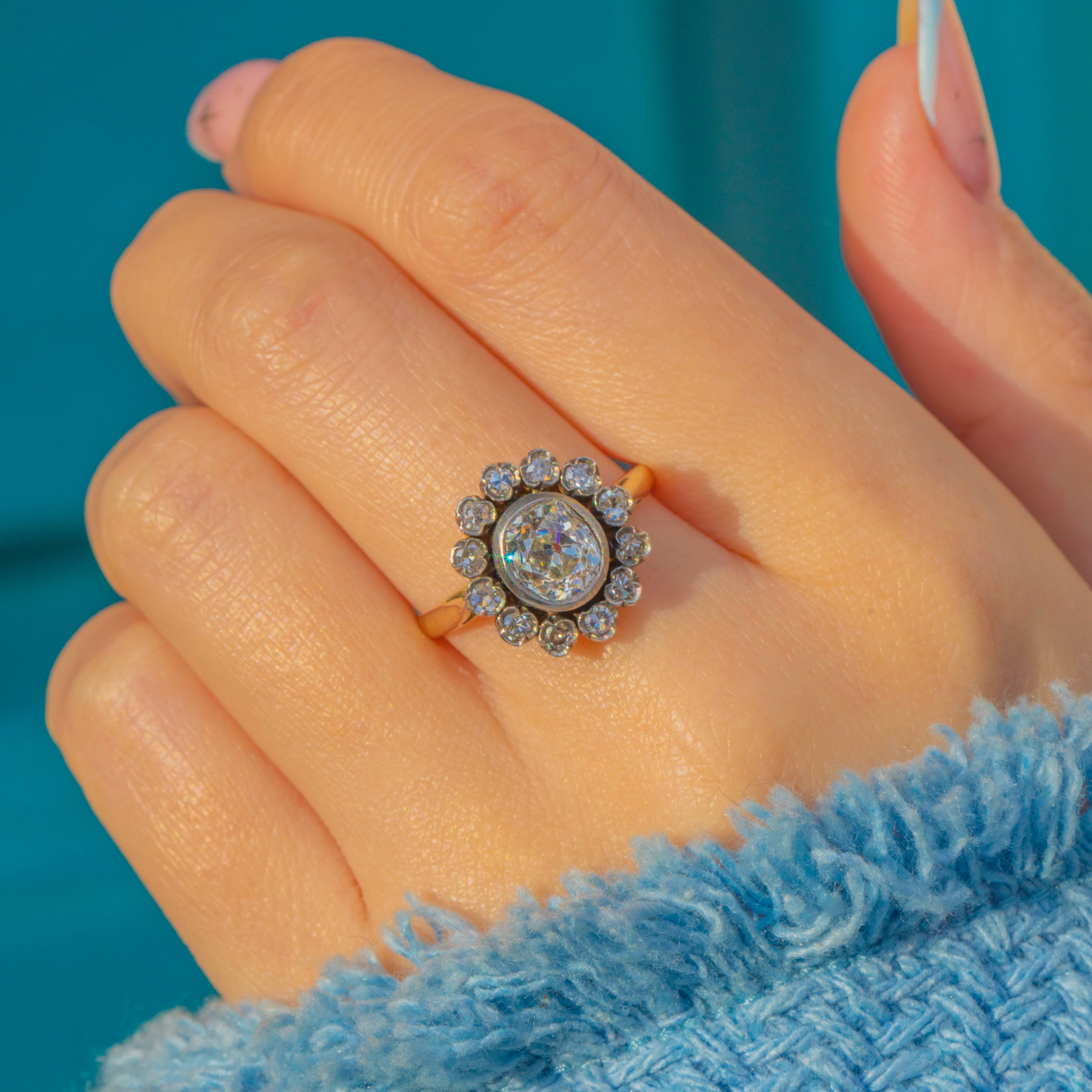 A romantic Victorian Diamond cluster ring, hand‑crafted in glowing 18ct Yellow Gold with Sterling Silver settings. At its heart sits an antique cushion/old mine cut Diamond of approximately 1.20ct, graded I/J colour and VS–SI clarity, bezel‑set to showcase its gorgeous old‑world character. Twelve charming old cut Diamonds encircle the centre in a scalloped, Silver‑topped halo, lending that unmistakable antique sparkle.