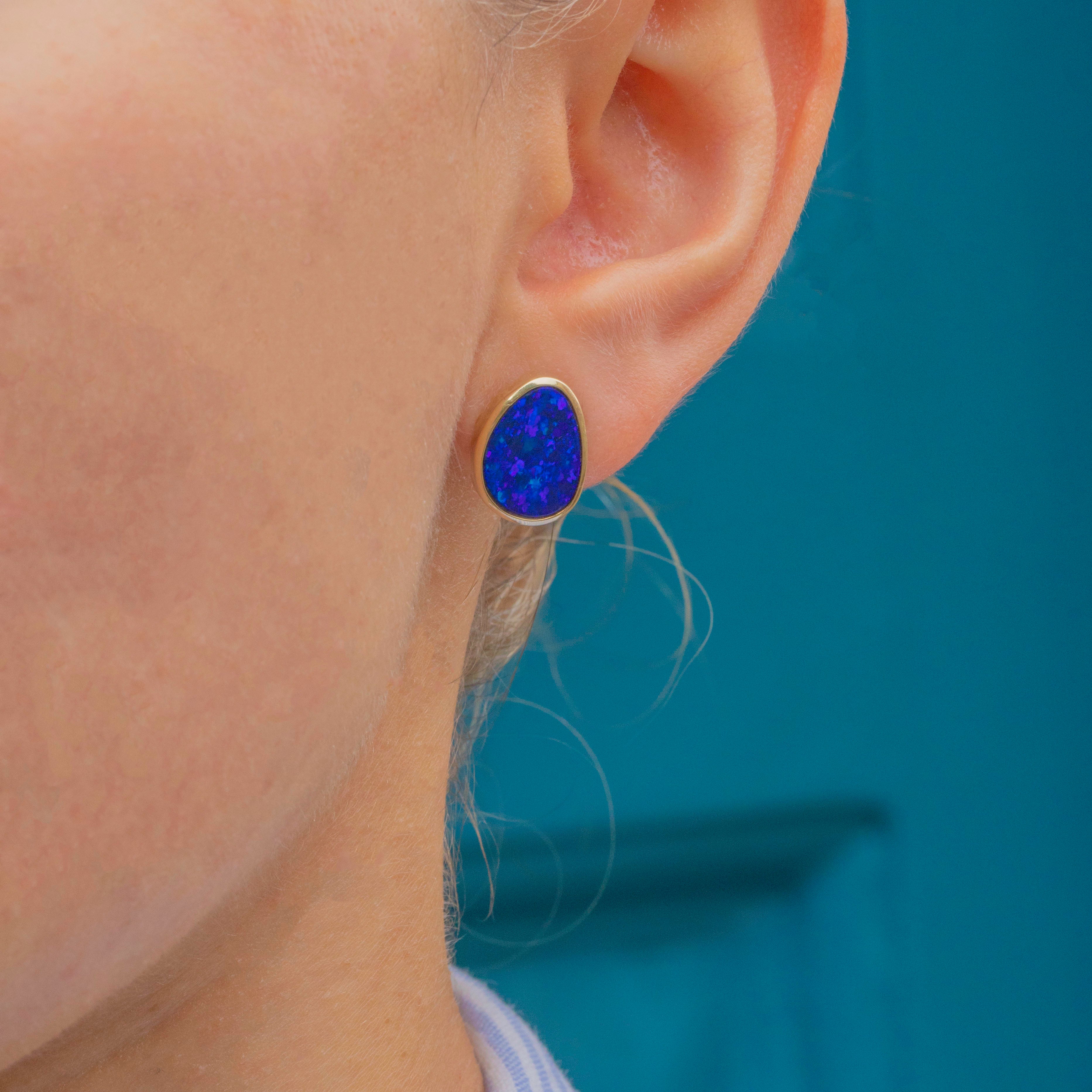 Each vintage earring boasts a vibrant and intensely saturated deep blue Boulder Opal, displaying striking flashes of cerulean as they catch the light.