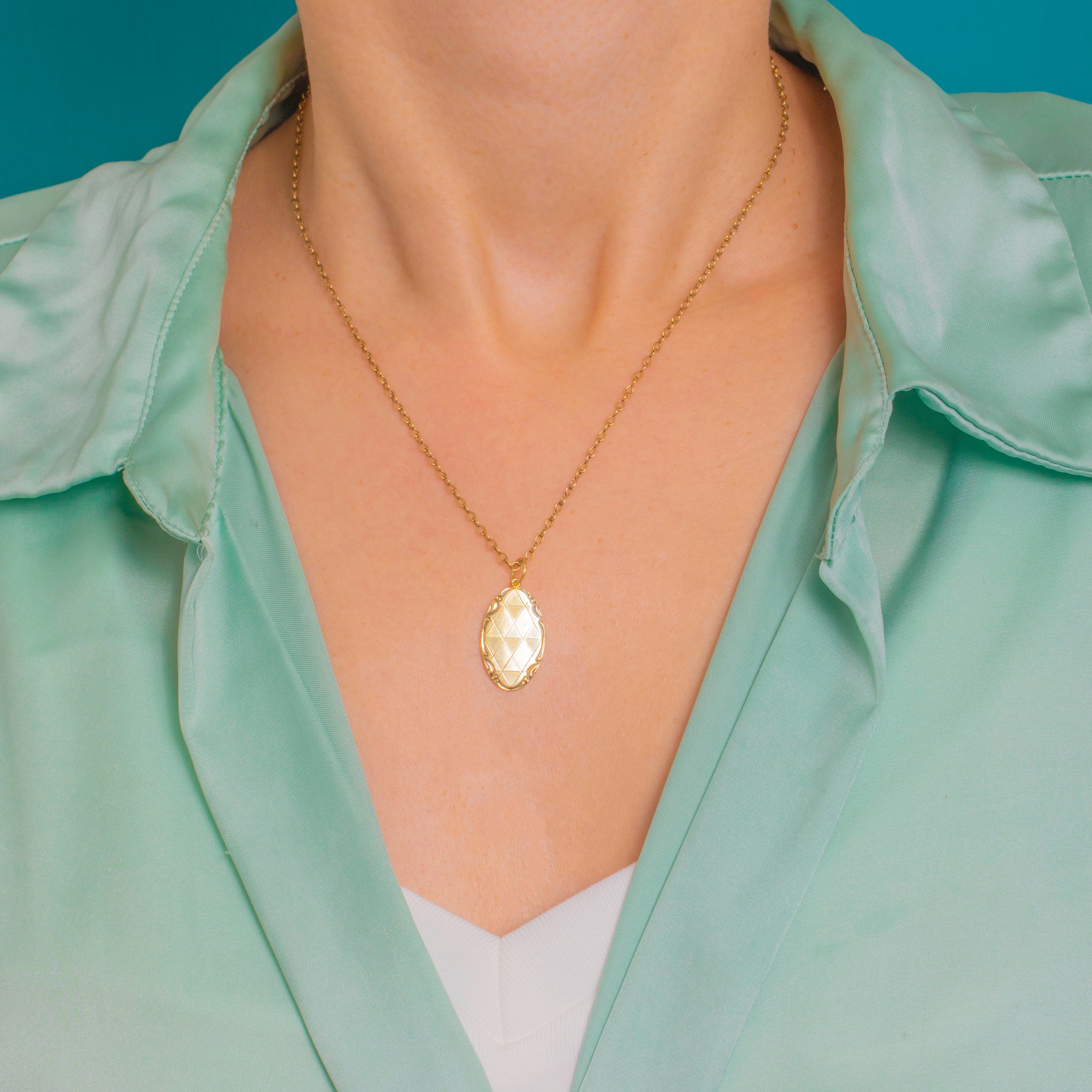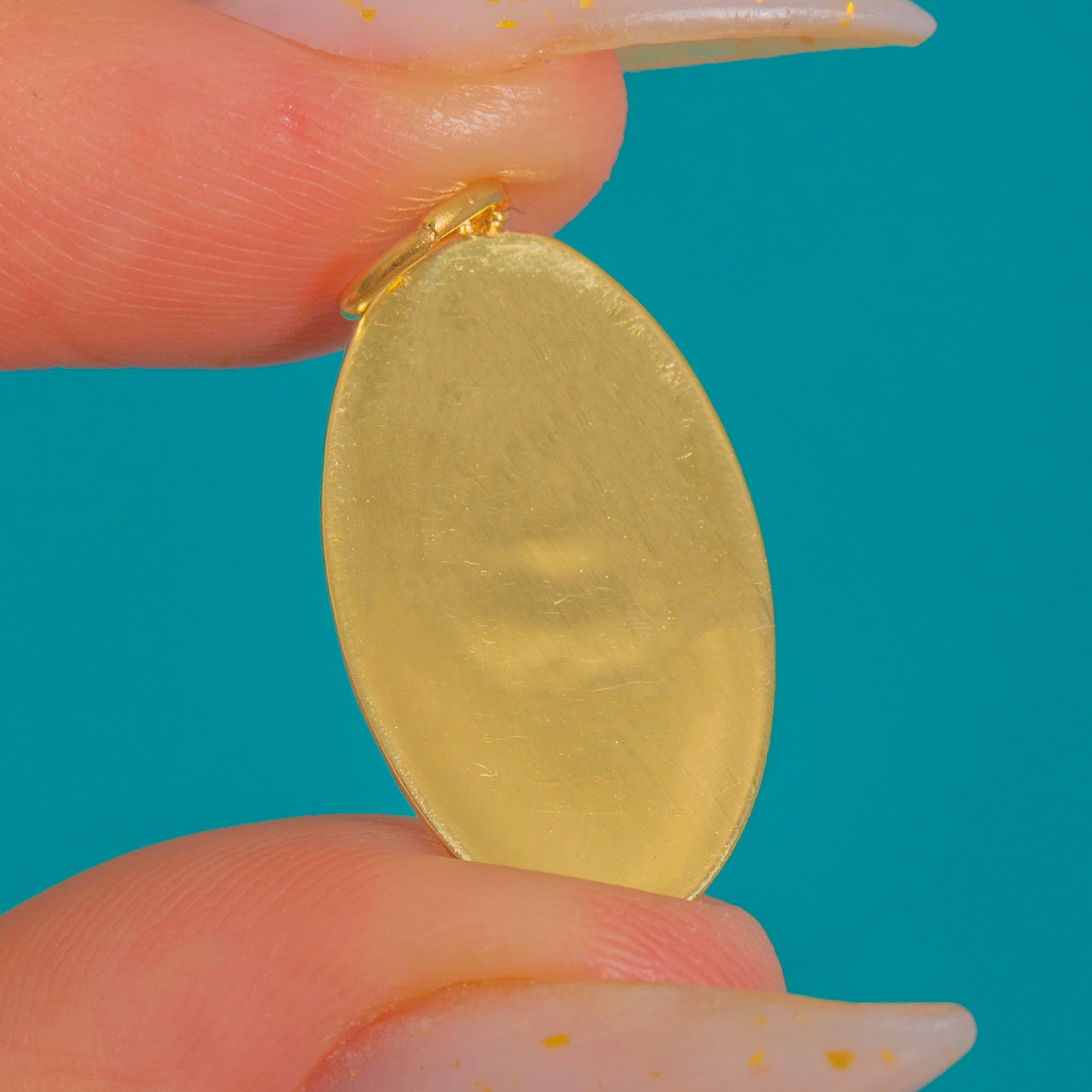 A petite Art Deco treasure in warm 14ct Gold, this engraved oval charm is refined and exquisitely detailed. The front is crisply engine-turned with a geometric lattice, framed by a raised border punctuated with subtle foliate scrolls, while the reverse is smooth and plain for a sleek finish.