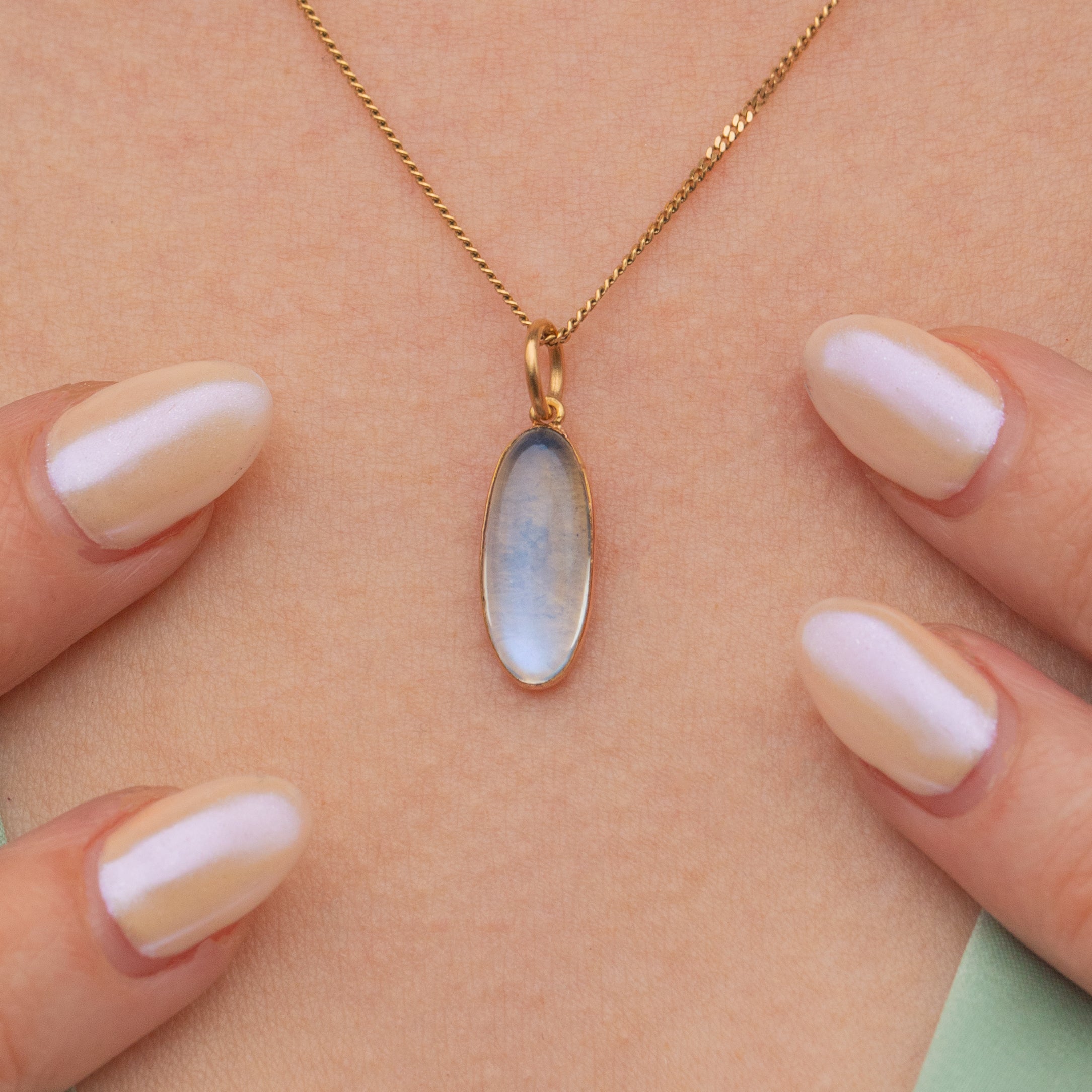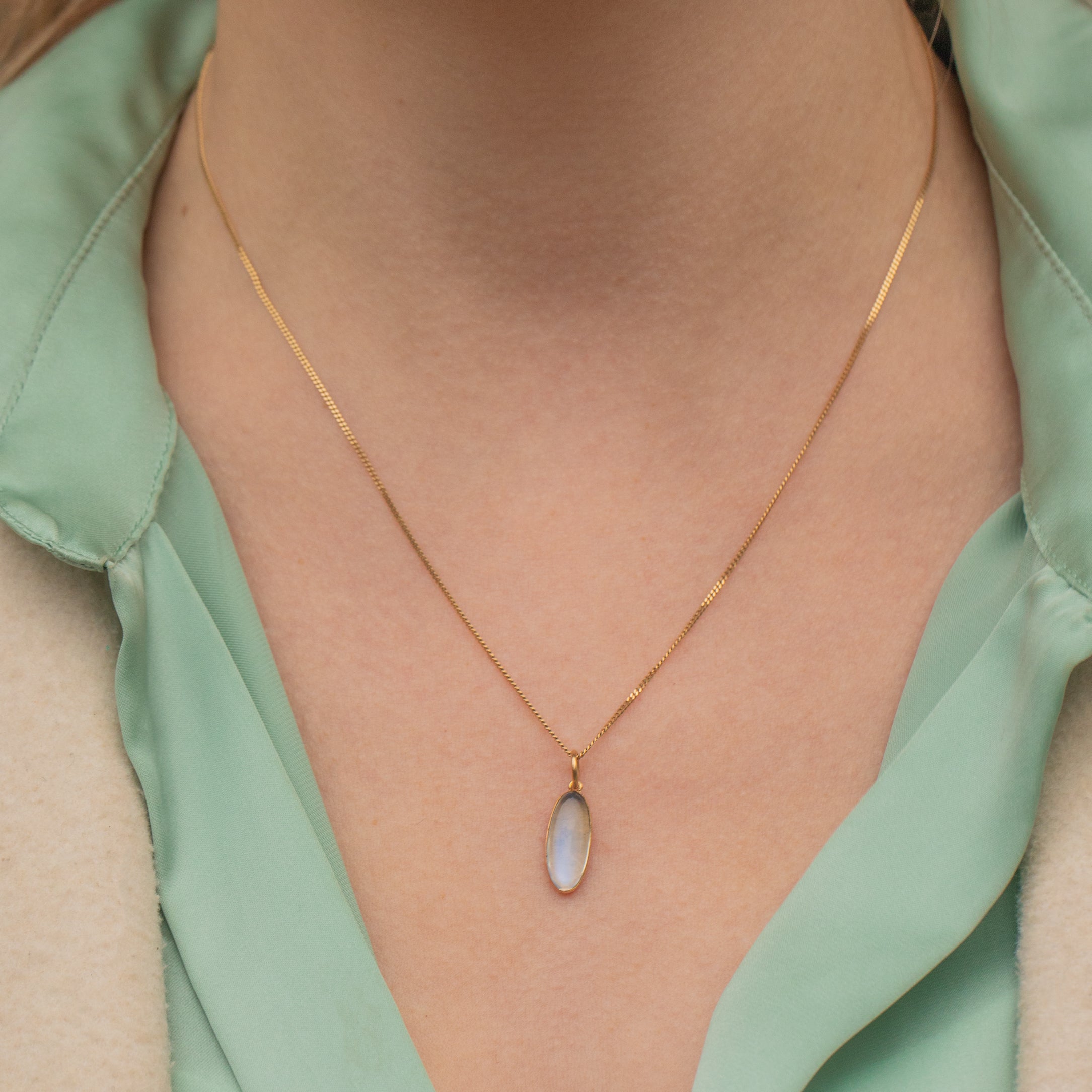 You will instantly become entranced by this 14ct Gold Moonstone pendant! The silver schiller of her Moonstone glistens softly against the buttery backdrop of her 14ct Gold bezel setting, like a moonlit sky on a clear winter's night.