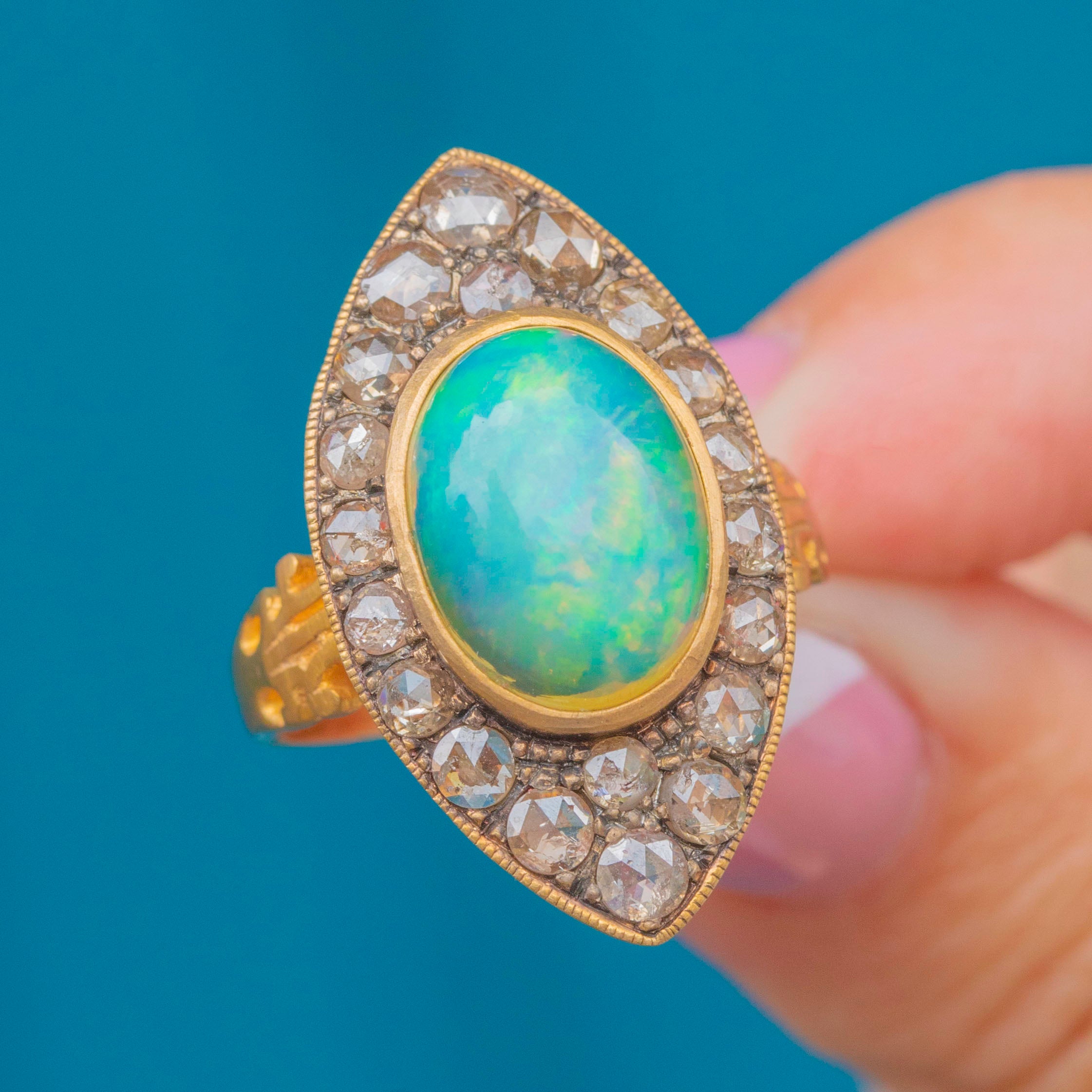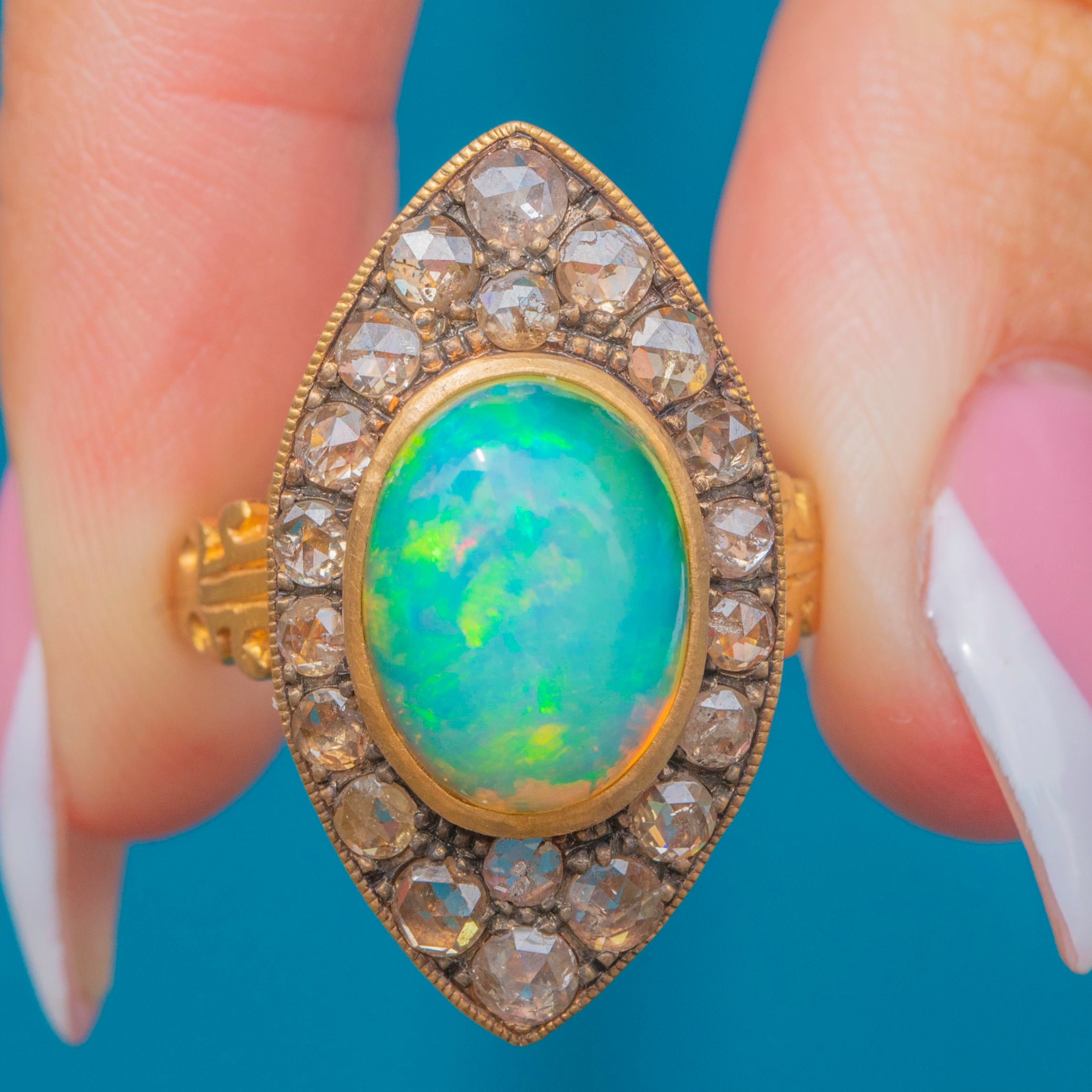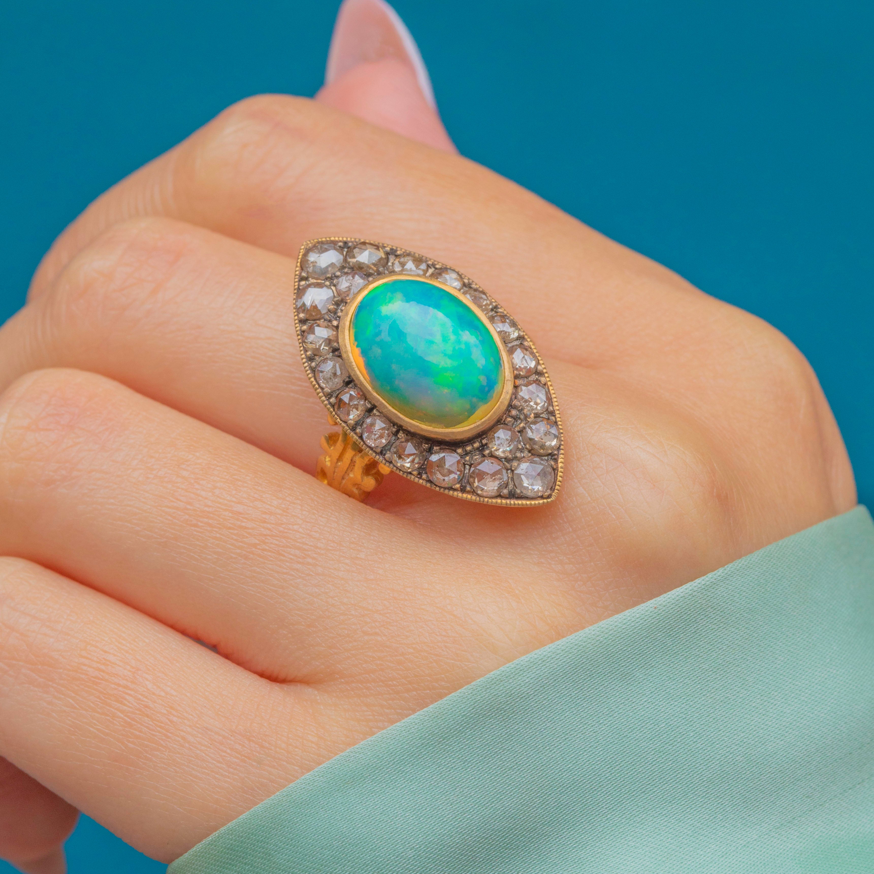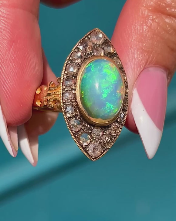 This vivacious vingage Opal ring is bursting with flashes of zesty green and pops of neon peach, shimmering across her 2.70ct Opal! The navette shape elongates the finger and is encrusted with magnificent rose-cut Diamonds, creating a timeless design that is guaranteed to be admired for years to come.