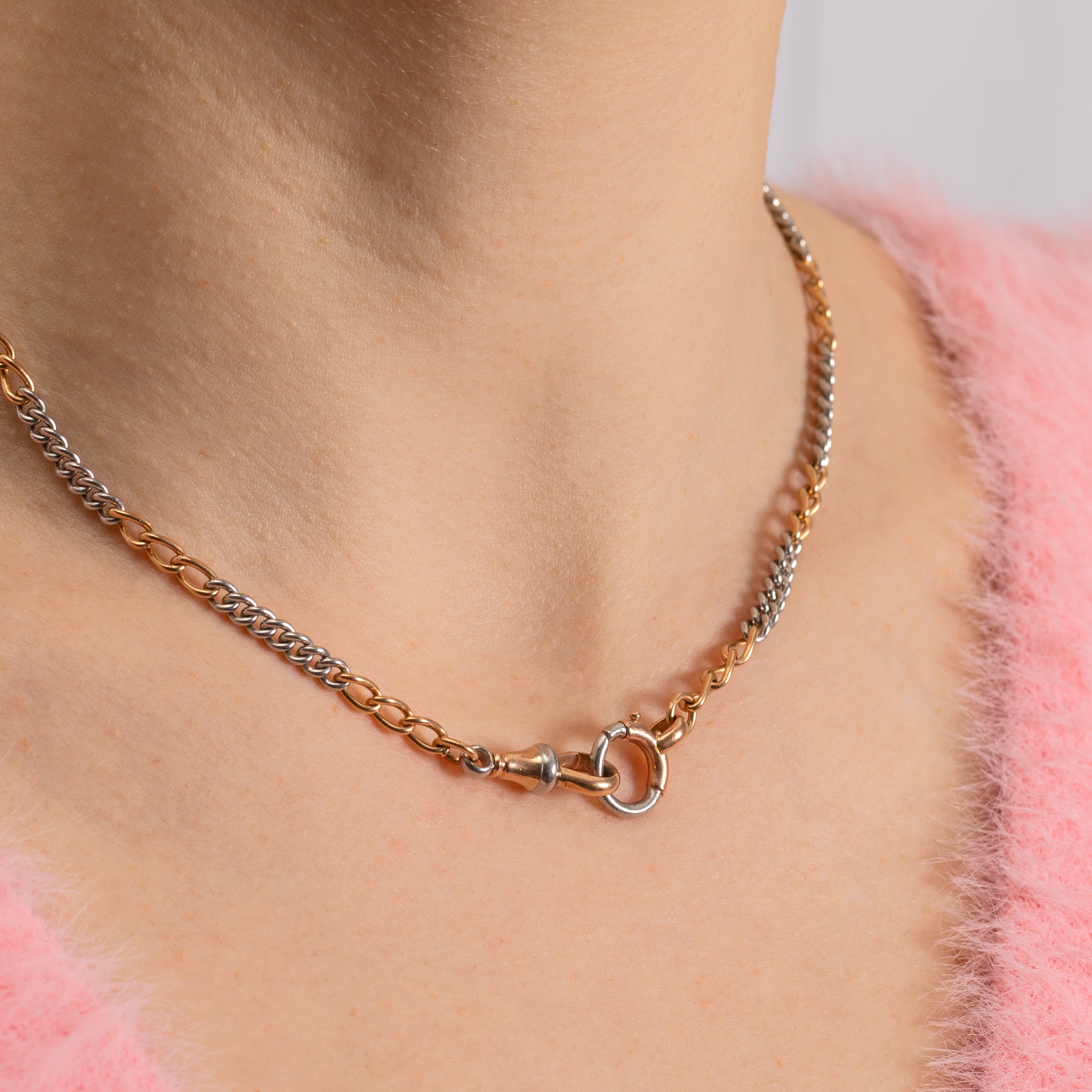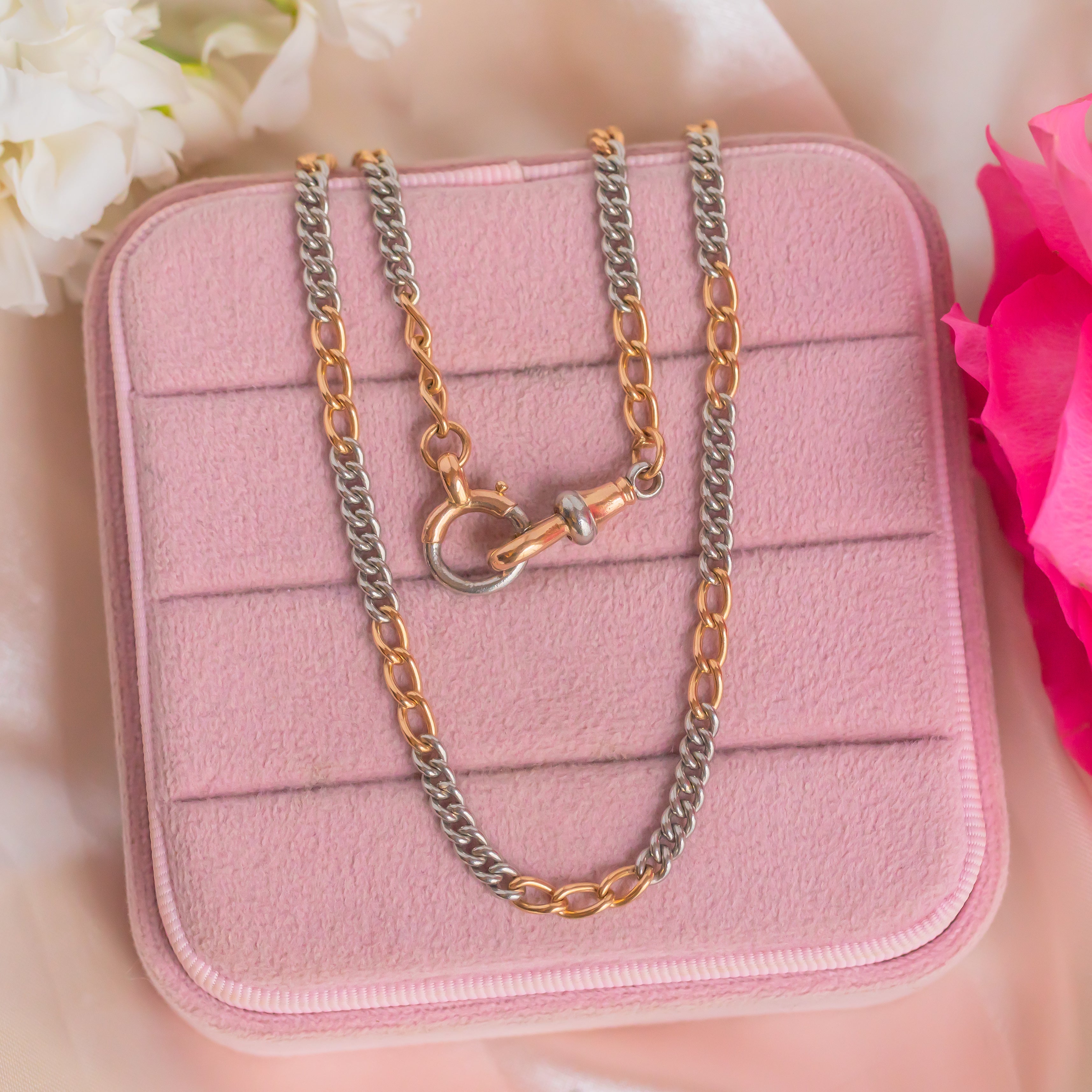 This 15.5" Art Deco 18ct Gold Platinum bi-coloured chain will be the hot topic of conversation as she adorns your neck! Platinum and Gold curb links of varying sizes are entwined to form her 15.5" length; the contrast of mixed metals is what will set your collection apart from the rest with this antique curb chain.