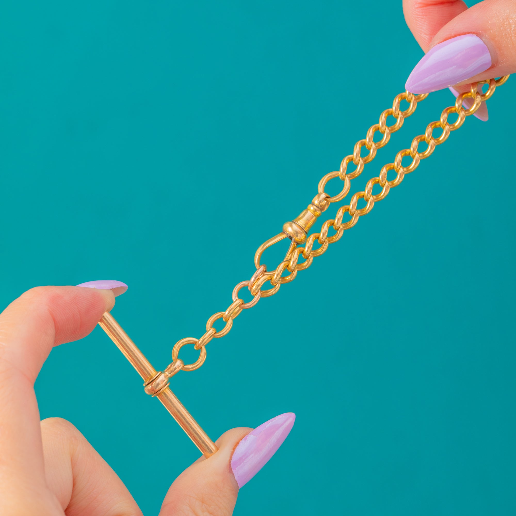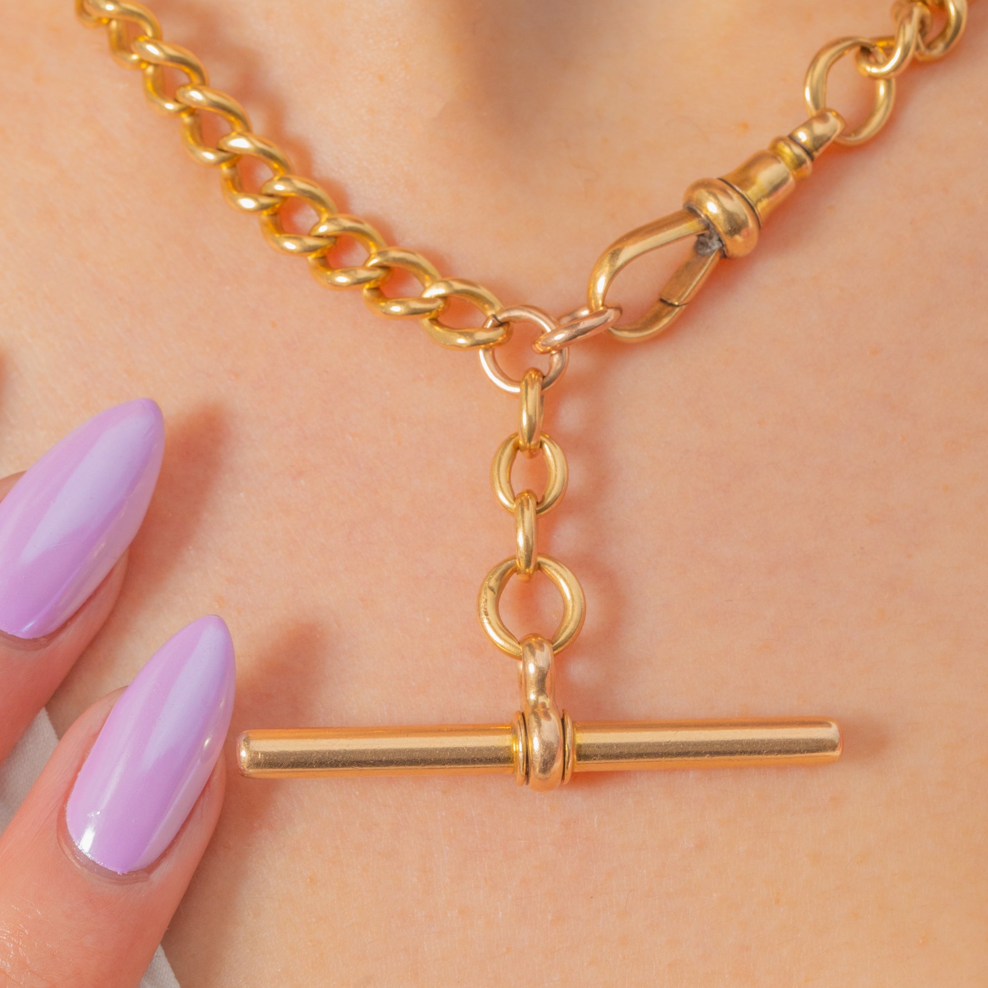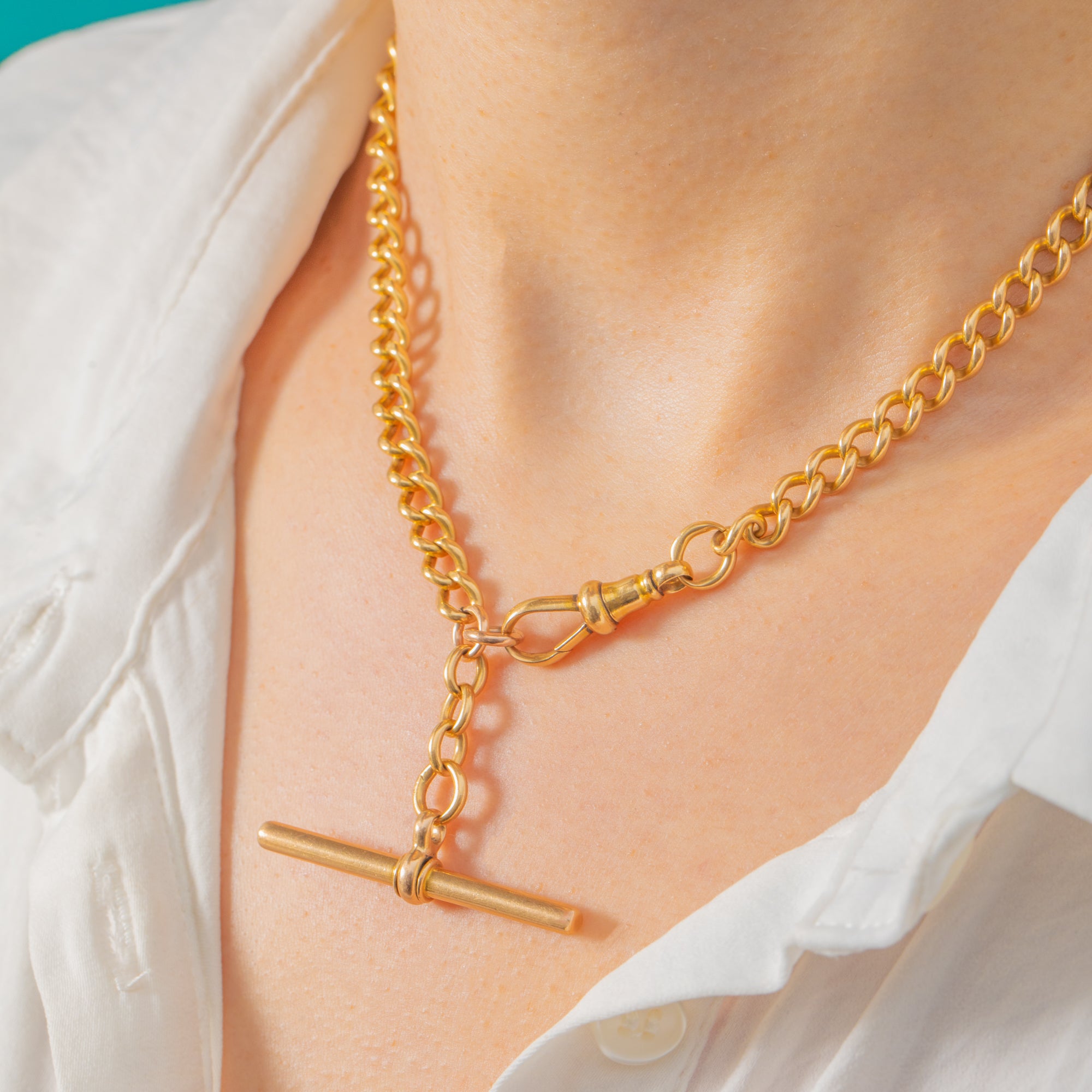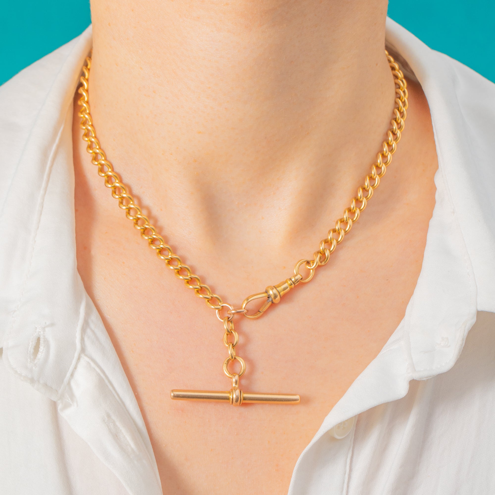 A sumptuous Victorian curb chain in glowing 18ct Gold, crowned with a classic T-Bar crafted in 15ct Gold. The rounded, uniform links flow with a refined polish and an assured, utilitarian elegance that nods to traditional watch-chain styling.