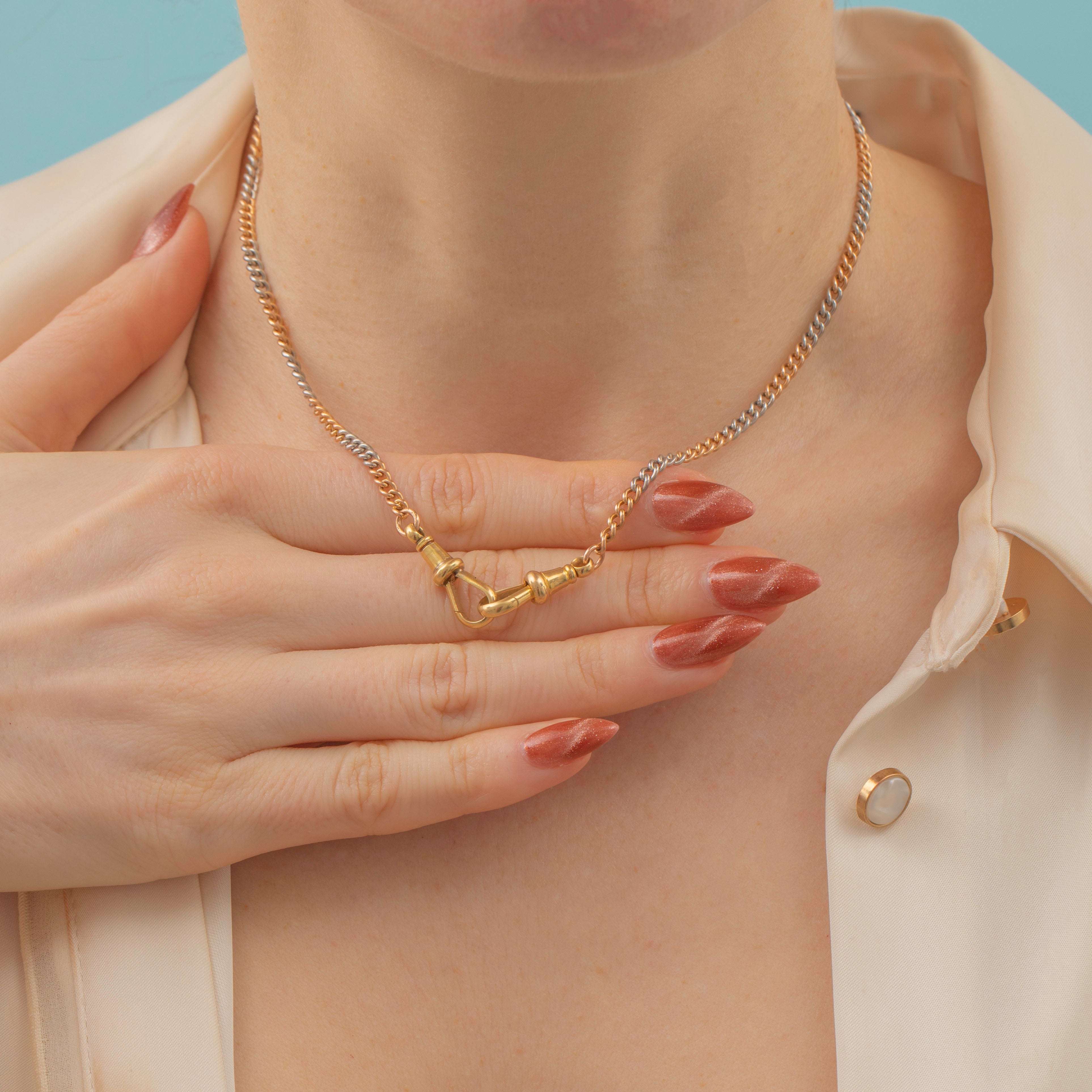 EXCELLENT: This antique 18ct Gold Platinum bi-coloured chain is in excellent condition! The links are perfectly interlinked and the combination of metals creates a striking contrast. Both the dog-clips are in superb working condition. She is just waiting to adorn your neck!