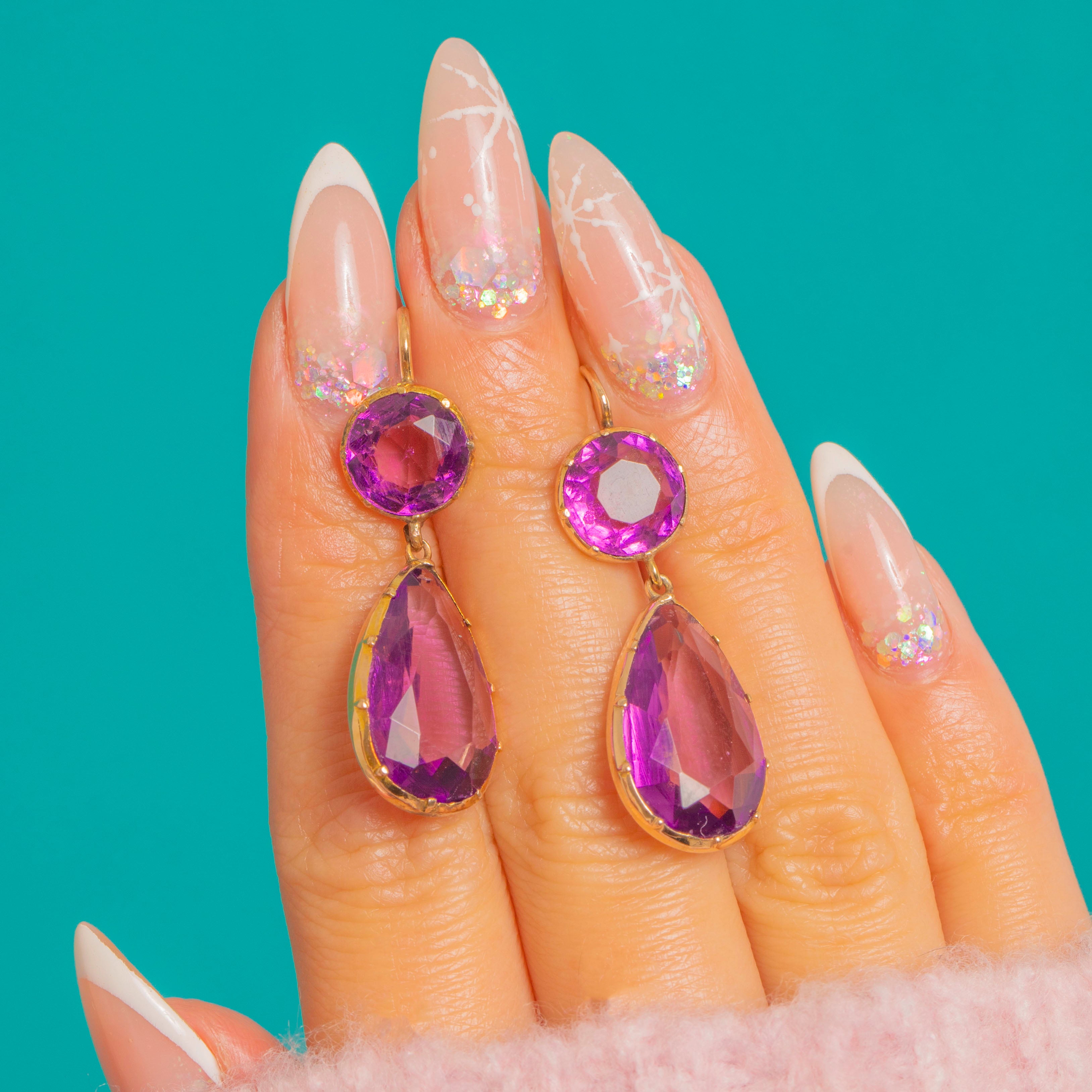 Hand-set in slim open-back crimped collet settings and finished with simple shepherd-hook fittings, they epitomise the refined minimalism of the period while delivering a striking hit of regal purple. Elegant, versatile and endlessly flattering, they’re a quintessential late-19th-century silhouette brought to life in luminous Amethyst.