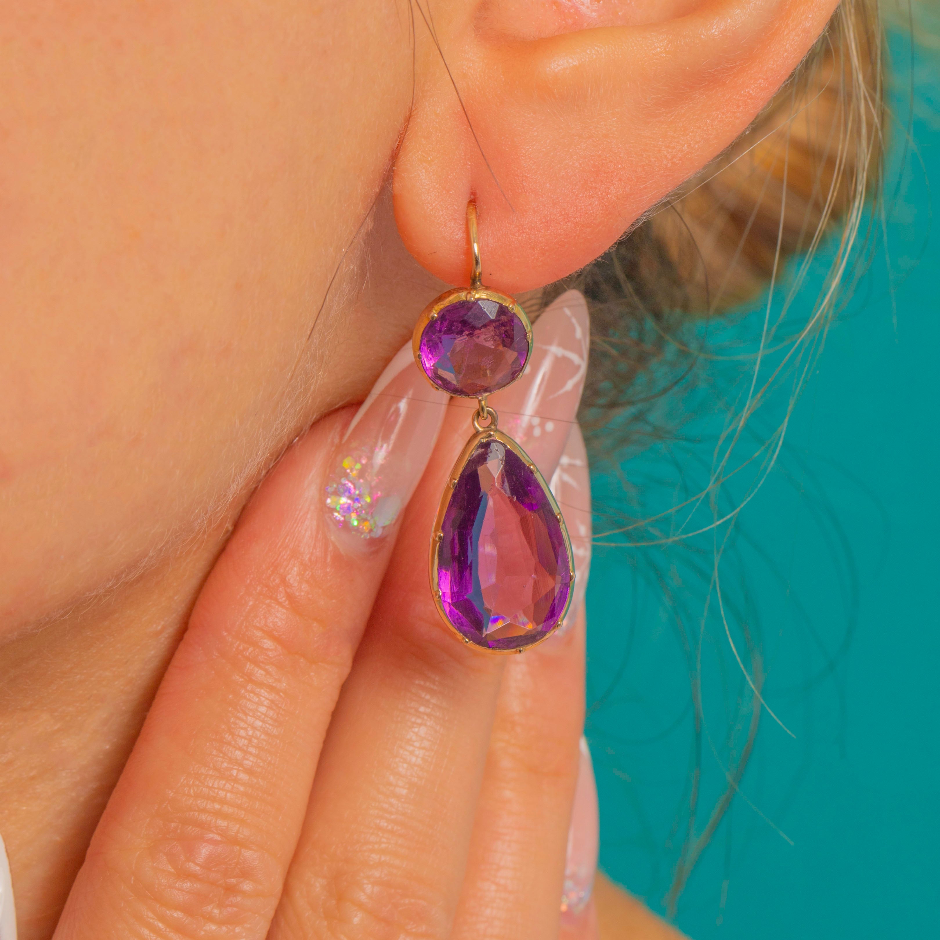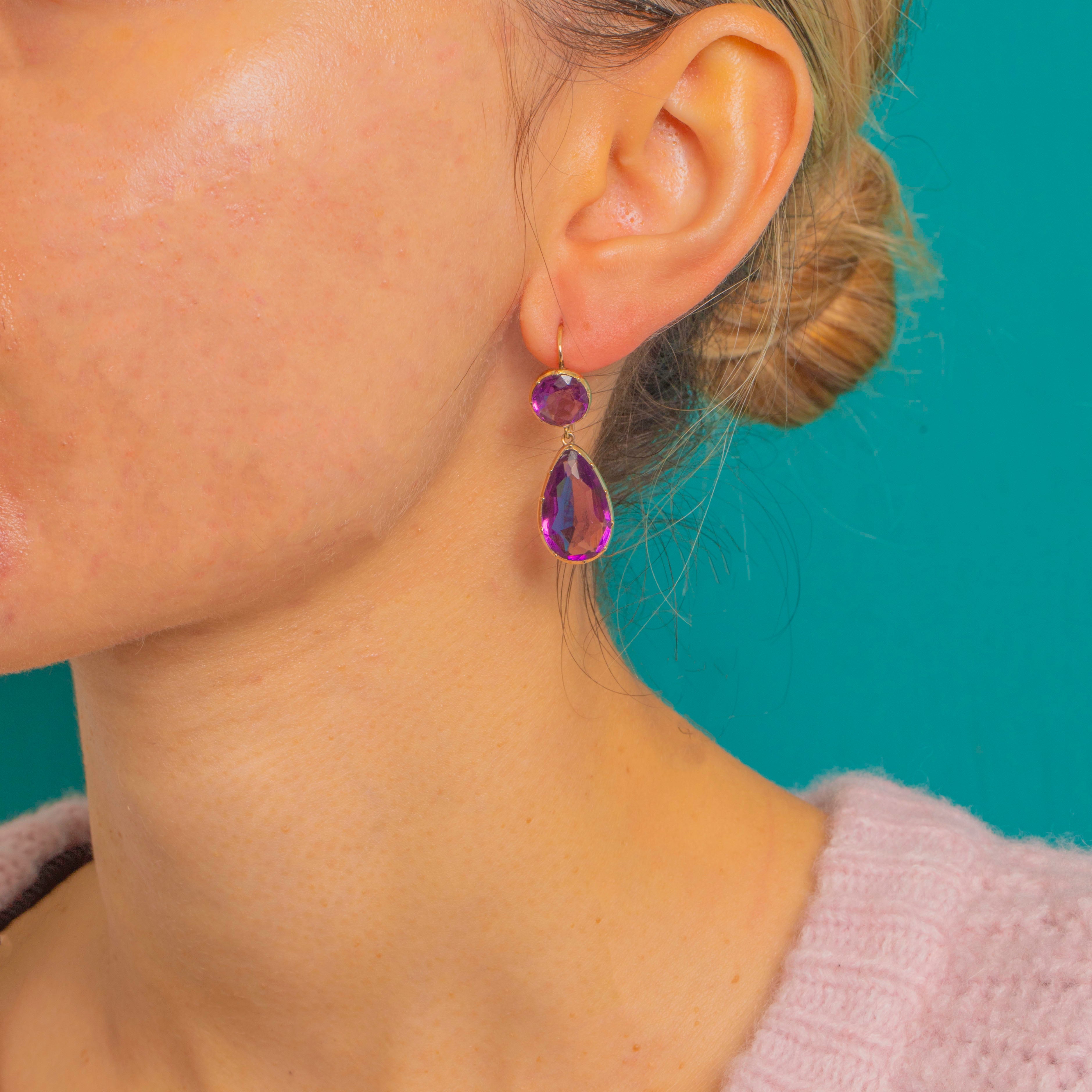 A timeless Victorian pairing of saturated purple Amethyst and buttery 15ct Gold, these articulated double drops are all about colour, clarity and graceful movement. Each earring showcases a lively round Amethyst surmount flowing to a larger pear-cut drop below, the two linked to dance with every step.