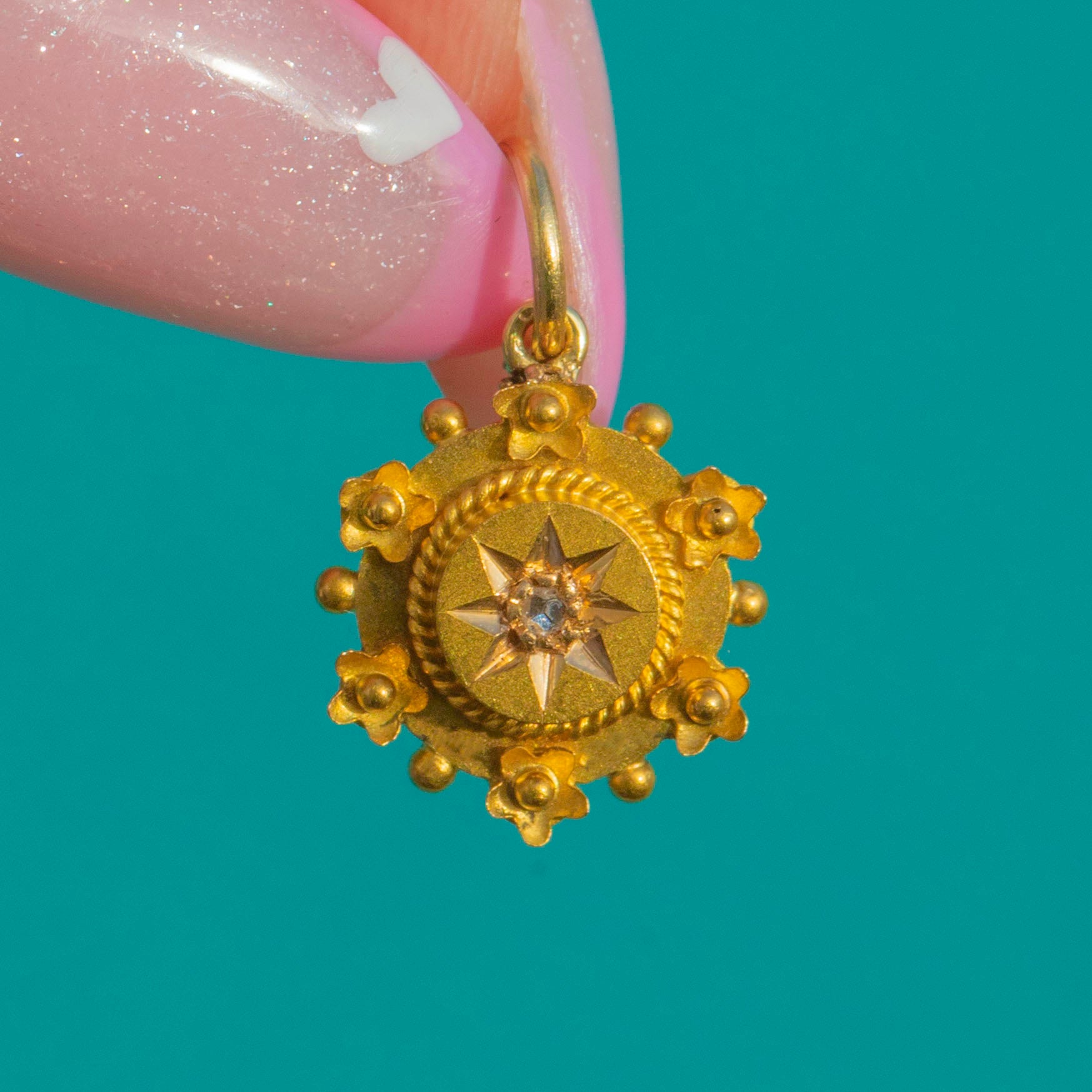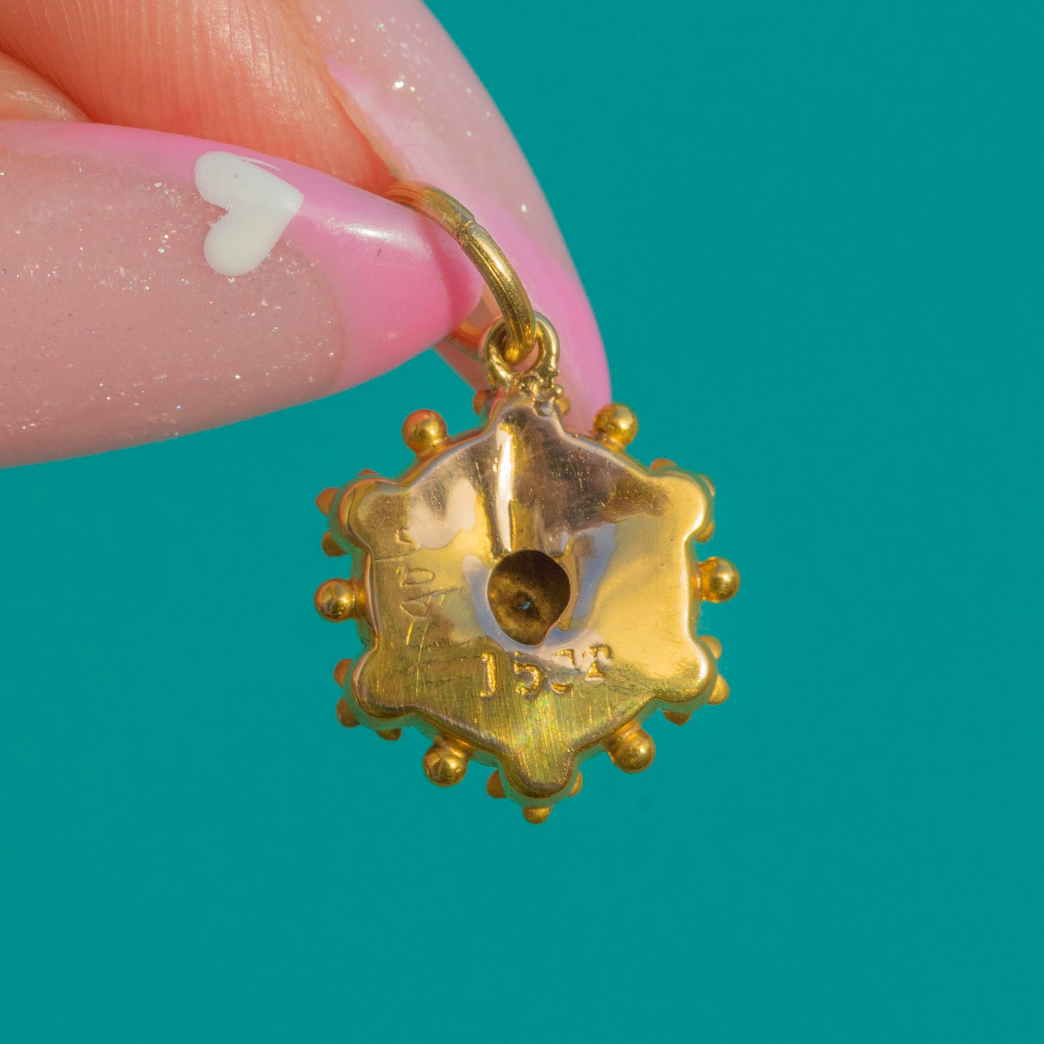 This charming Victorian Etruscan revival snowflake charm is beautifully crafted in rich 15ct Gold, showcasing the fine granulation and symmetry typical of the period.