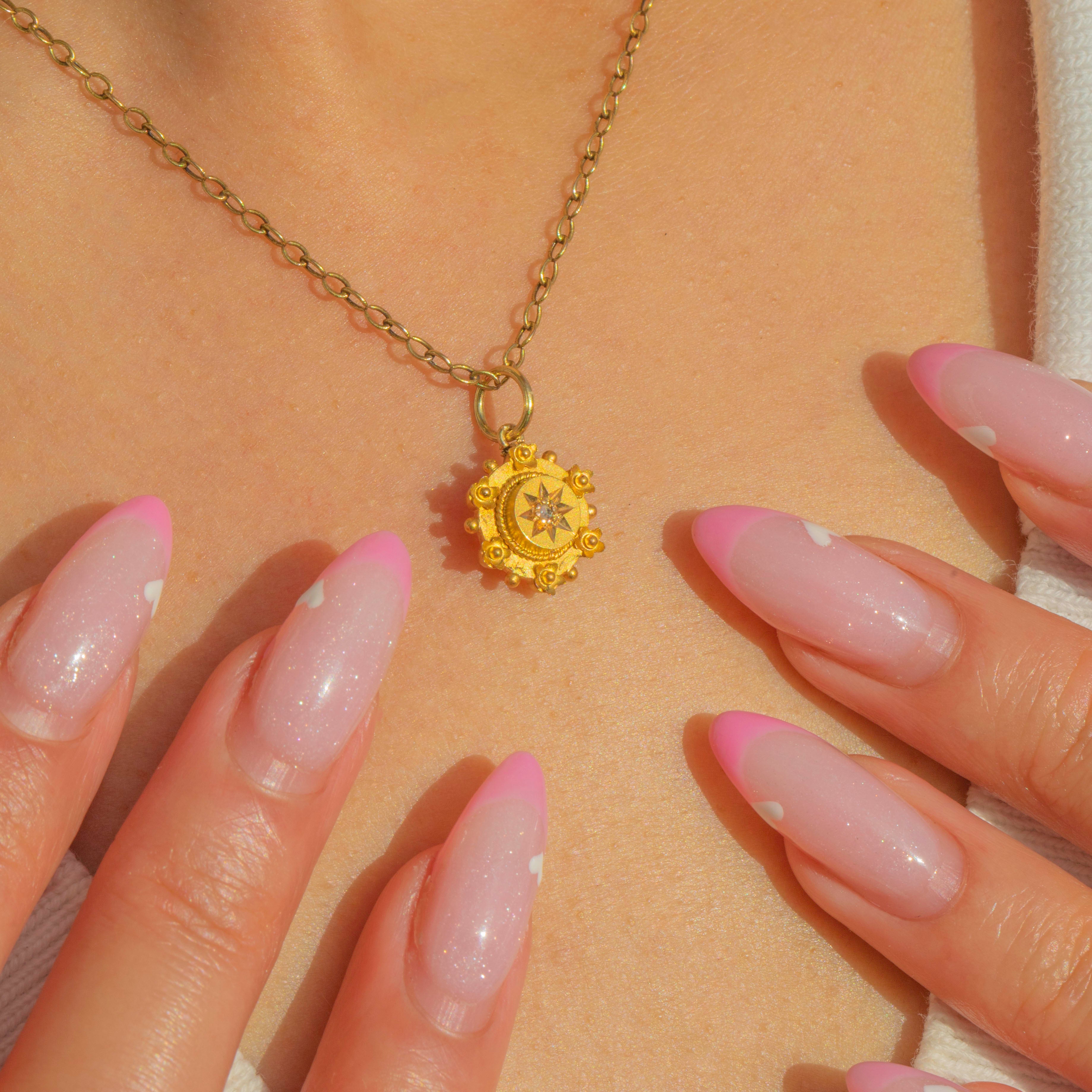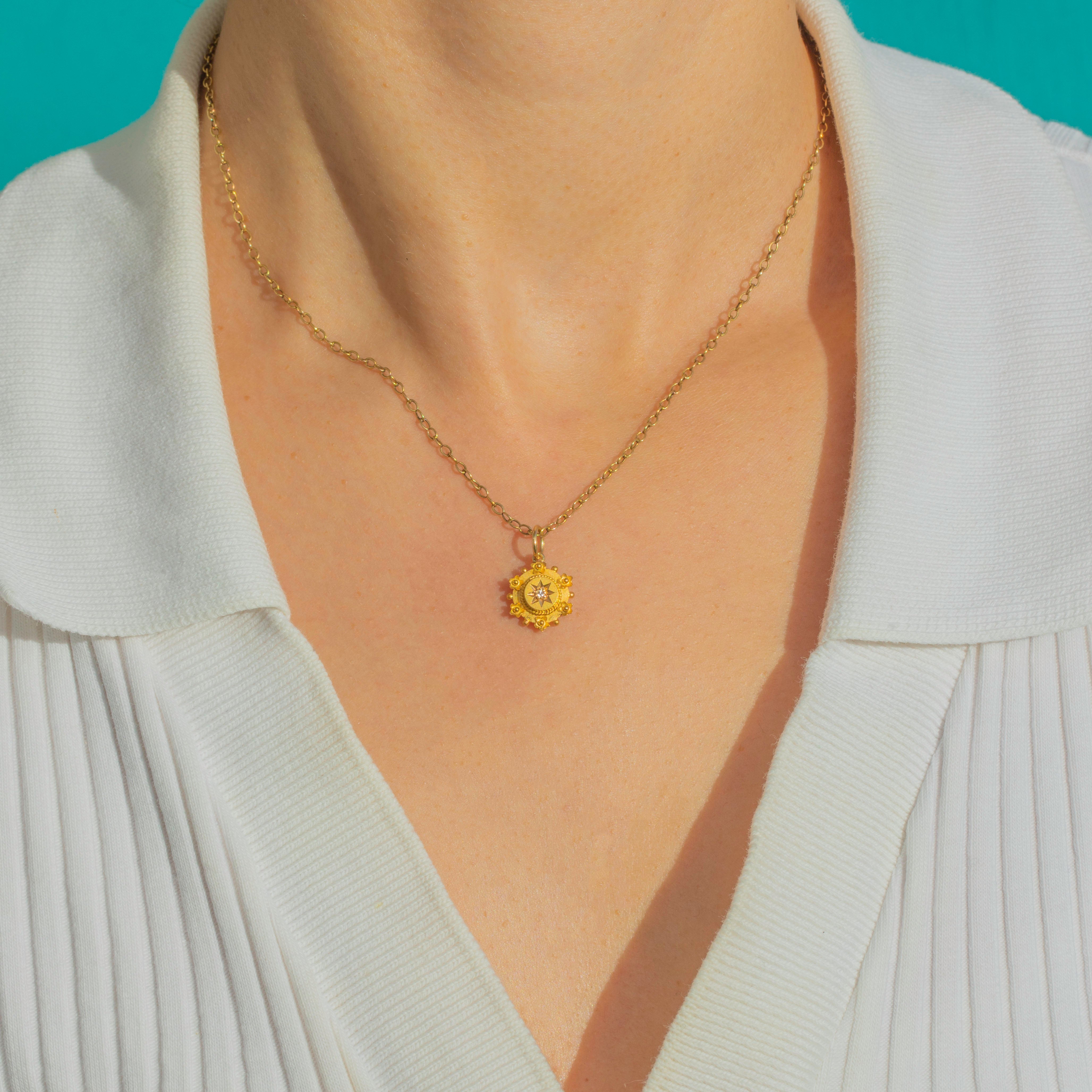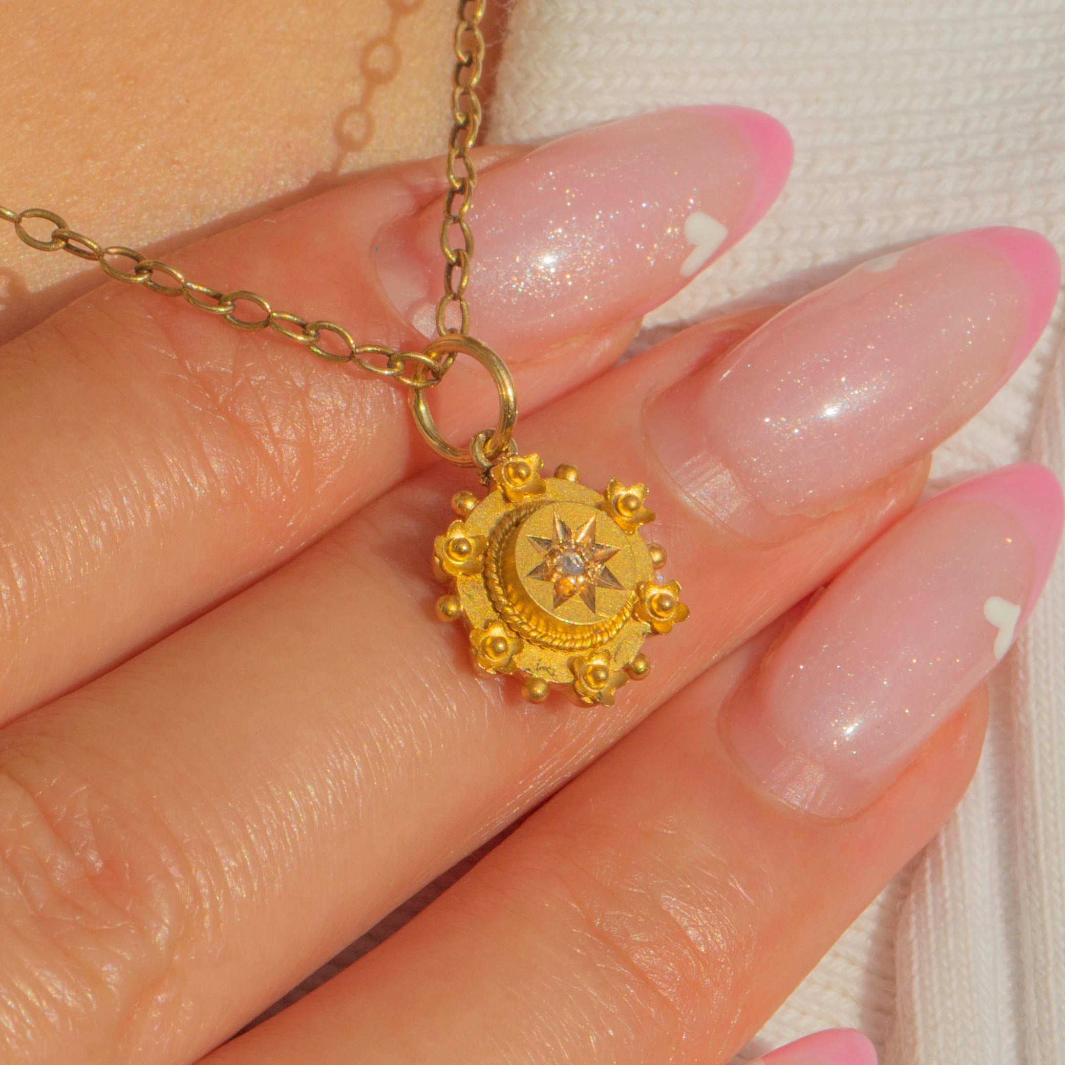 At its centre glitters a single Diamond, adding a delicate sparkle to the warm antique Gold. Once a stick pin, this piece has been carefully converted into a wearable charm, preserving its original detail and timeless allure.
