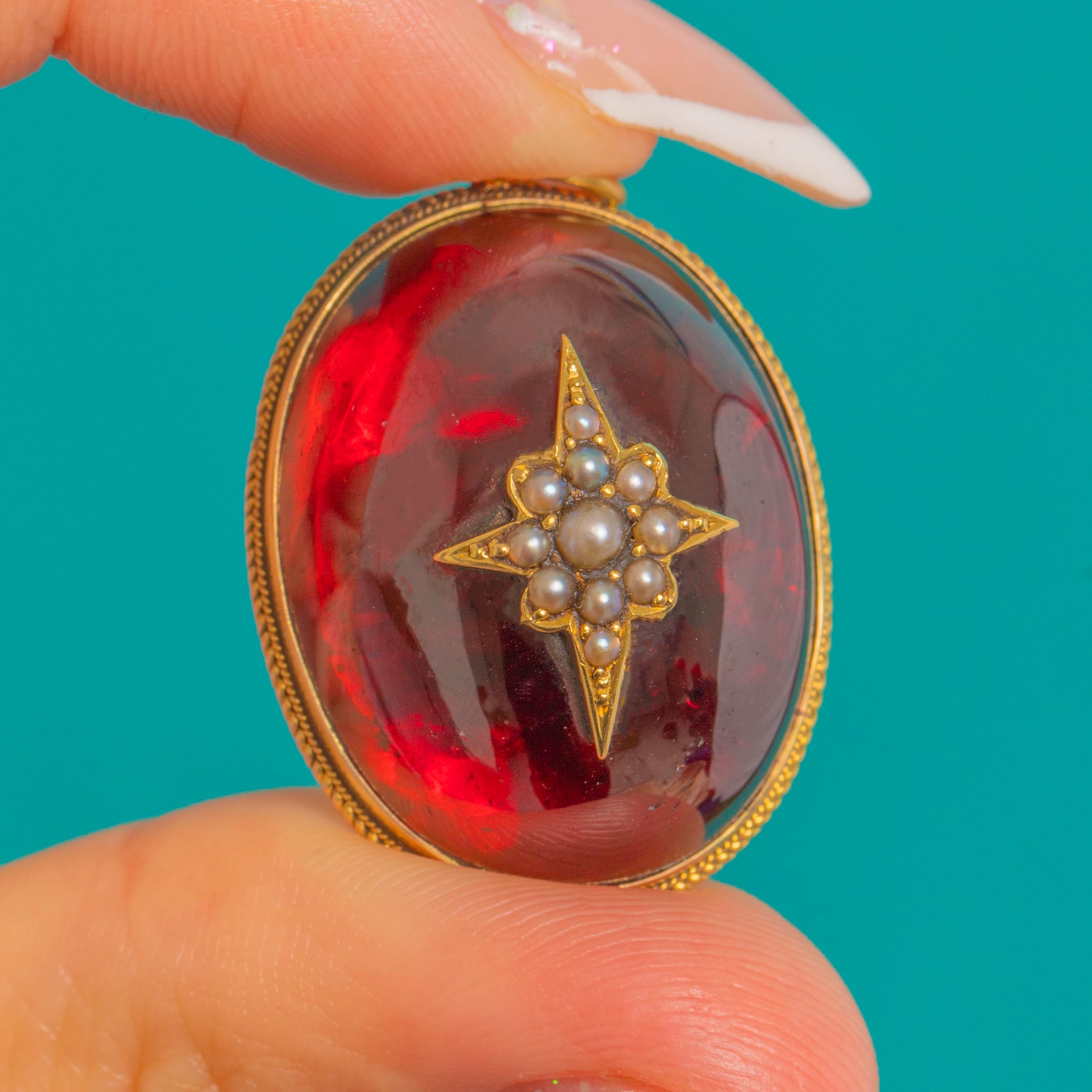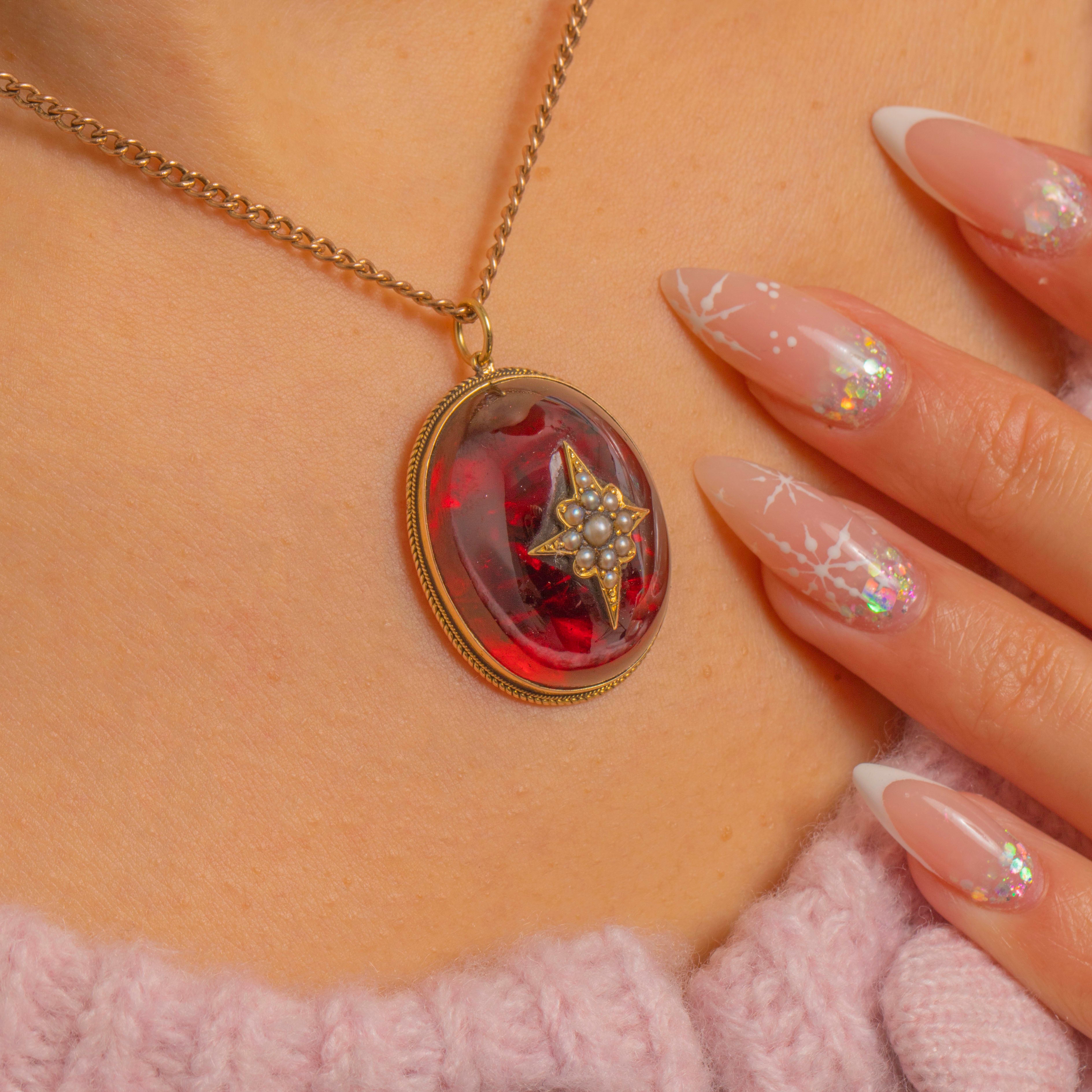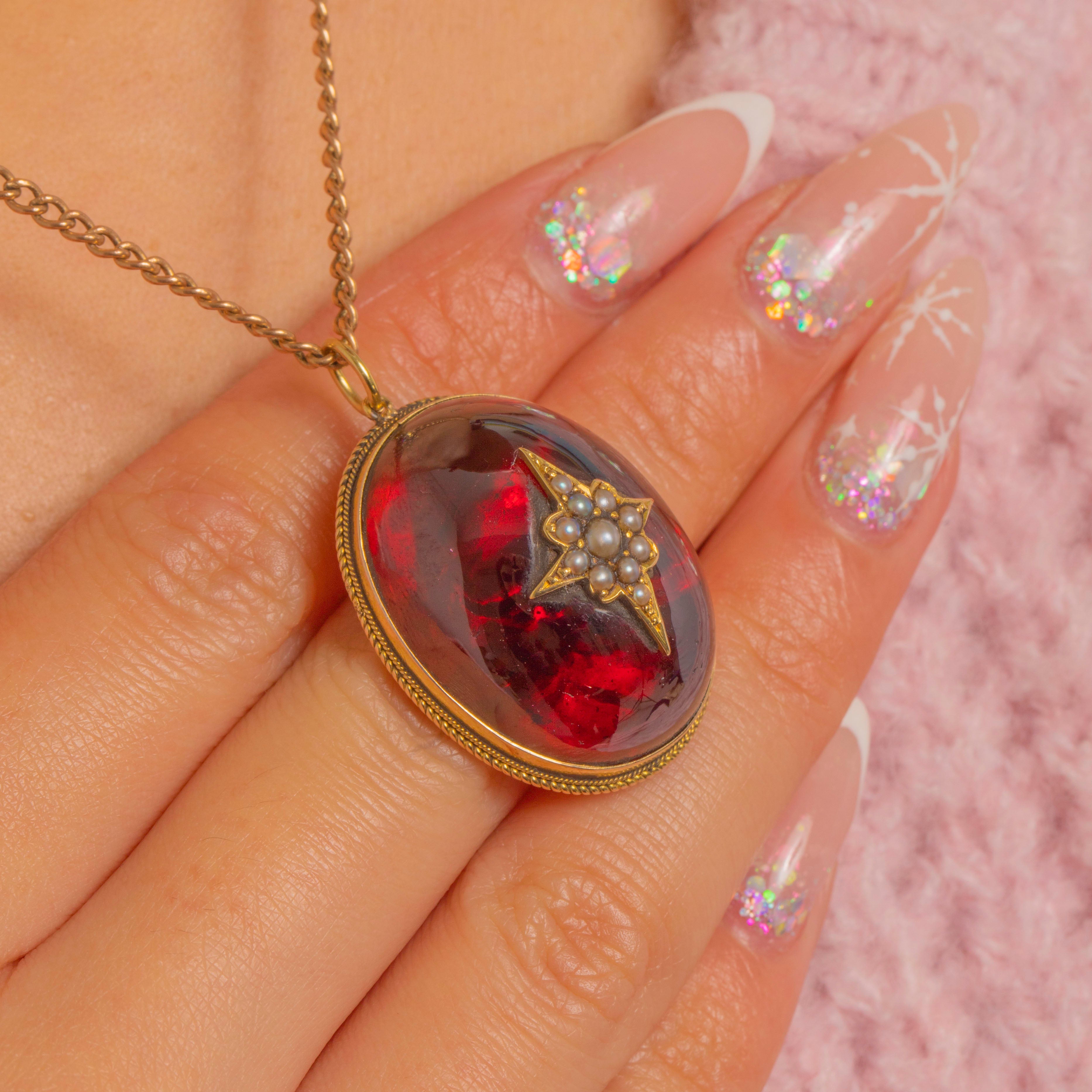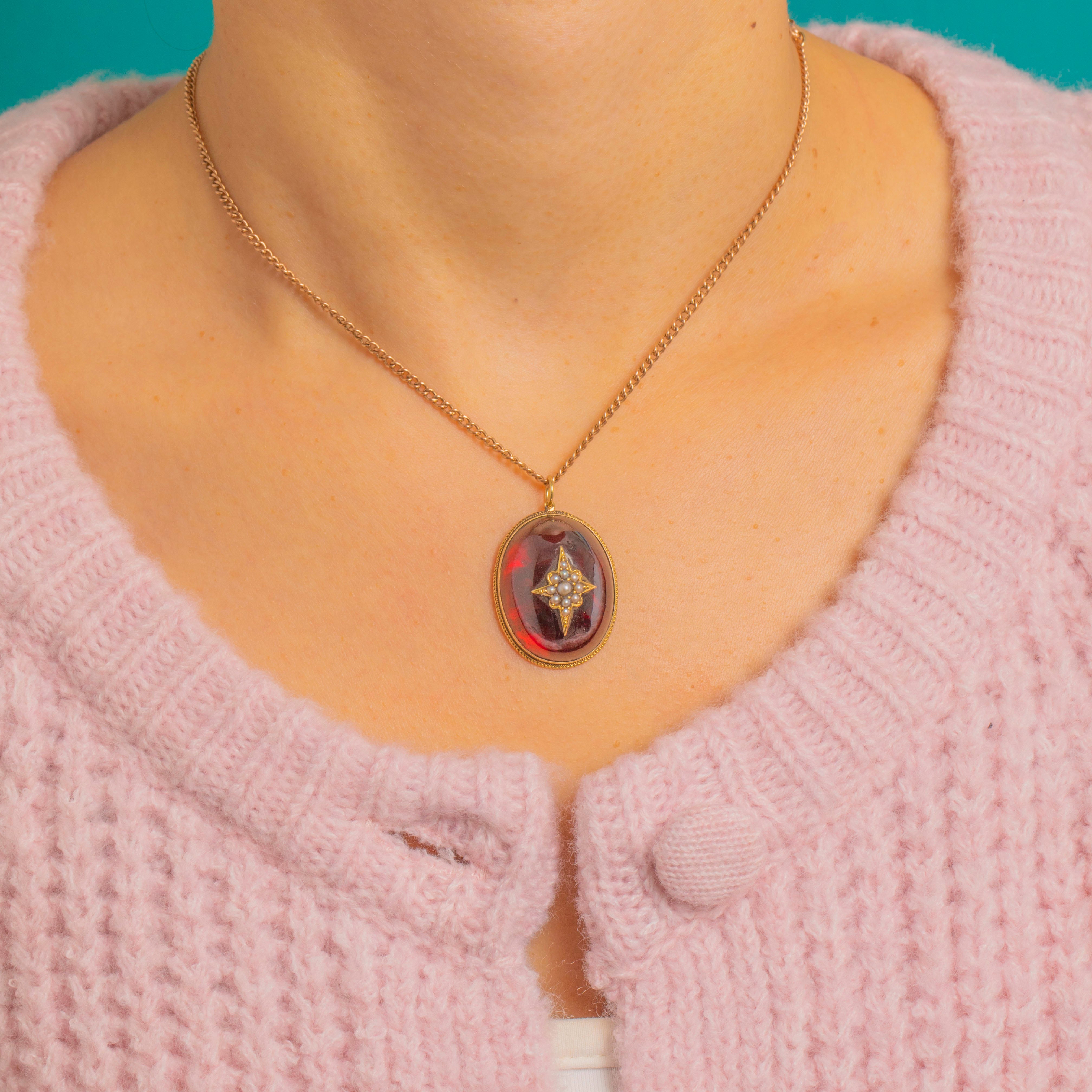 A glorious Victorian pendant in 15ct Gold, crowned with a high-domed deep red Garnet cabochon and a shimmering star set with creamy Seed Pearls. The smooth bezel is framed by a delicate rope border, bringing beautiful texture and depth to the rich, glowing hue of the Garnet.
