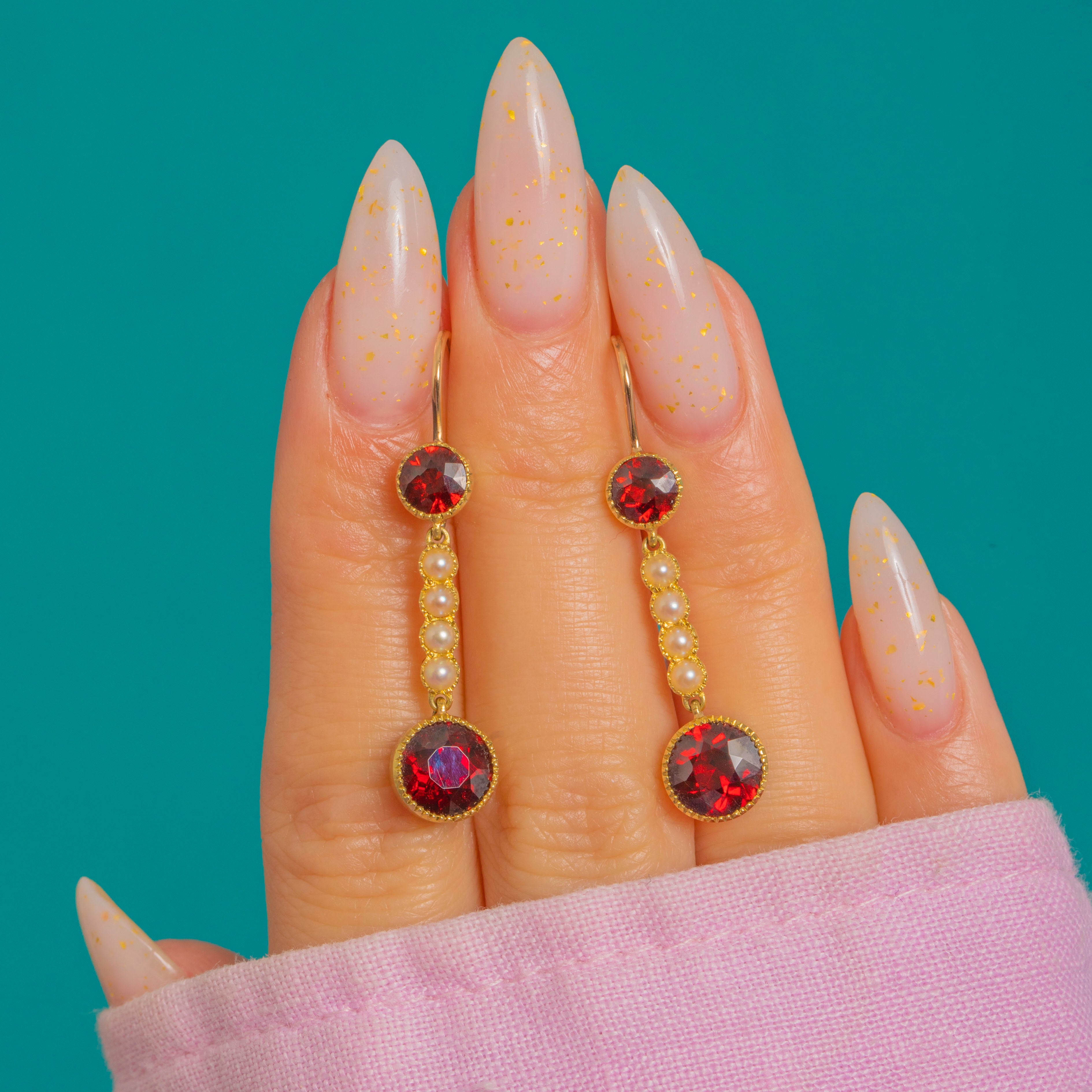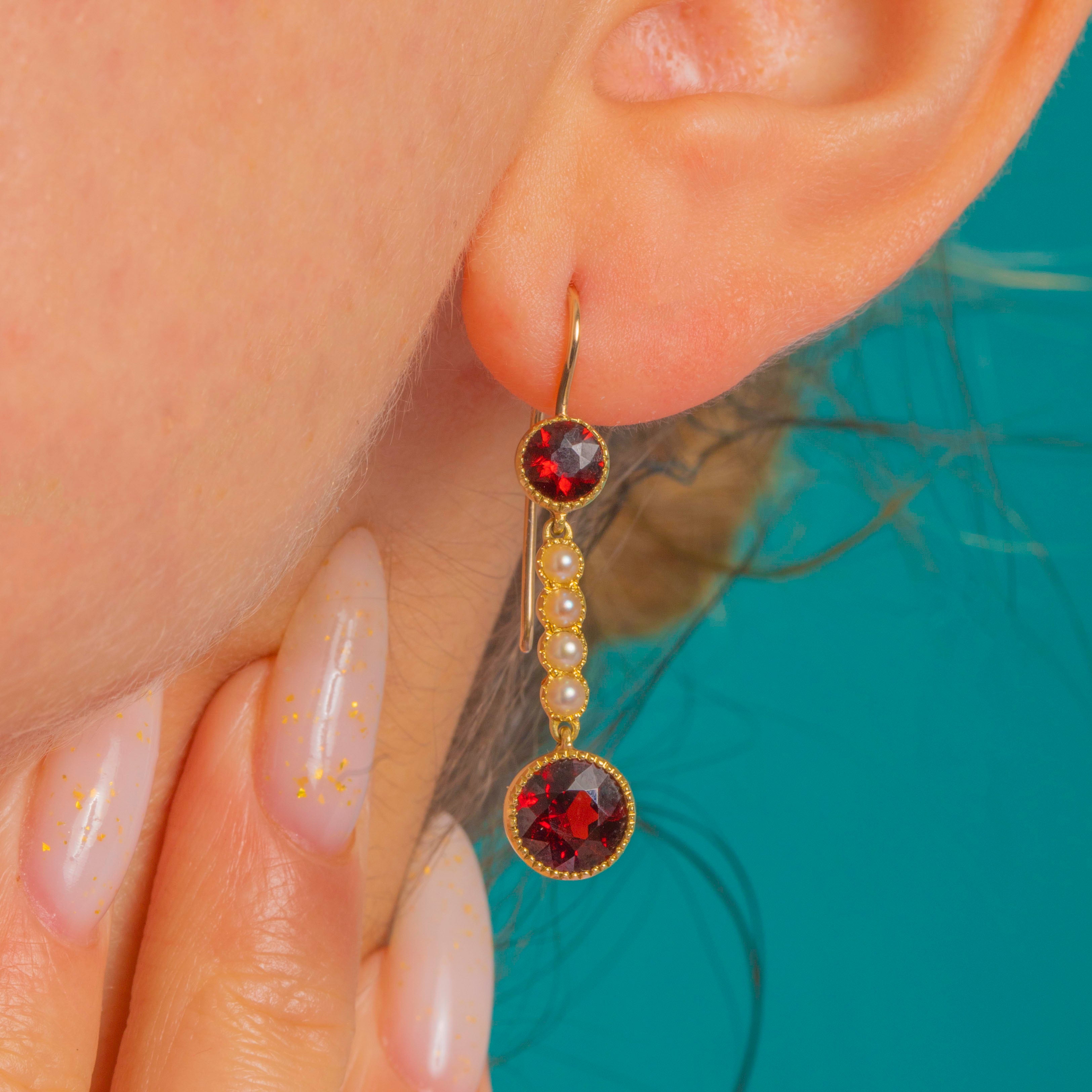 A graceful Victorian pair of articulated drop earrings, crafted in rich 15ct Gold and set with deep red round Garnets punctuated by a slender vertical line of creamy Seed Pearls. The design is beautifully balanced: a petite Garnet sits above the seed Pearl bar, leading the eye to a larger Garnet below, each stone framed by fine beaded, milgrain-edged collet settings that add delicate texture and antique charm.