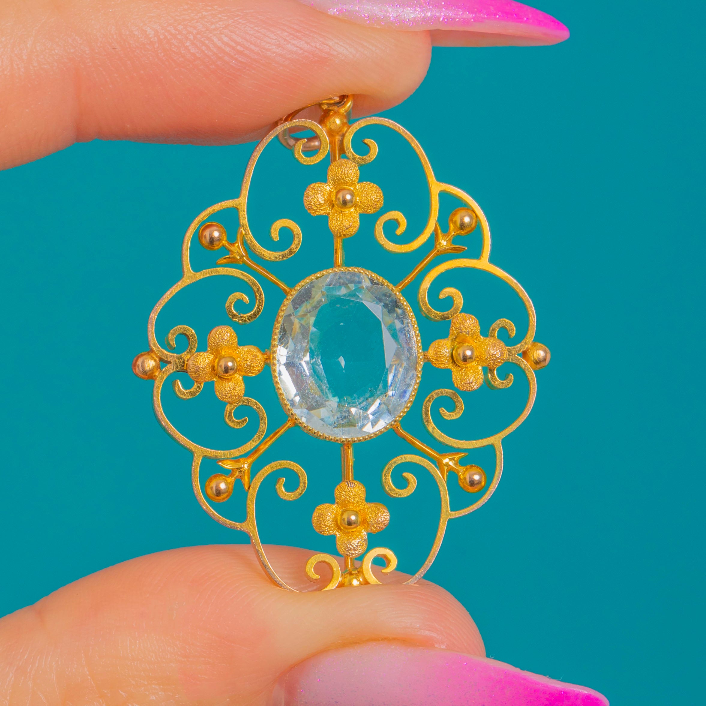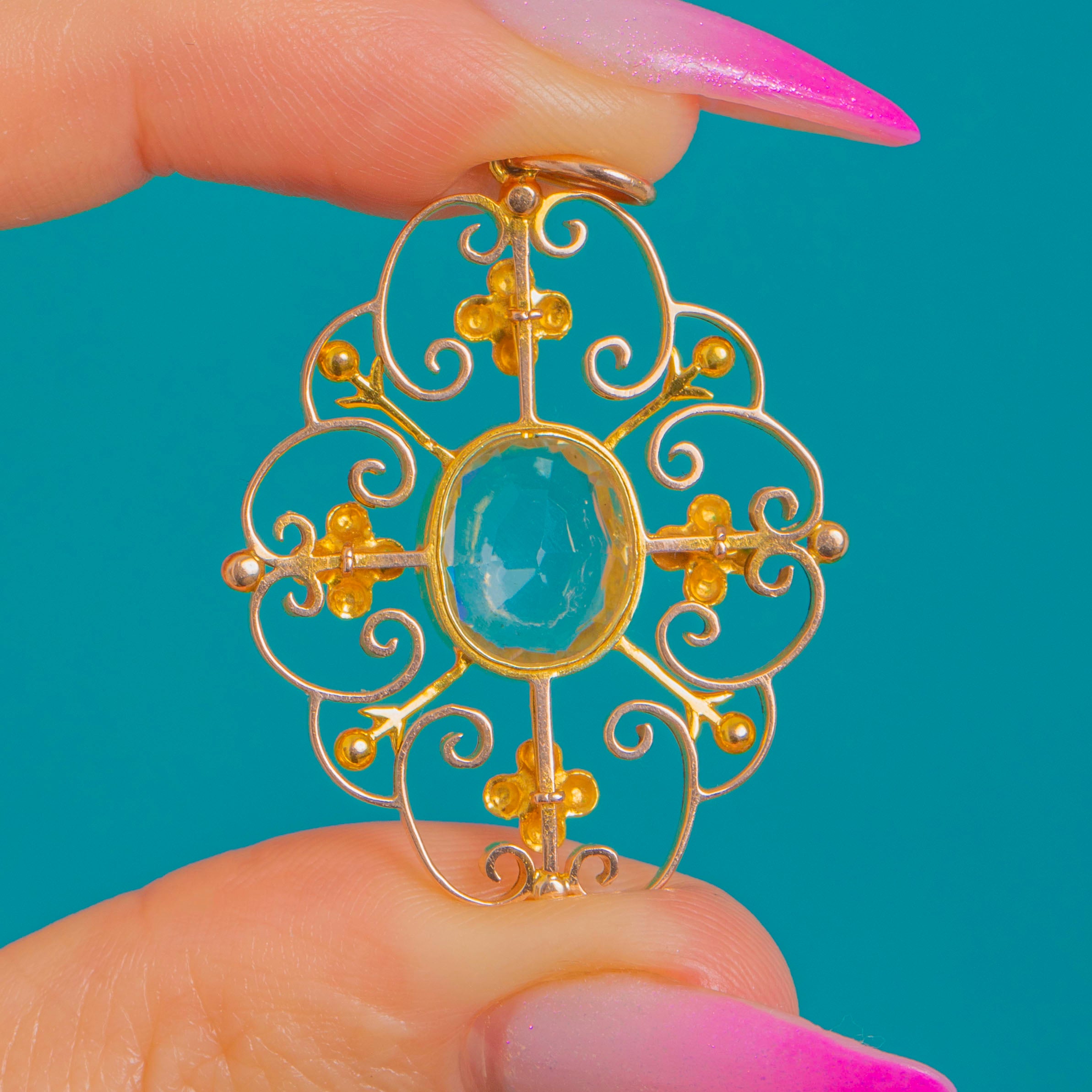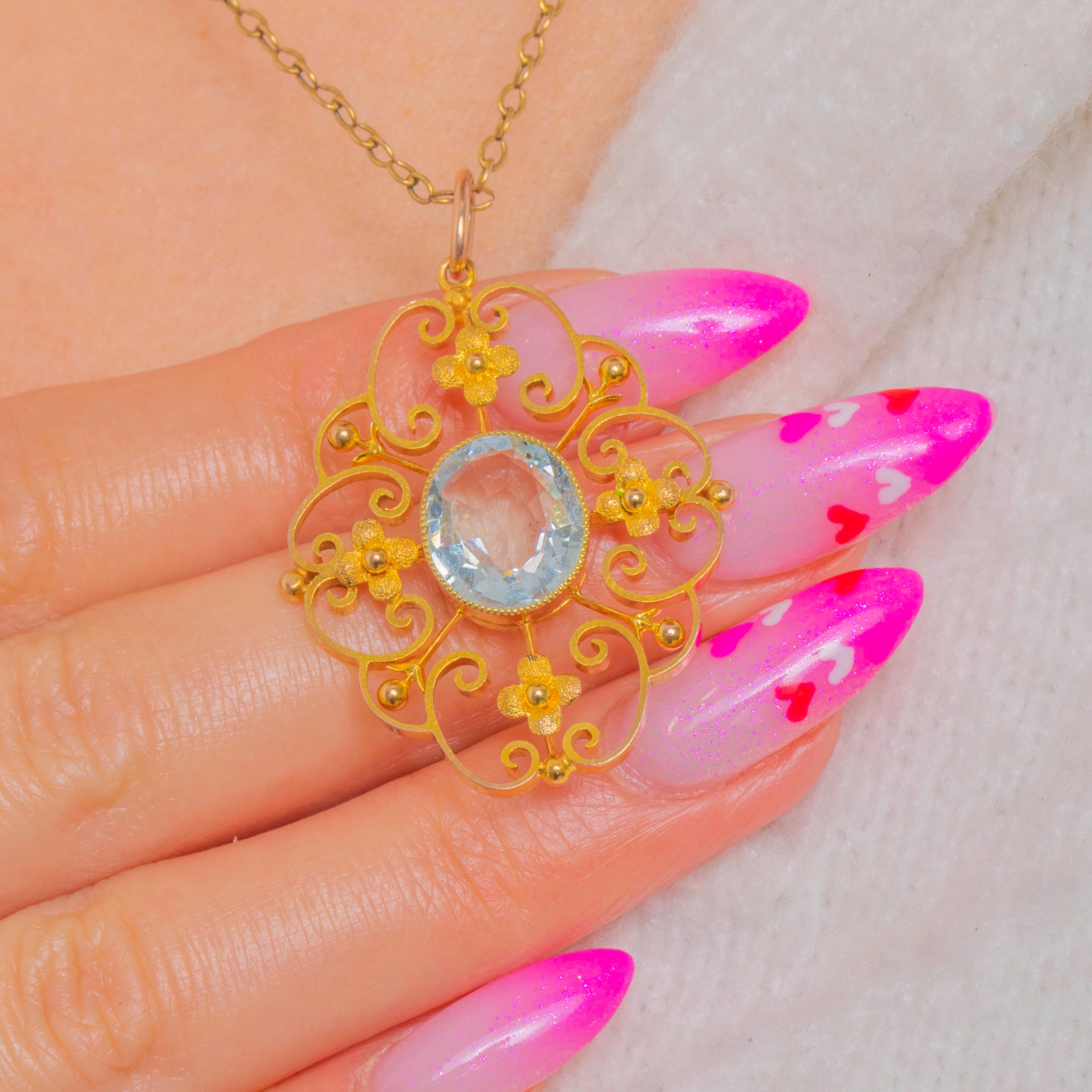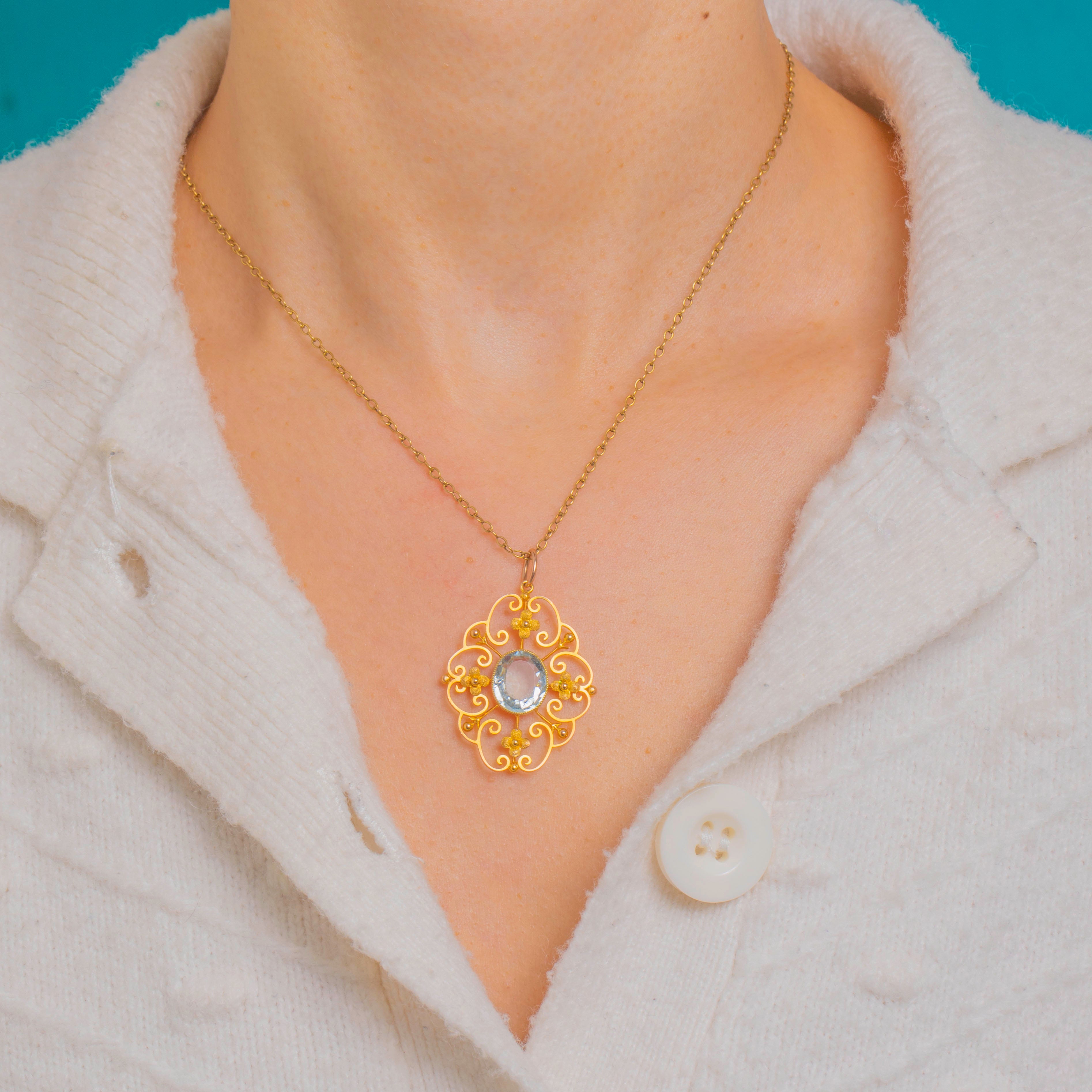 A lace-like Edwardian openwork pendant crafted in rich 15ct Gold, centred with a pale blue Aquamarine of approximately 2.15ct. The oval gem rests in a raised milgrain-edged bezel, its cool aqua glow beautifully offset by the warmth of the Gold.