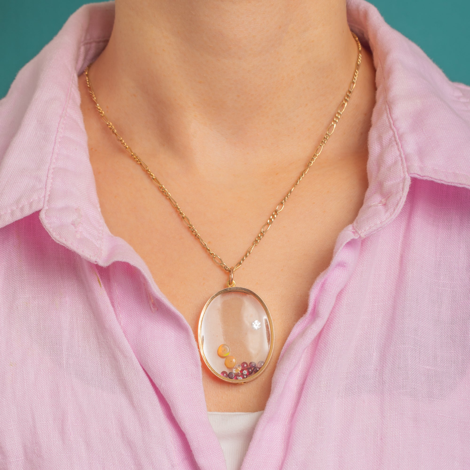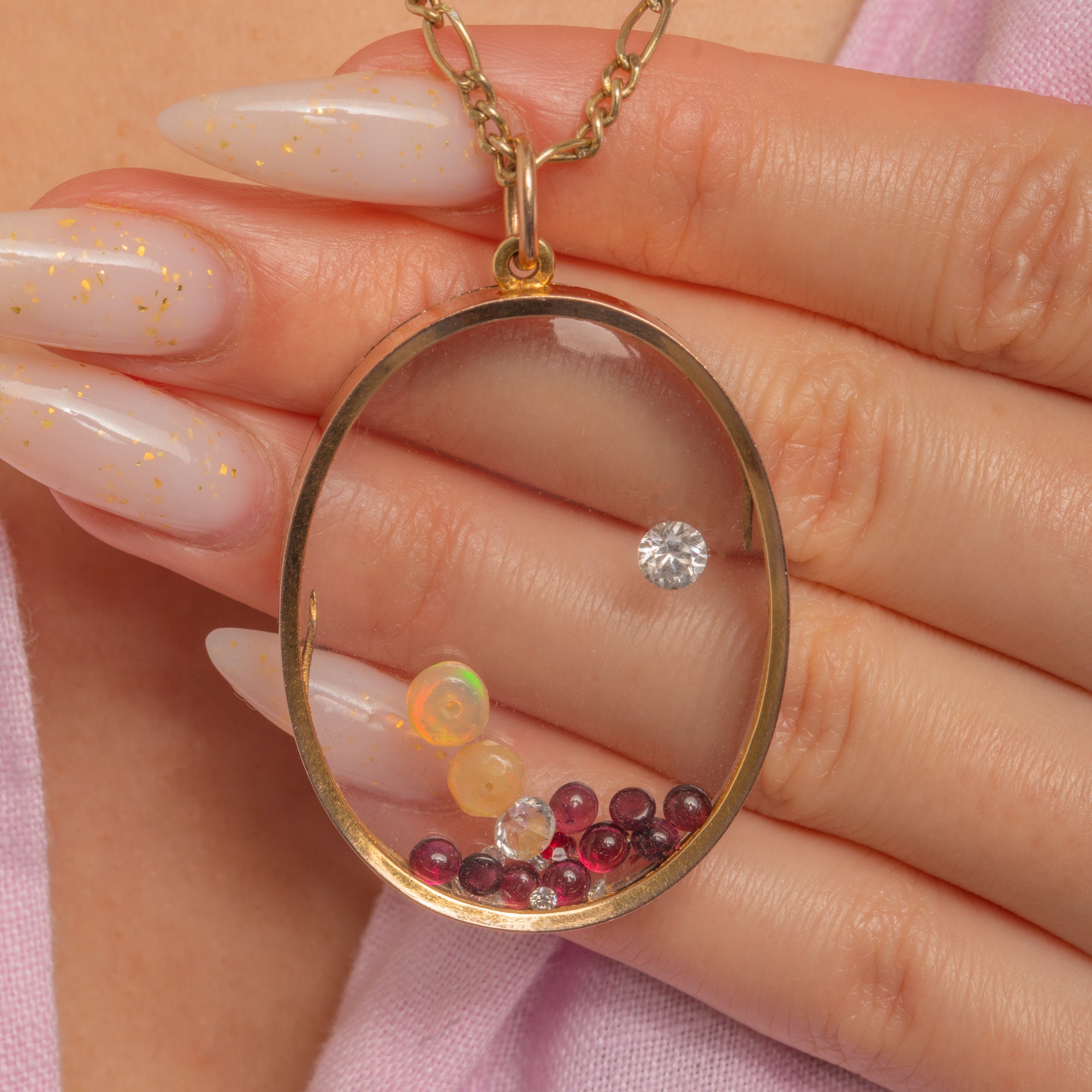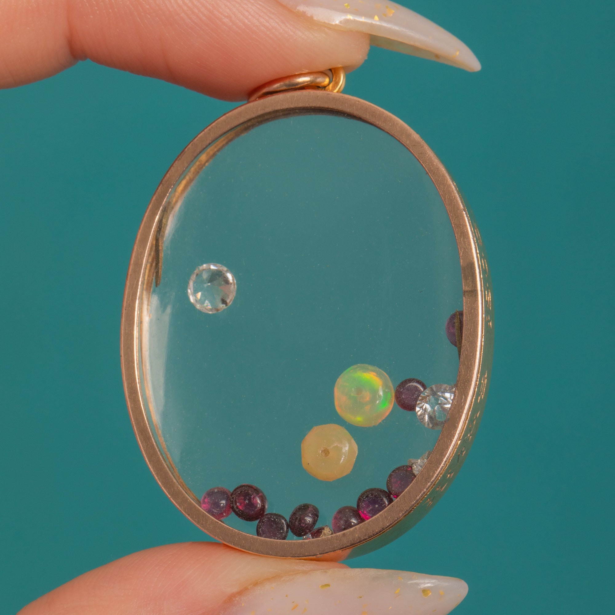A luminous Edwardian shaker locket crafted in rich 15ct Gold, this oval jewel frames two clear glass panels that create a gleaming window for its free‑moving treasures. Inside, loose round brilliant natural Diamonds mingle with glowing Opals and vivid red Garnets, dancing with every movement for a playful confetti effect within a sleek, polished bezel.
