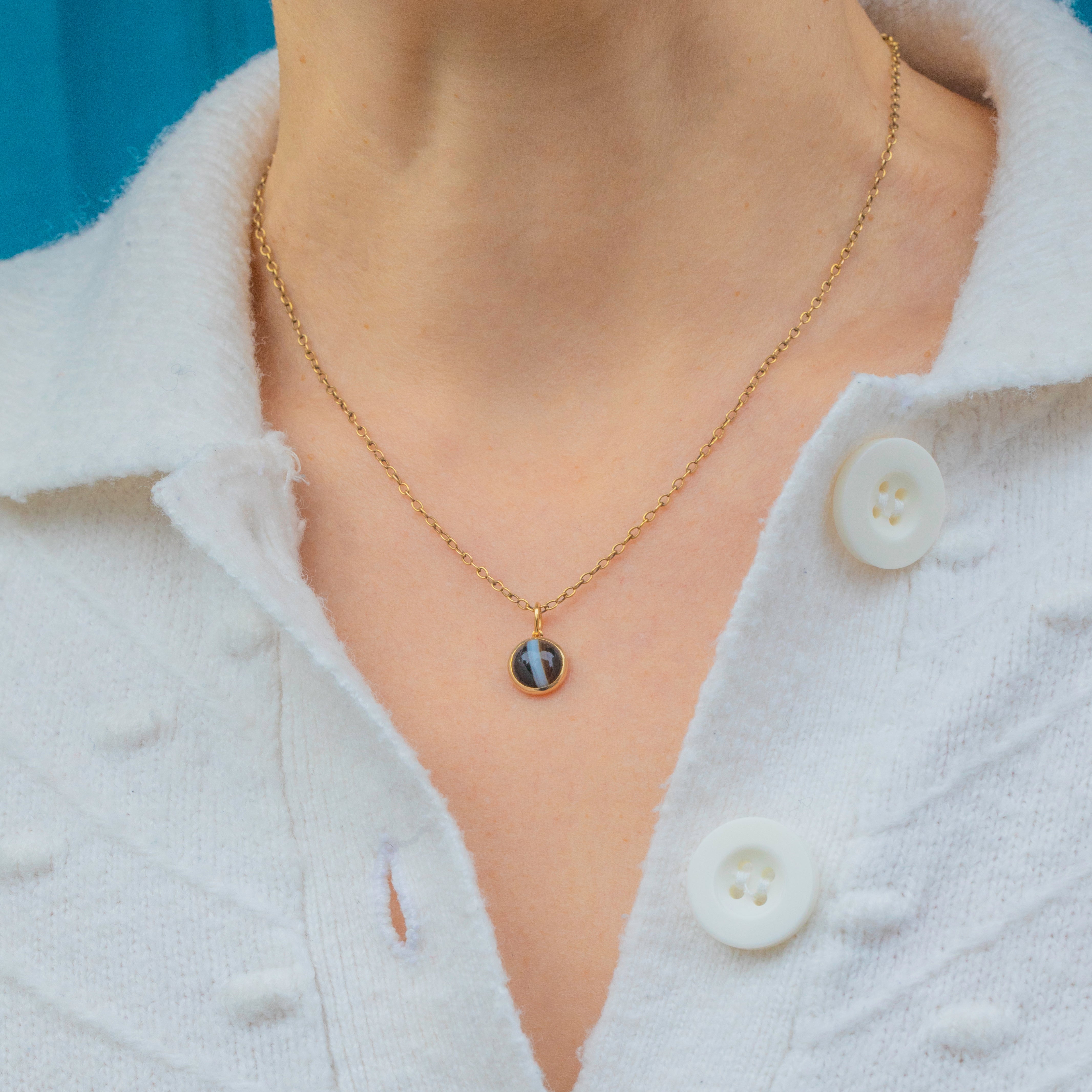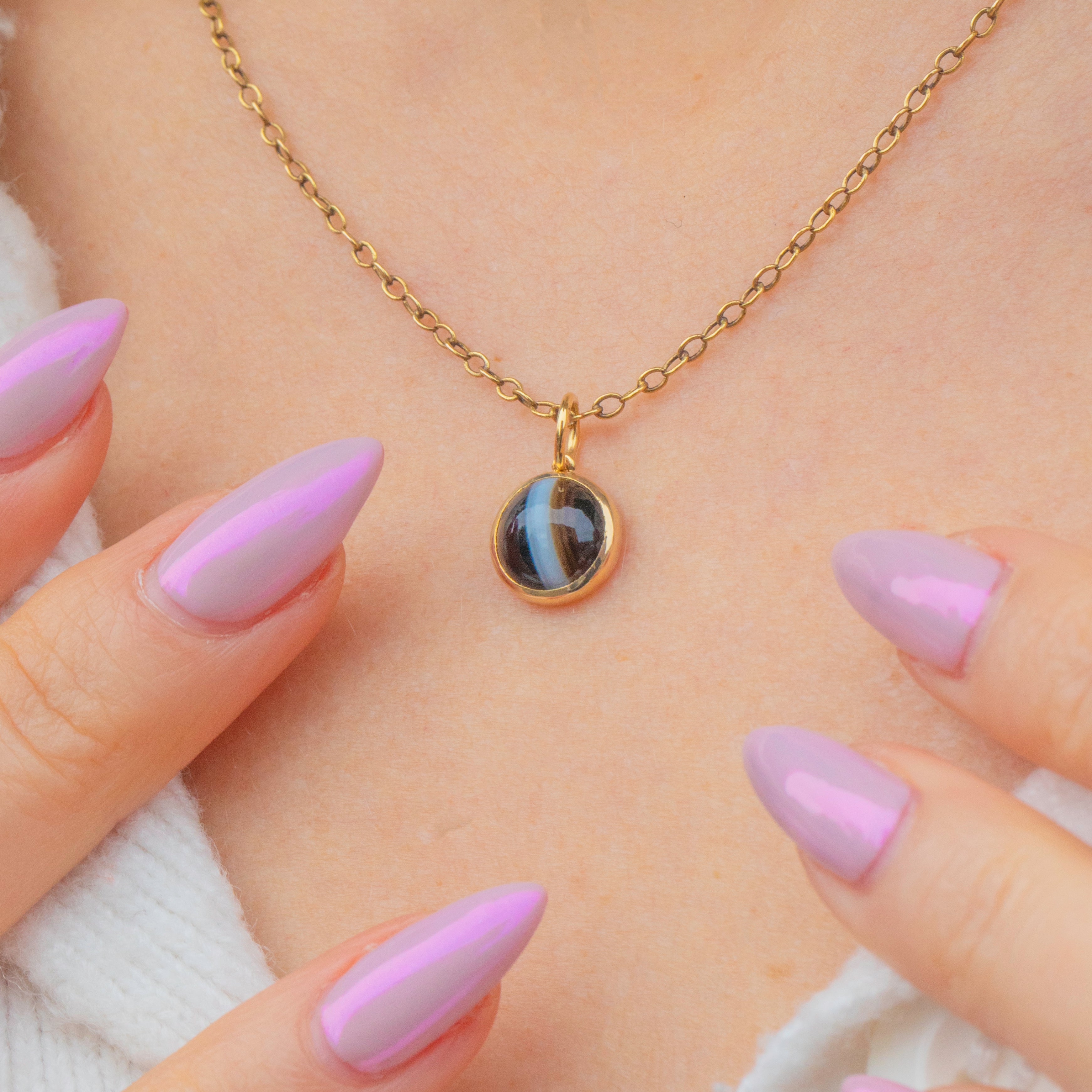 A charming Antique Victorian dress charm set with a beautifully banded Agate in warm 15ct Gold, with the glossy cabochon displays distinct natural stripes in rich tones of caramel, cream and deep chocolate.