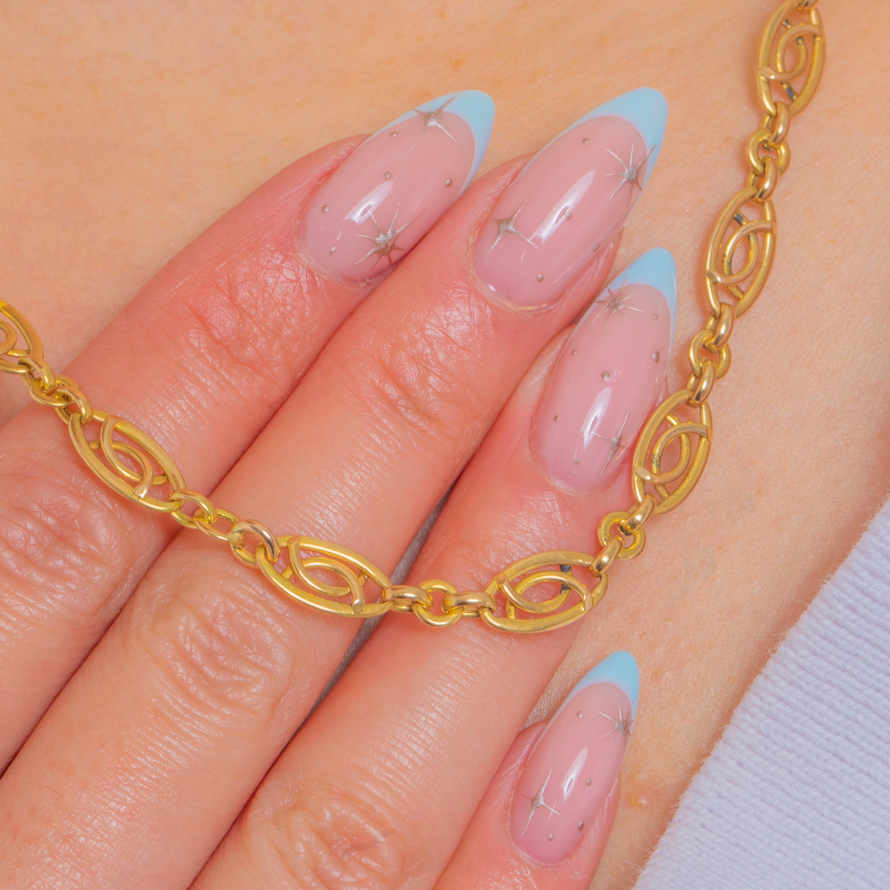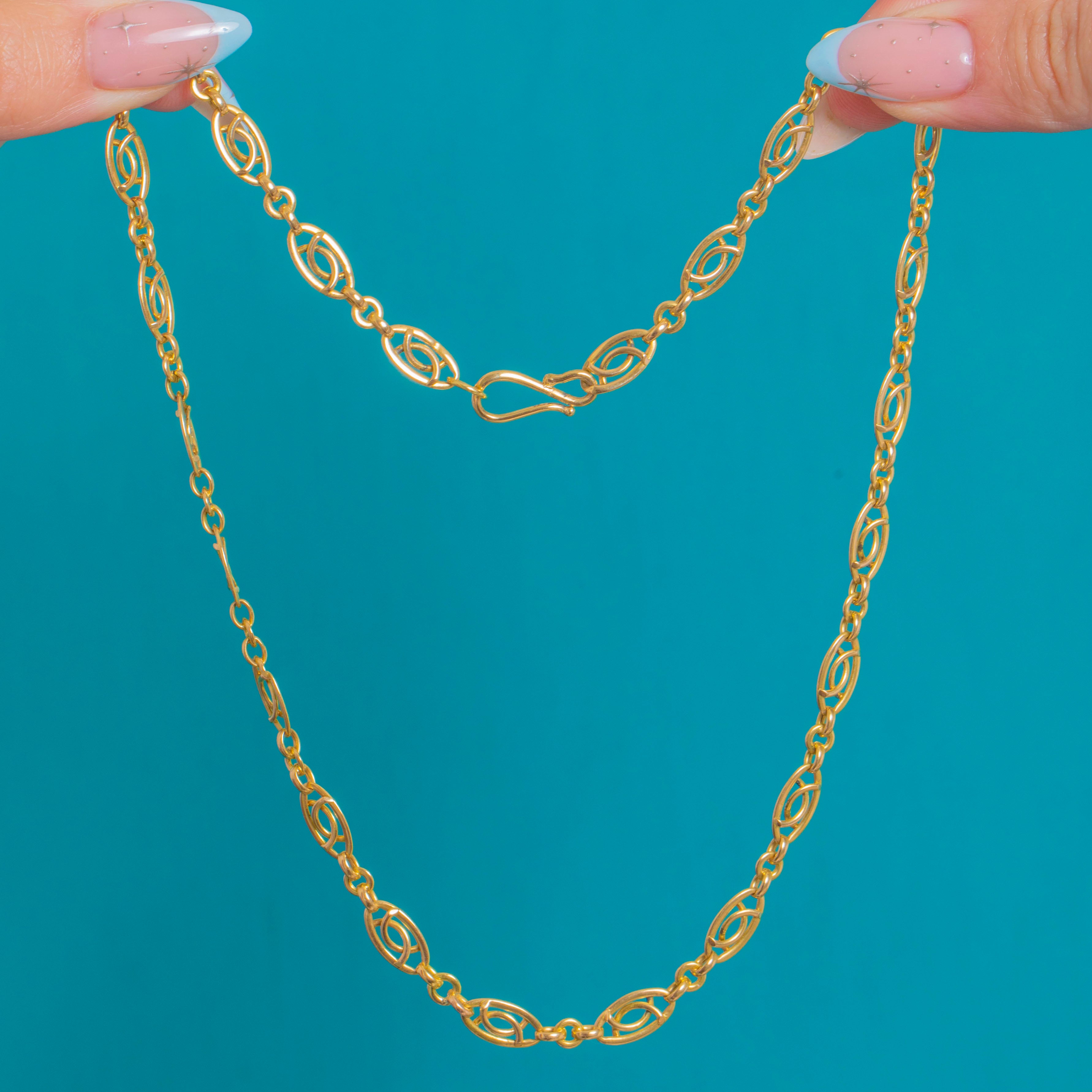 Elegant and refined, this Late Victorian French 18ct Gold fancy-link chain showcases a beautiful rhythm of openwork navette “eye” links that read as a subtle infinity motif. The warm glow of antique Gold and the clean geometry give this necklace a quietly luxurious presence that sits beautifully at the collarbone.