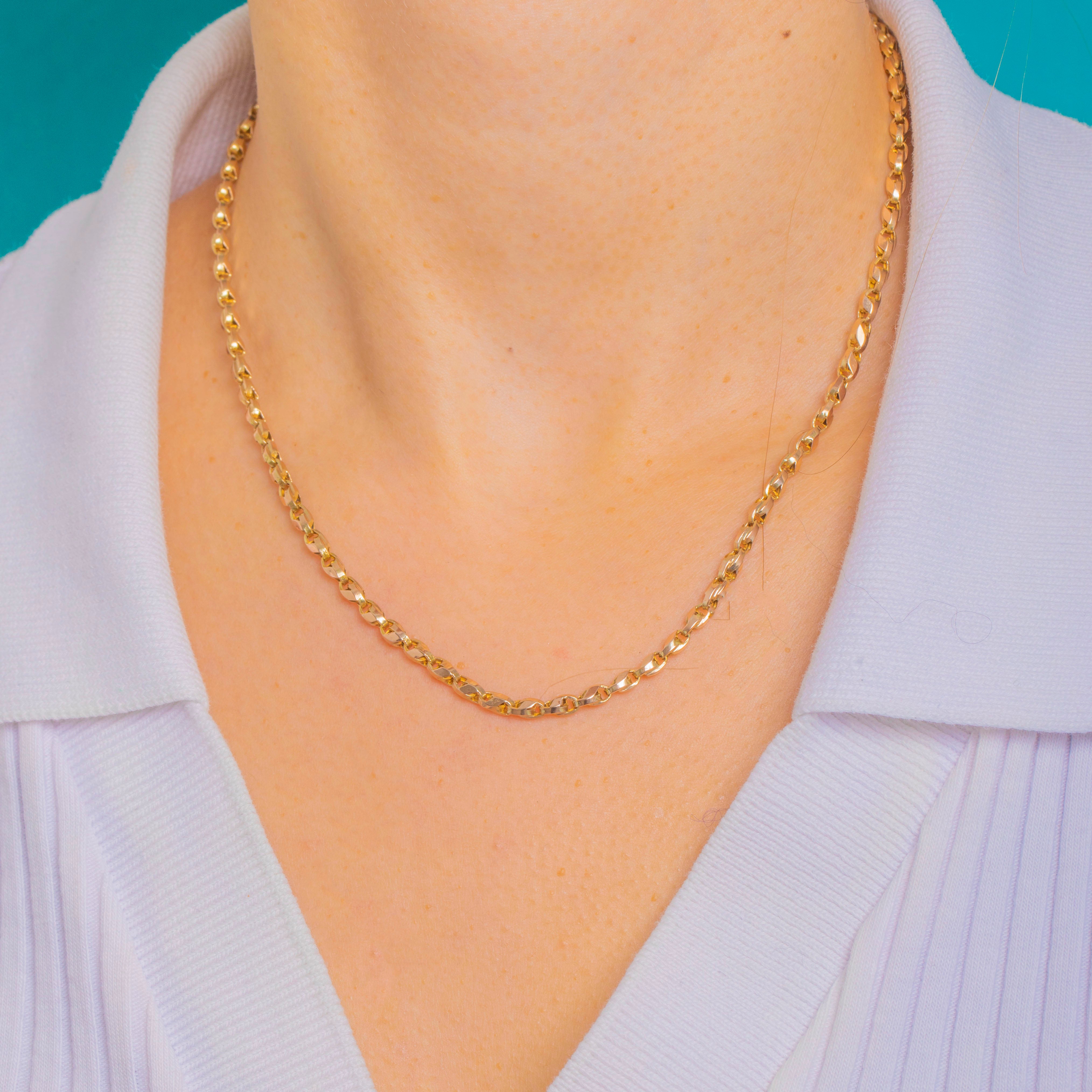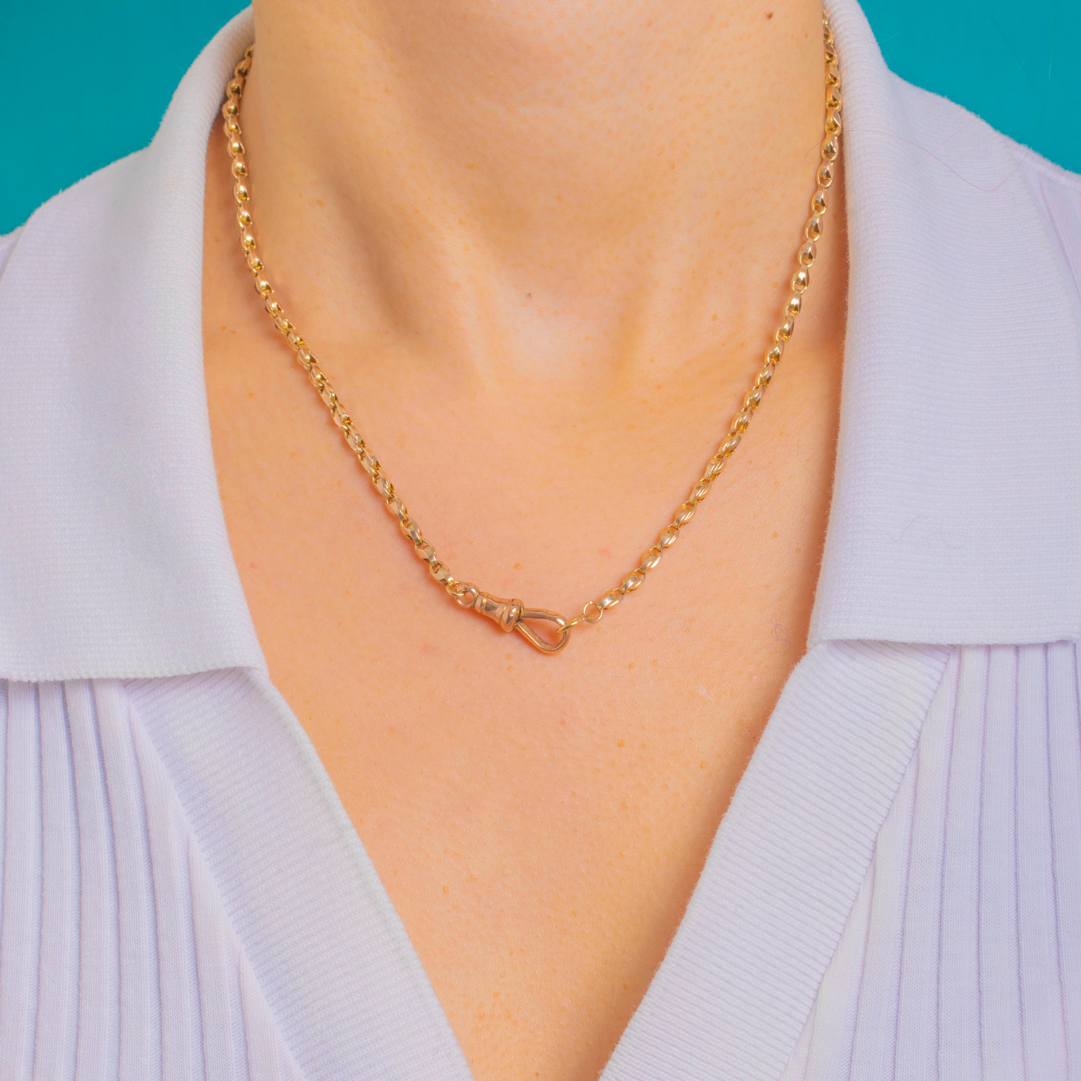 This Victorian 9ct Gold Tulip chain is a timeless classic, rendered in warm yellow Gold with beautifully faceted, uniform links that twinkle as they move. Finished with a generous dog clip, it channels the refined utility of an antique watch chain in a necklace length that sits elegantly at the collarbone.