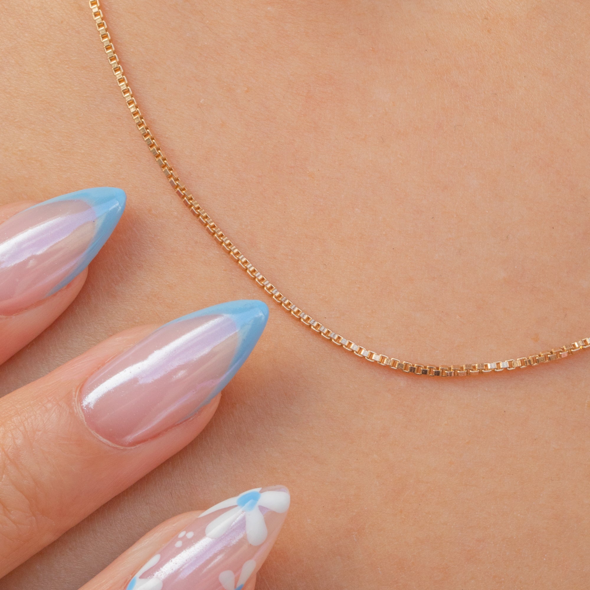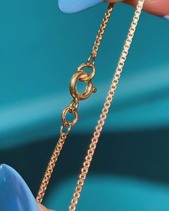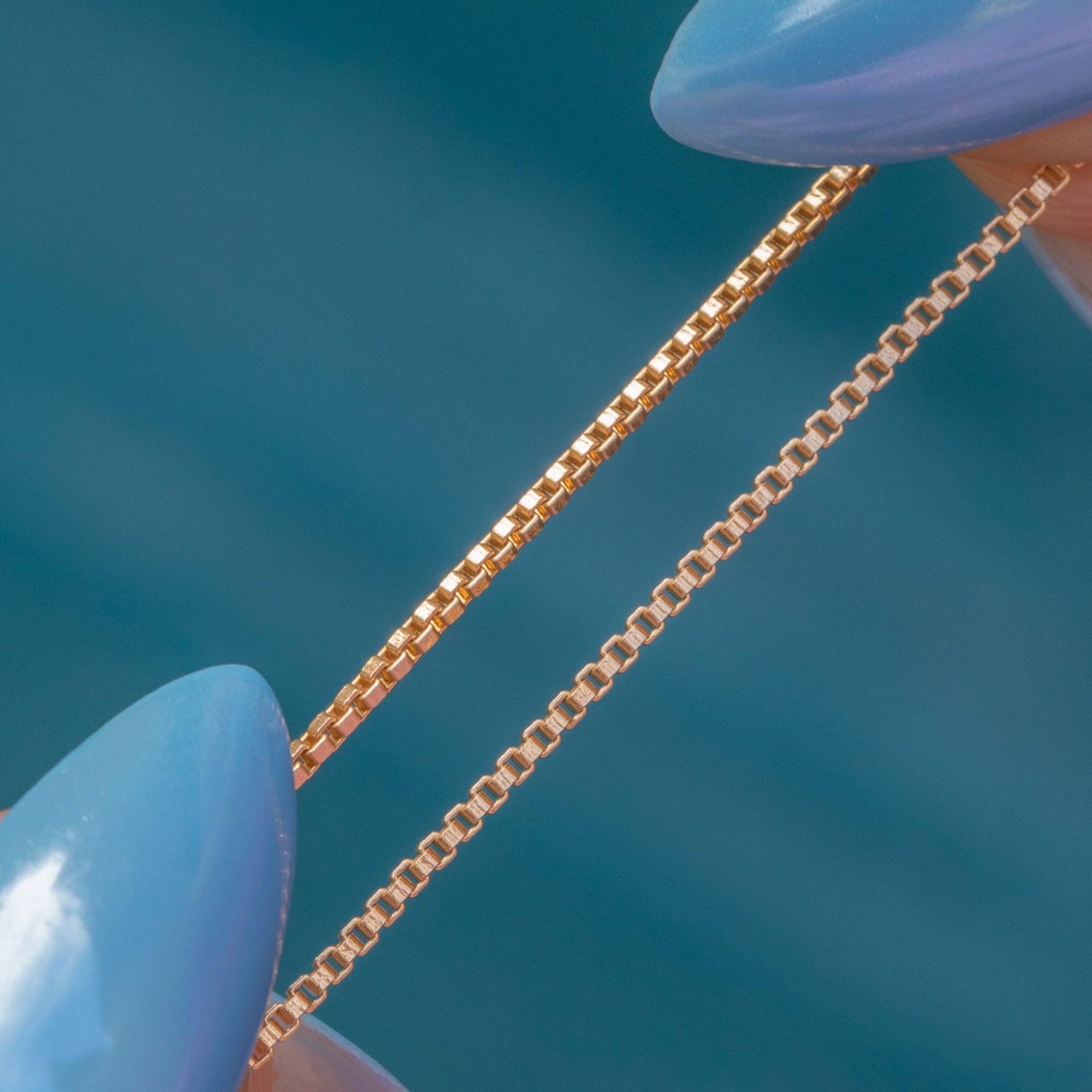 At 16" long, this Gold box chain fits snugly and is perfect for layering with other chains, suspending pendants, or simply being worn alone for a subtle flash of Gold!