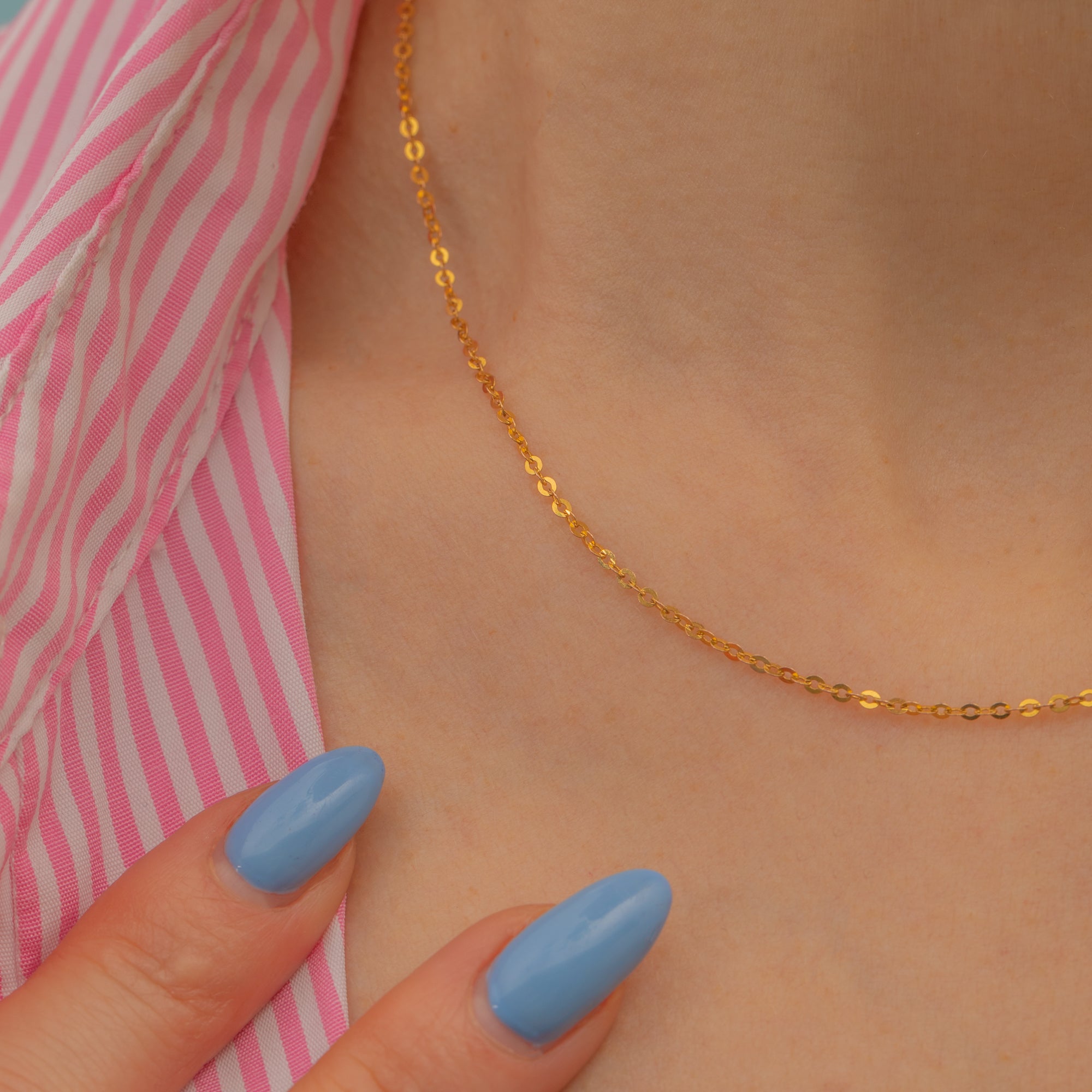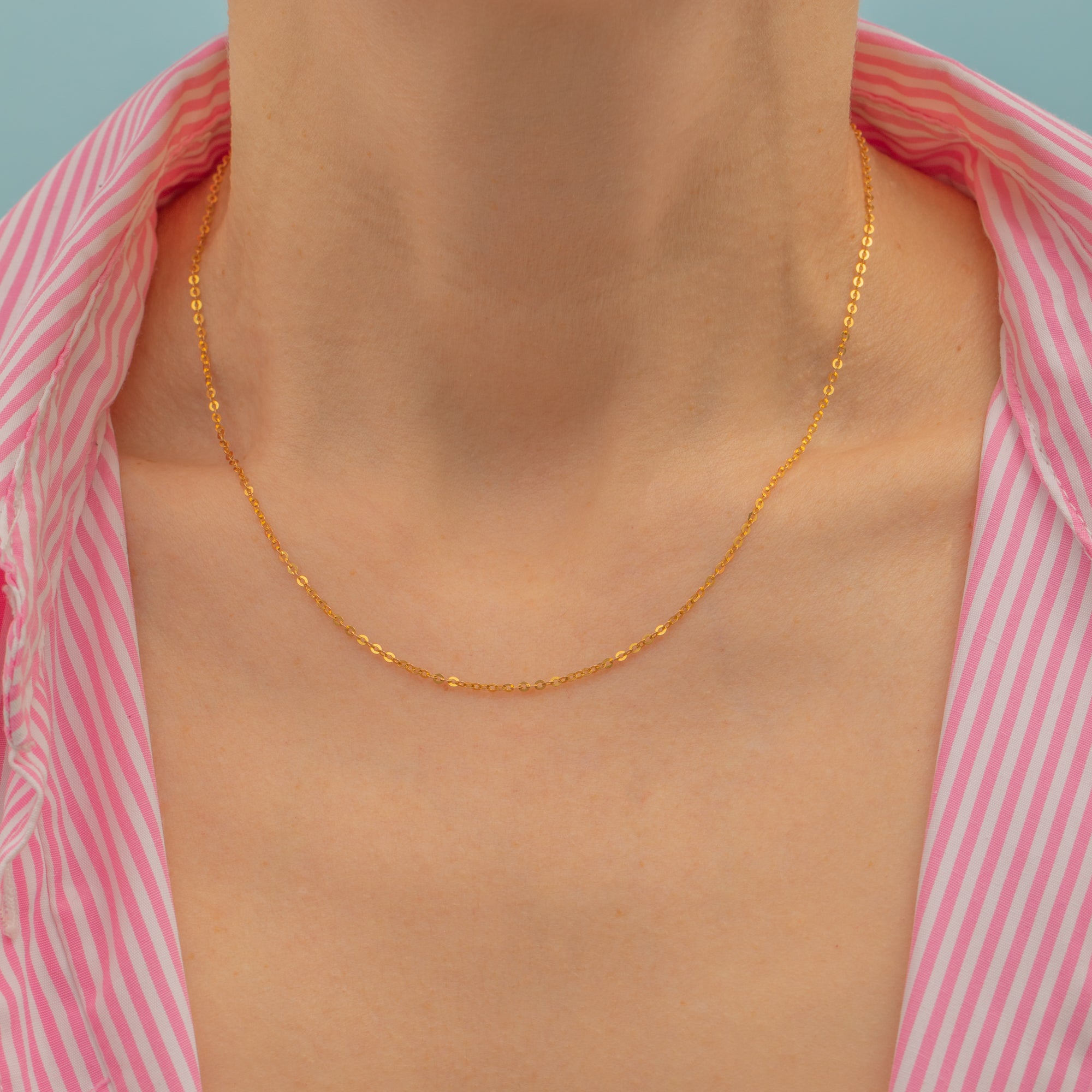 This 16" antique 9ct Gold fine trace chain will bring versatility and luxury to your repertoire! The stylistic flat Gold links catch the light magnificently, sending shimmers cascading across your décolletage as the 16-inch length rests delicately across your collarbones.