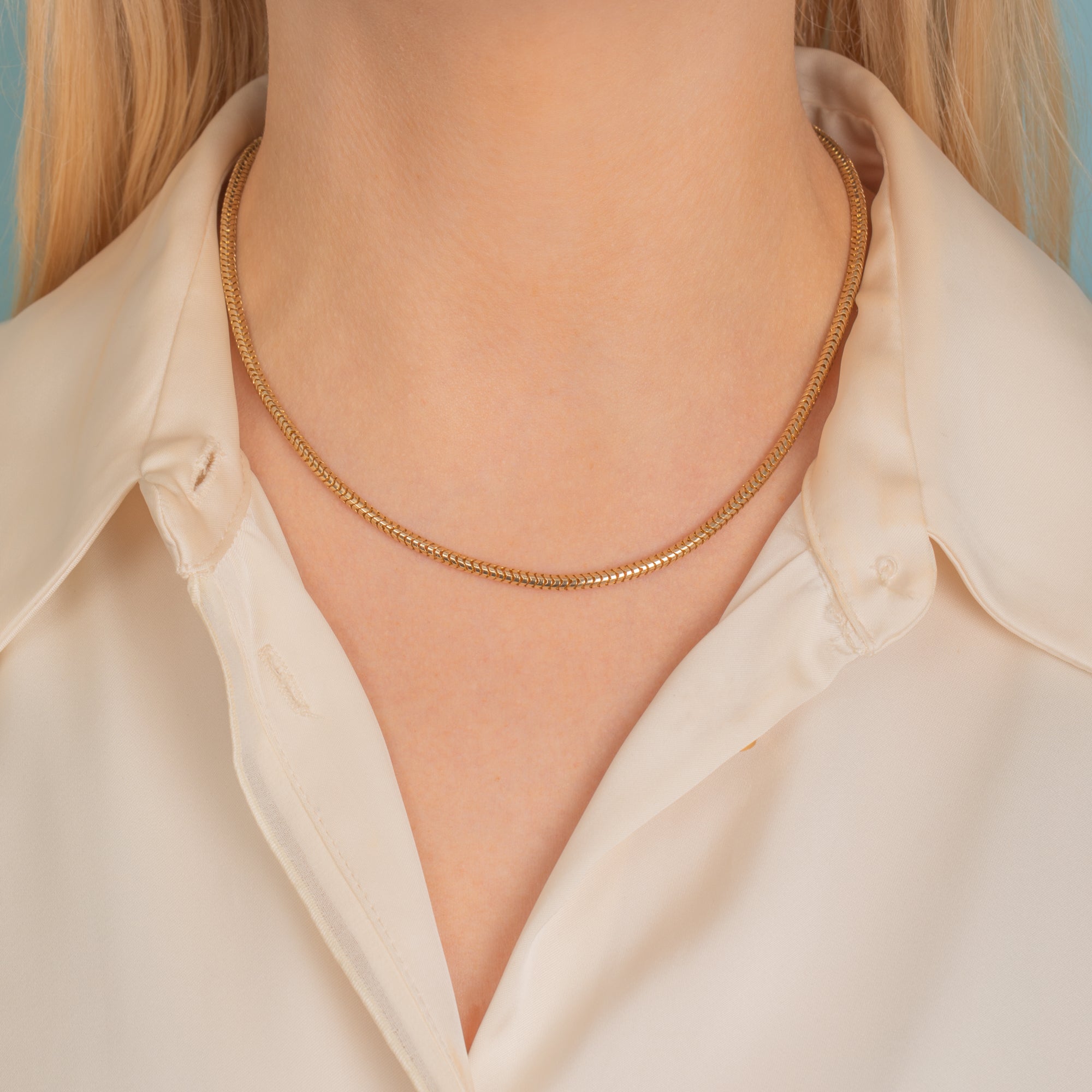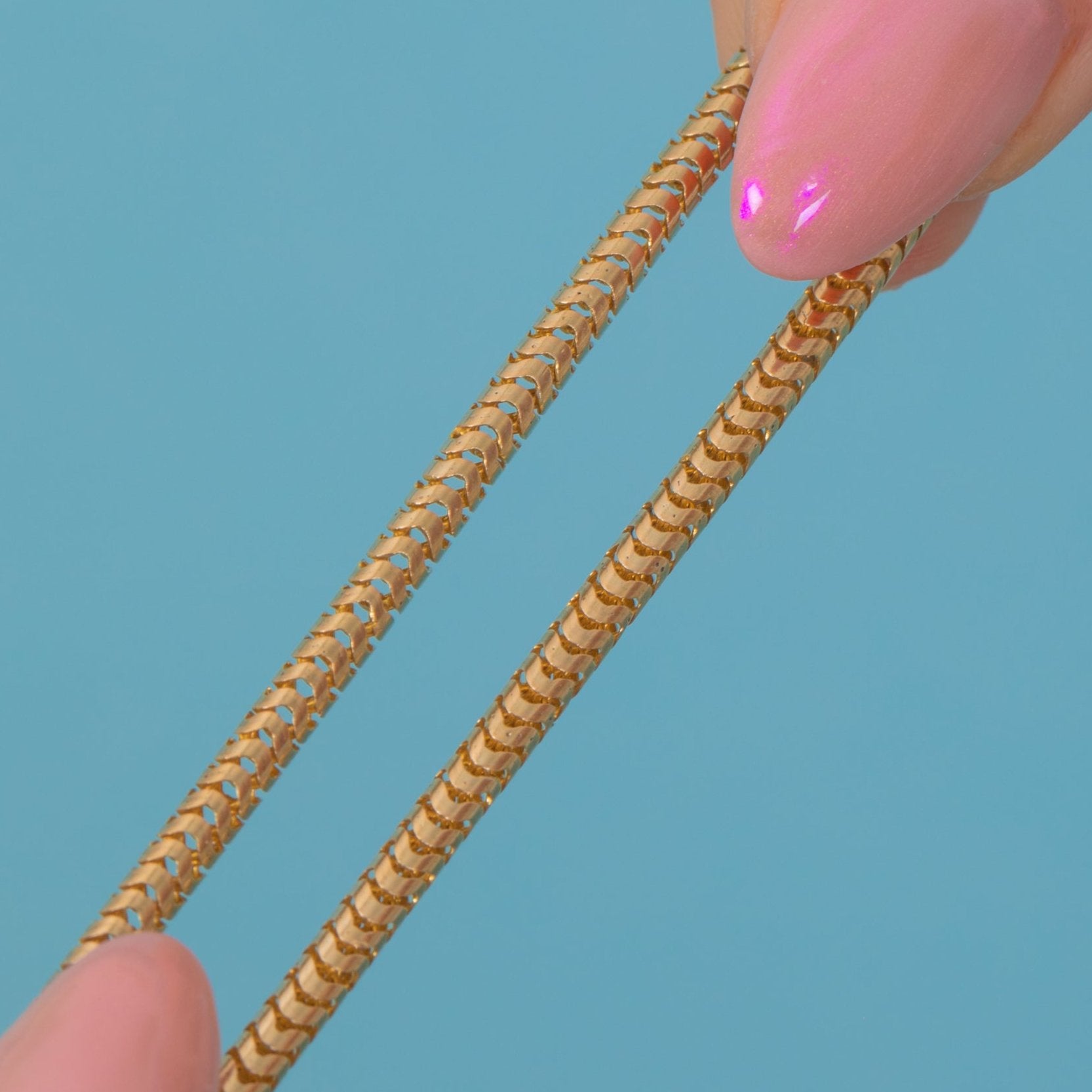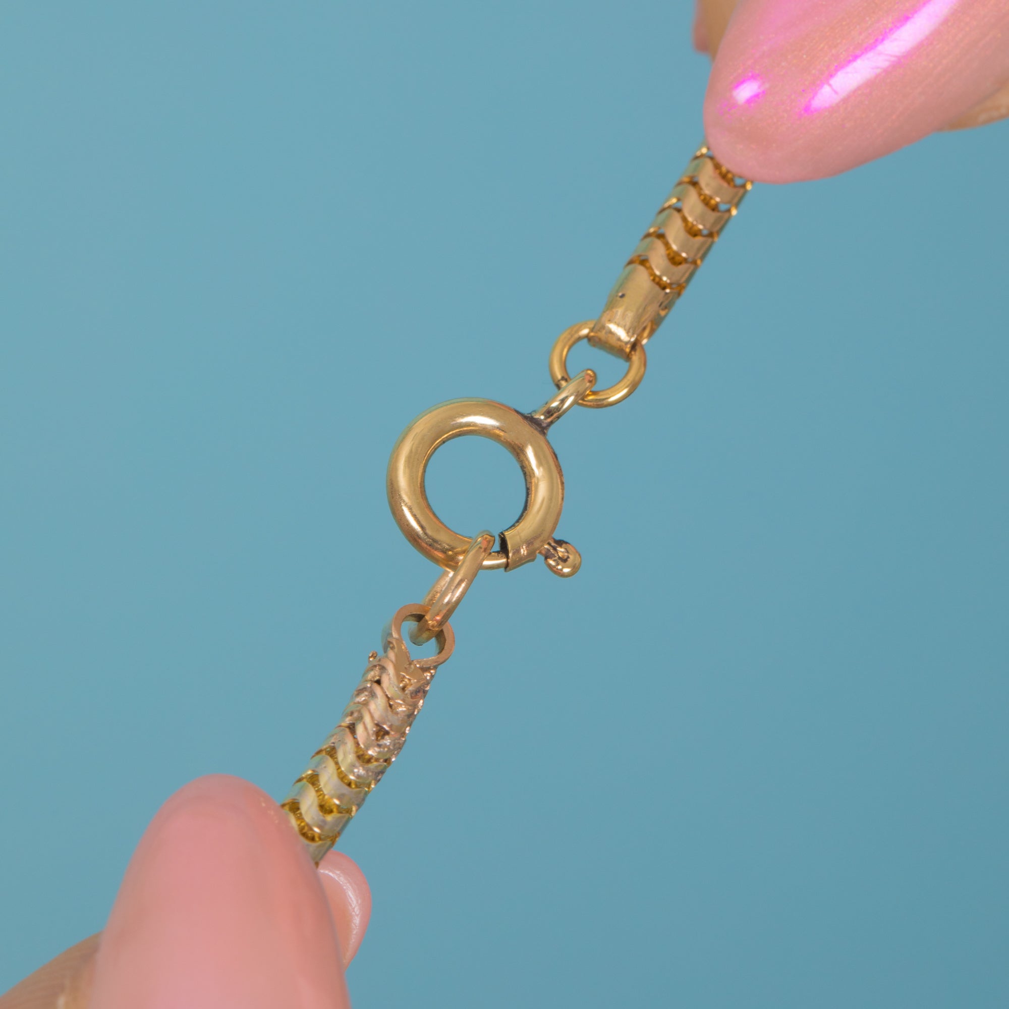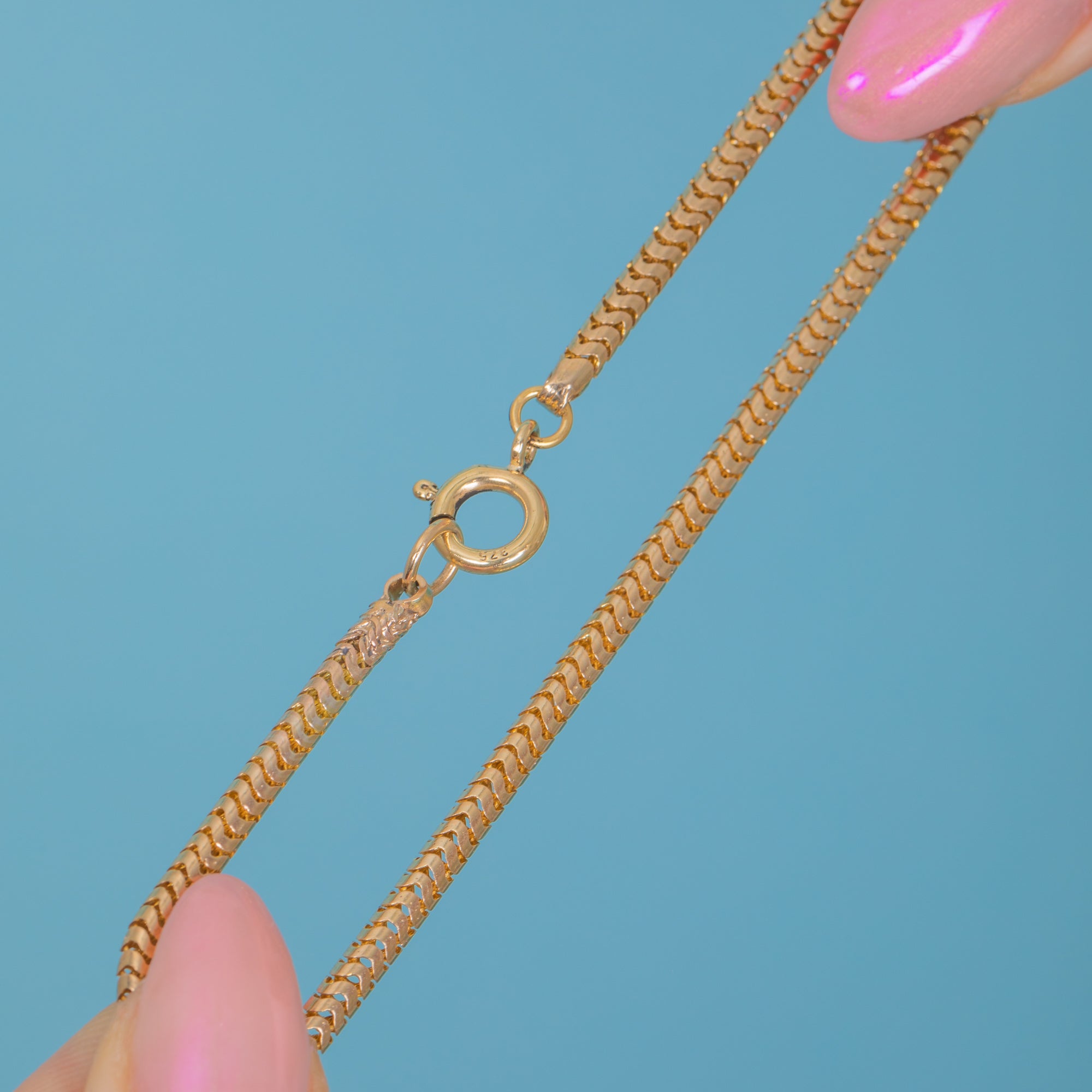 The epitome of elegance and sophistication, this silky 16" antique 9ct Gold snake chain will make a fine addition to your collection! Each delicate 9ct Gold link intertwines gracefully, mimicking the sleek movement of a serpent and feels chic and sensual against the skin.