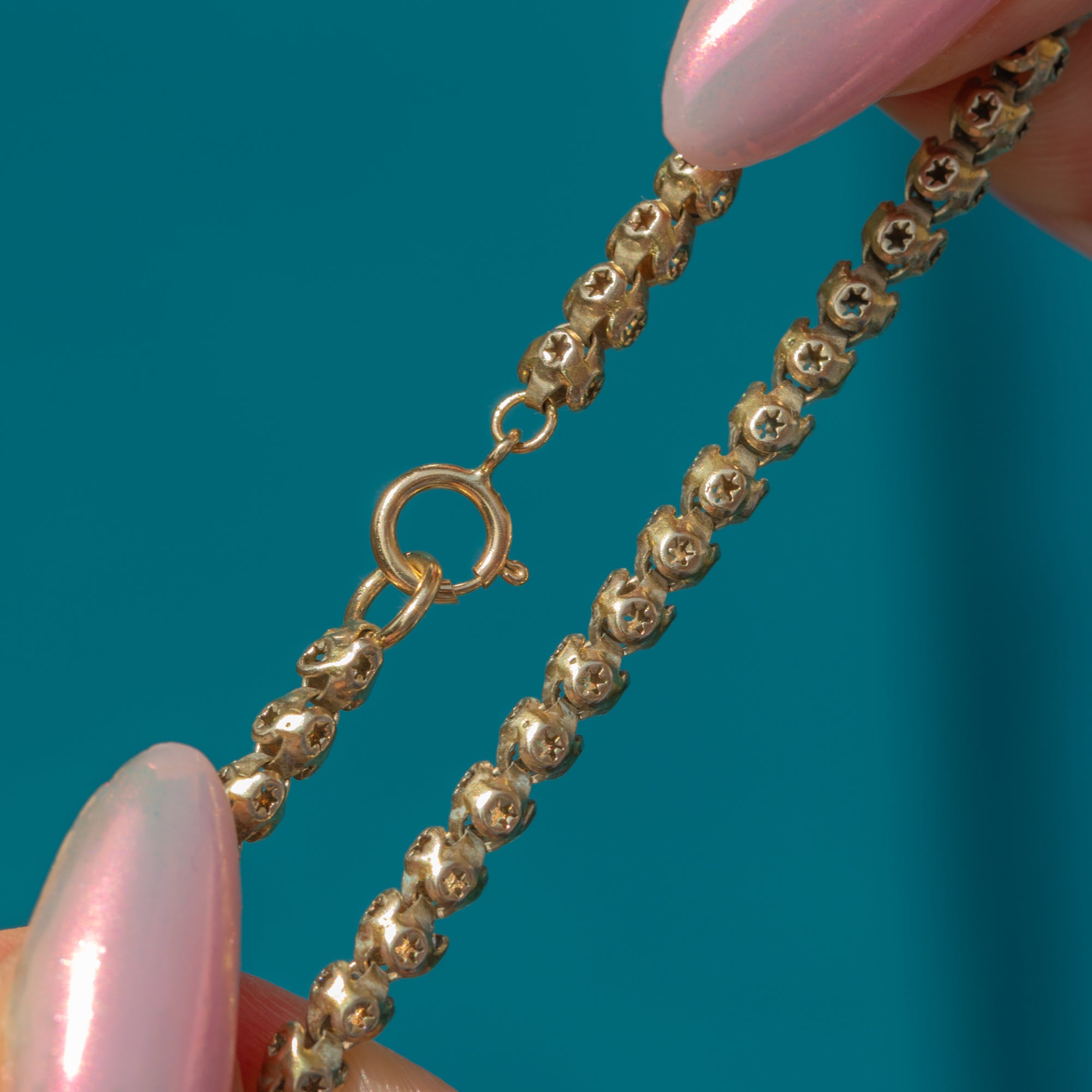 At 16 inches long, this Victorian chain rests delicately across the collarbones and is perfect for being worn as a standalone piece or stacked in a modern chain mess!