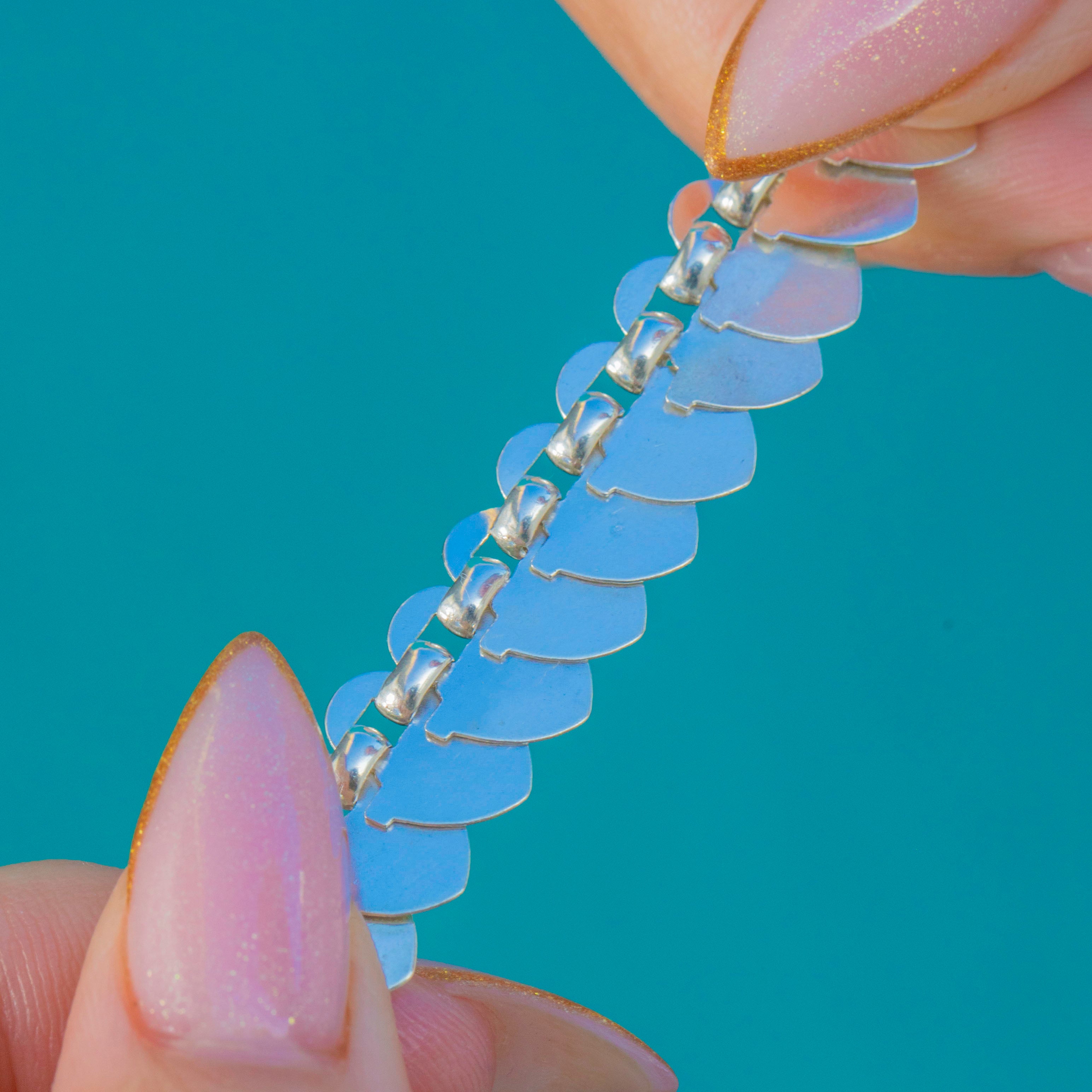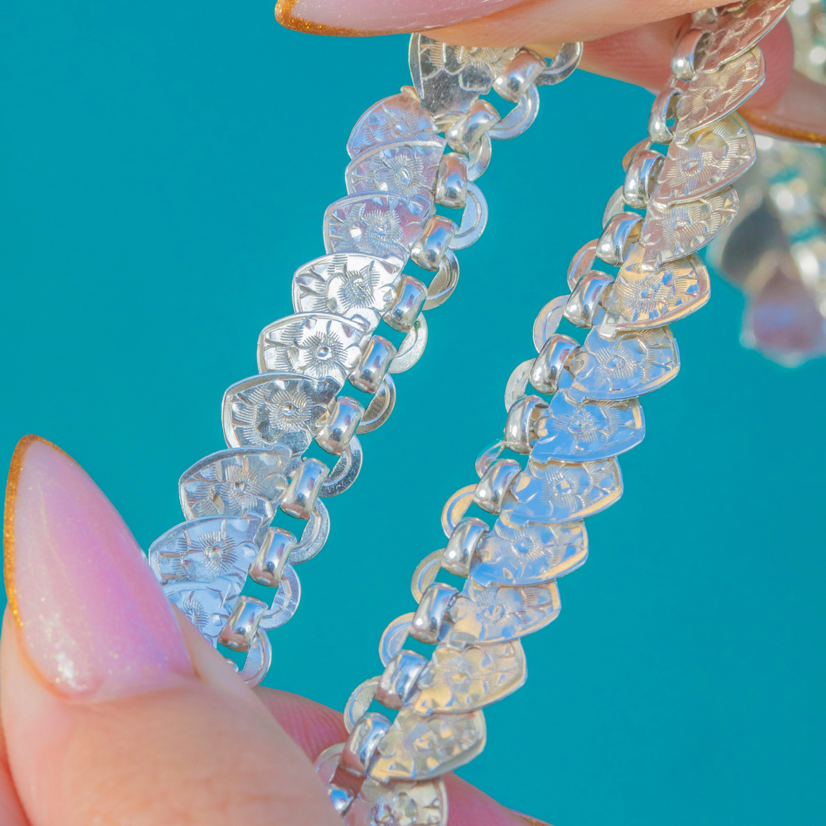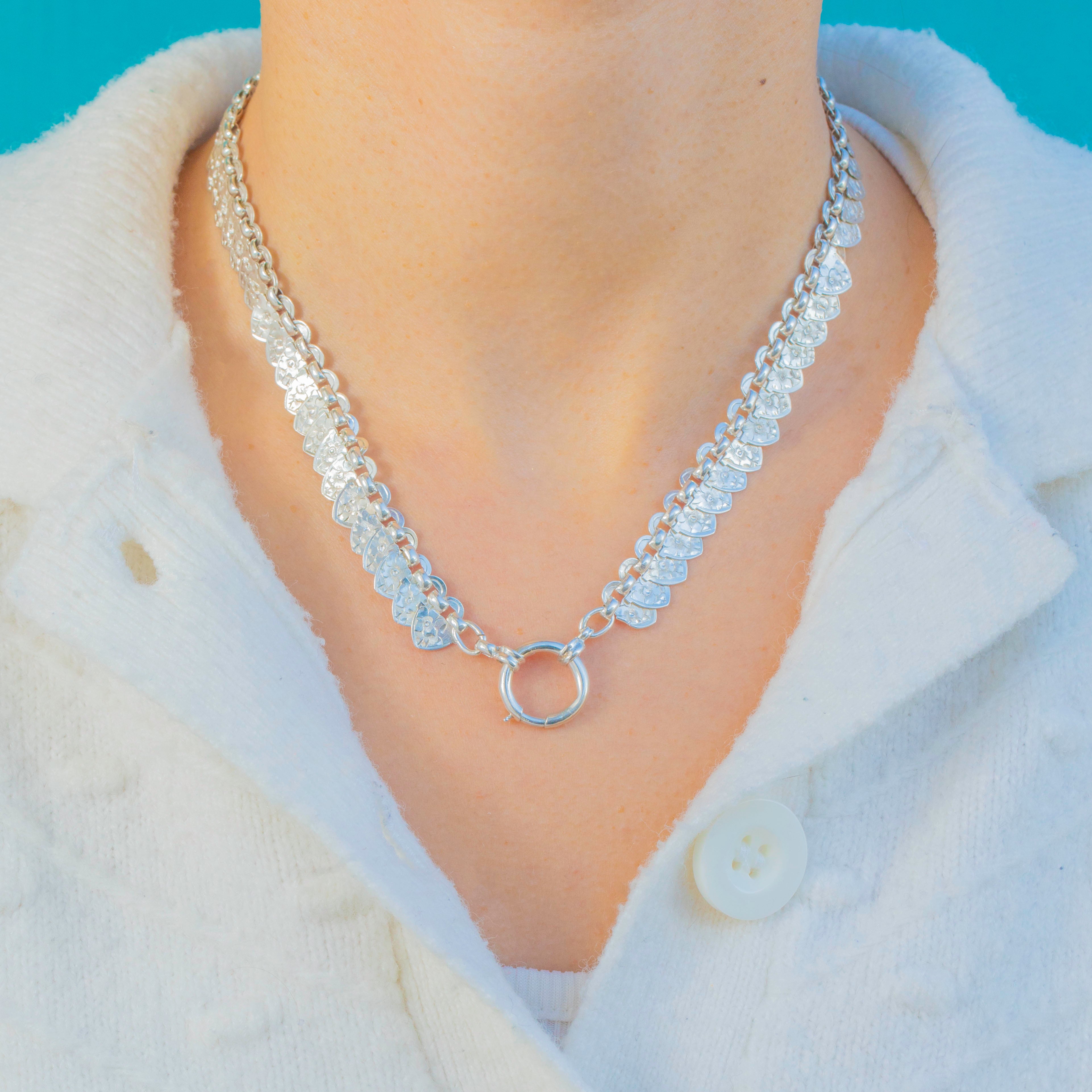 Richly detailed and wonderfully wearable, this late Victorian Sterling Silver “hearts” book-chain collar captures the era’s love of ornament. A rhythmic run of heart-shaped plaques is crisply bright-cut with starburst and foliate motifs, creating a scale-like shimmer that dances as the necklace moves.