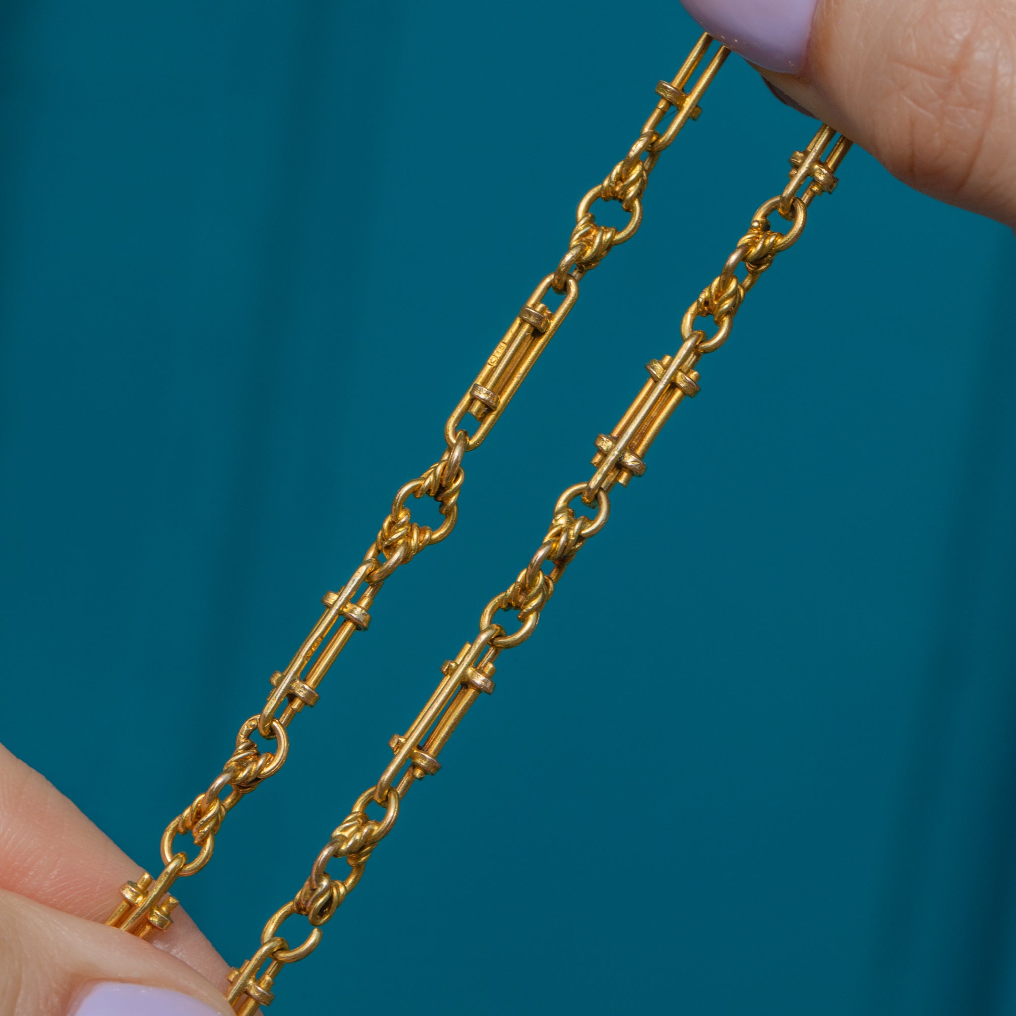 EXCELLENT. This 17" antique 18ct Gold lover's knot chain is in excellent condition. The links are all secure, and the dog-clip is in perfect working order. The buttery hue draws in the eye, and she can be worn with absolute confidence. This necklace can be worn with confidence for the rest of your life!