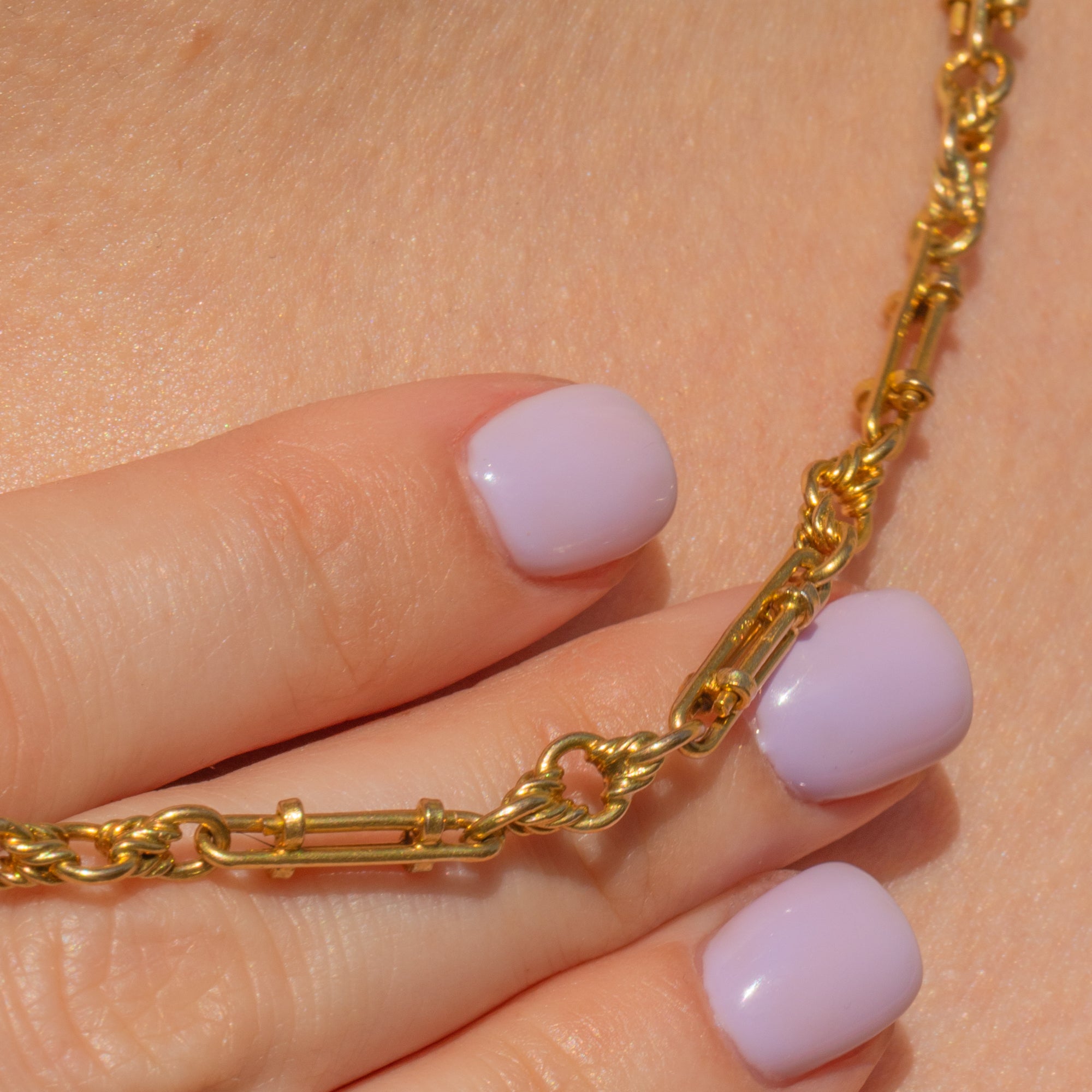 Each link has been stamped with a crown and '18', and the piece alternates between lover's knots and paperclip links. Finished with a dog-clip, this chain can be worn alone or styled with a pendant.