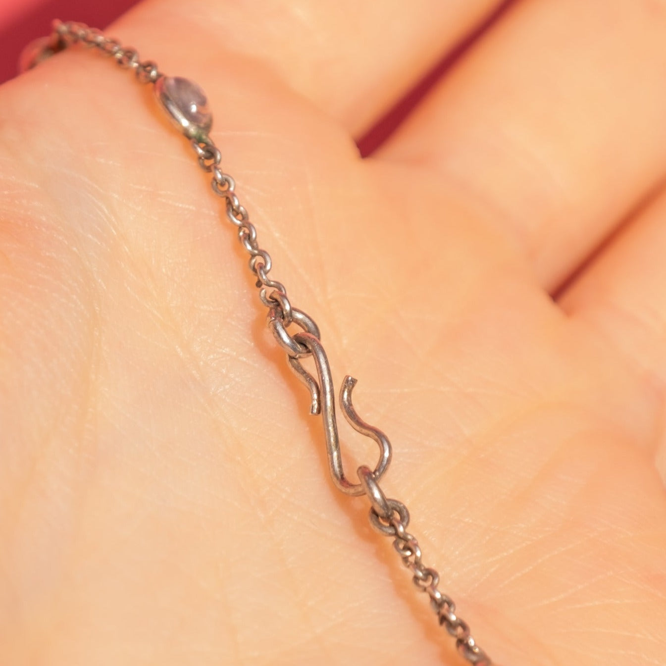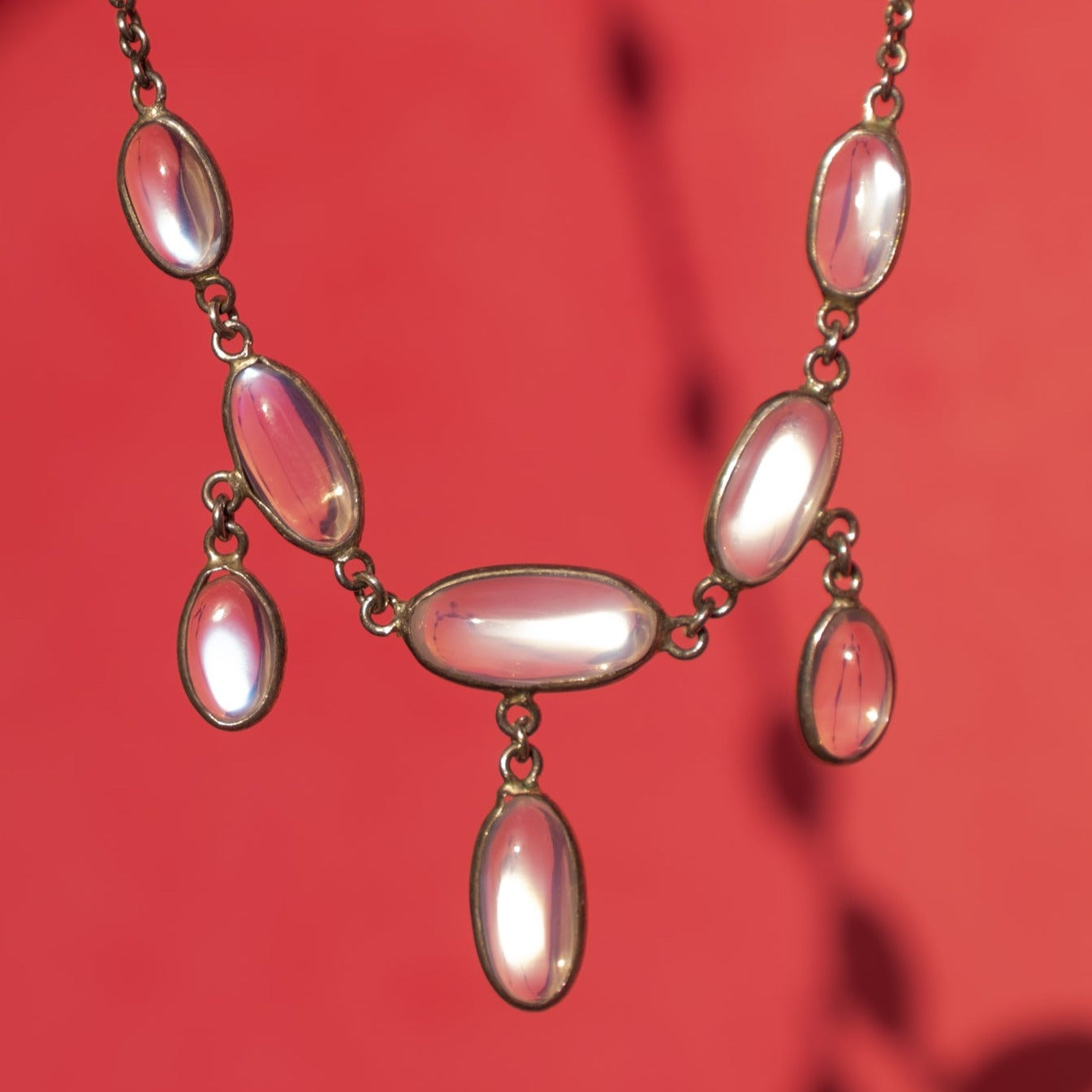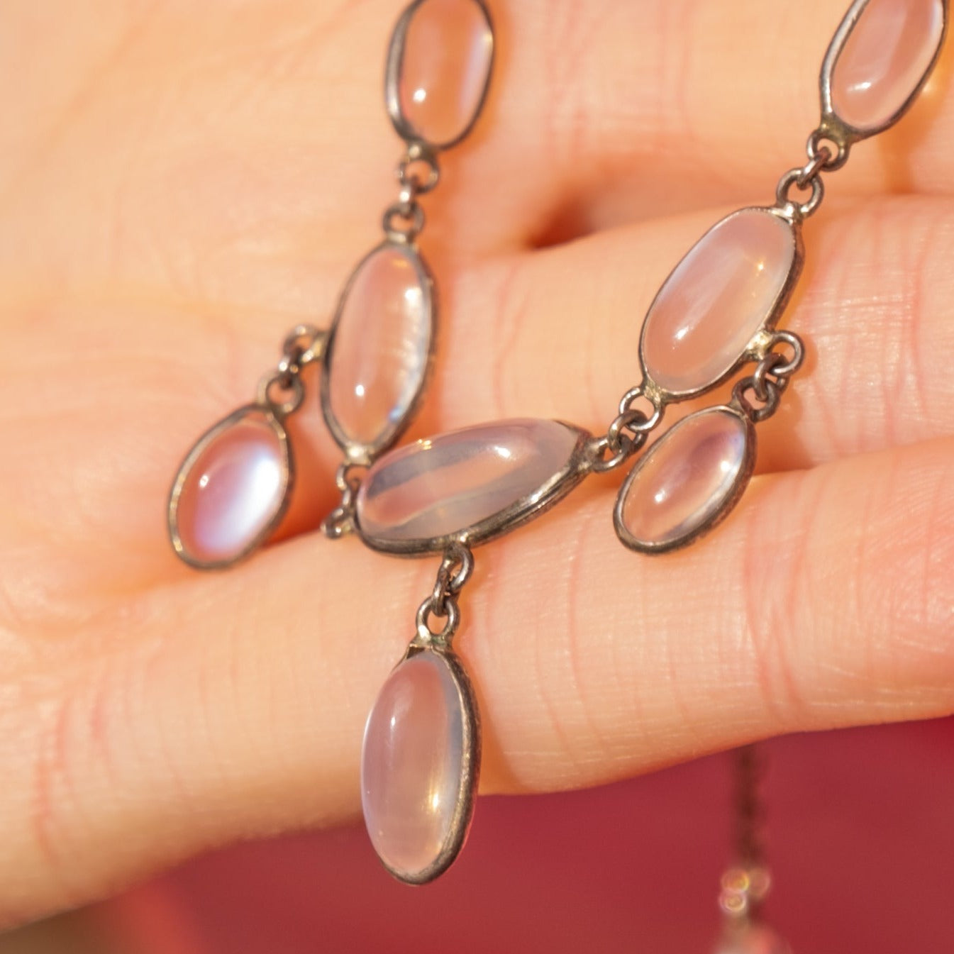 VERY GOOD. This antique Silver Moonstone cabochon necklace is in very good condition. Each of her Moonstones are securely set within their bezels and gleam their unique adularescence. There is some minimal wear to the Moonstones, commensurate with age, but this is only noticeable under close inspection. The Sterling Silver has accrued a pretty patina over her lifetime, adding to her antique charm. Complete with a sturdy 'S' hook, this antique necklace is ready to adorn your neck straight from the box!