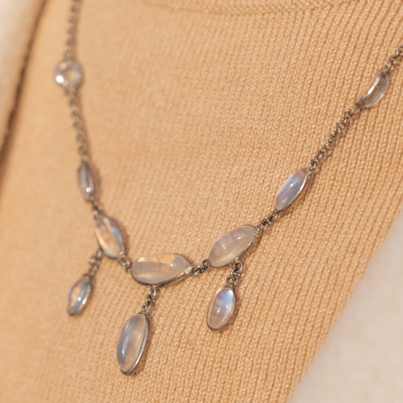 This antique Silver Moonstone cabochon necklace is set to capture your heart! Ethereal milky blue tones ooze from each of the Moonstone's smooth cabochon cuts, complemented by the cool stones of her thin Sterling Silver chain.