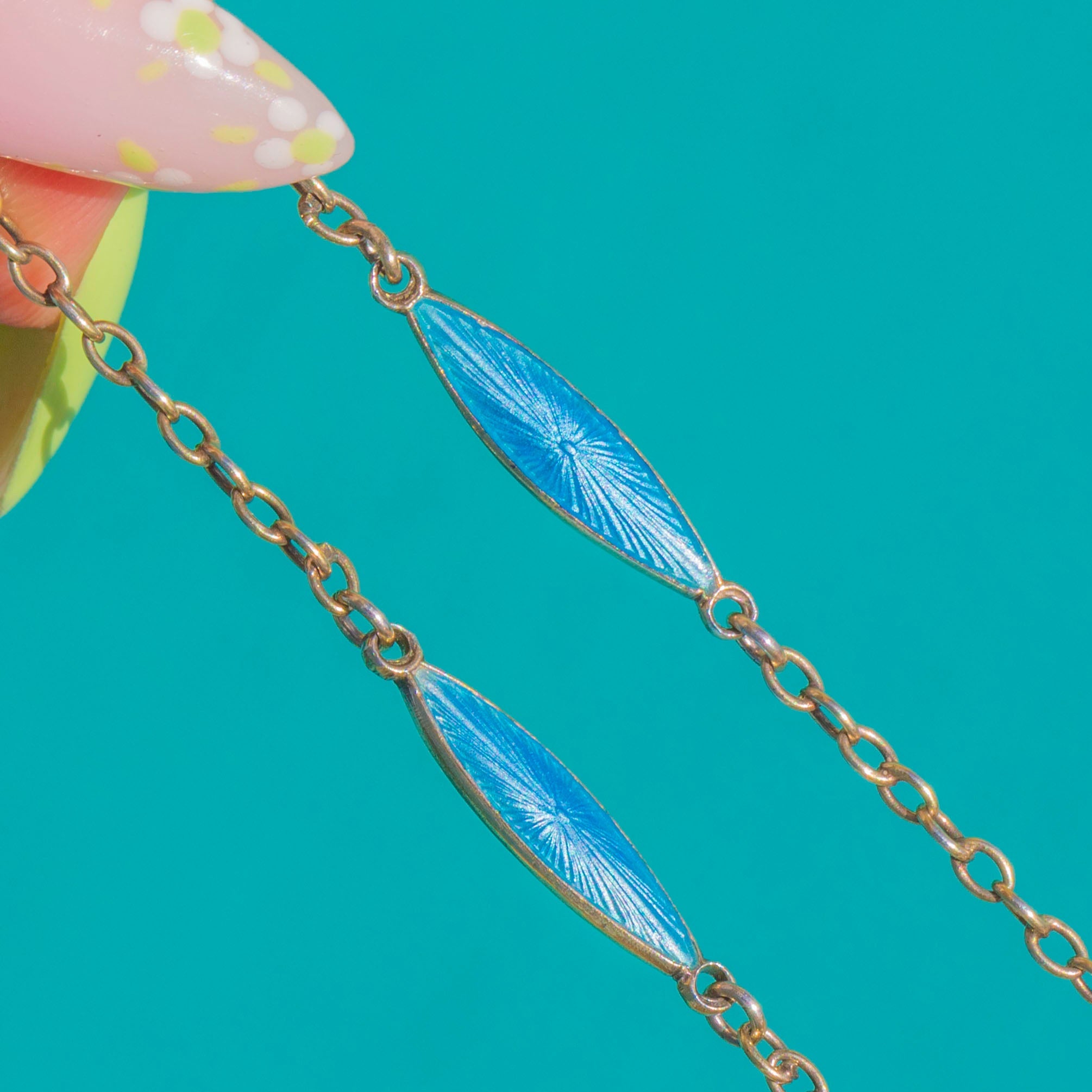 Glowing with that unmistakable Art Deco allure, this Silver chain is set with a sequence of elongated lozenge plaques of translucent blue guilloché Enamel. Each plaque reveals a delicate radiating starburst engine-turned pattern beneath the glassy Enamel, creating a play of light that shimmers with every movement.