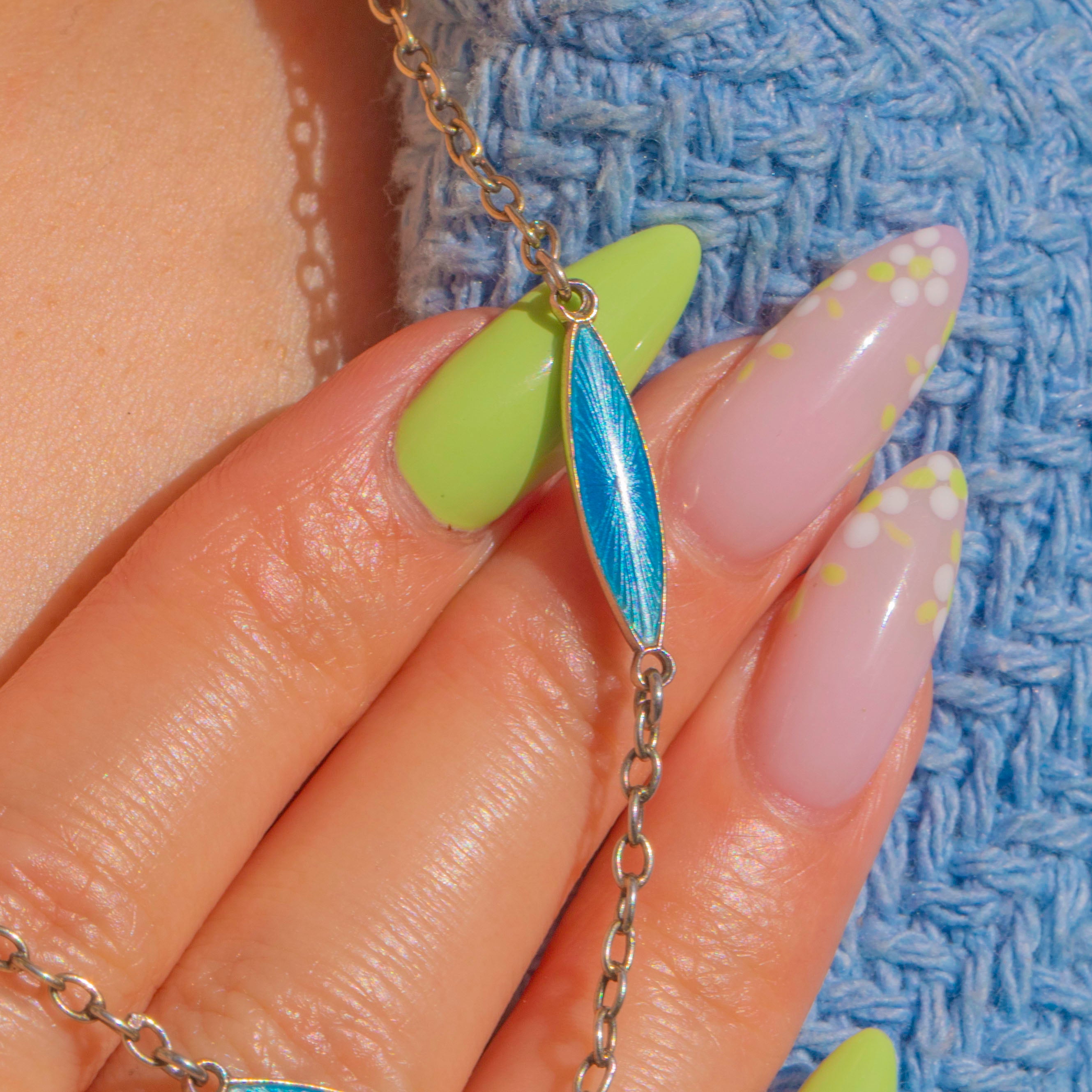 The articulated construction and fine links lend beautiful fluidity so it sits elegantly at the collarbone, while the repeating navette silhouettes offer a refined, graphic rhythm. A classic barrel clasp completes the vintage feel—equally chic worn solo or layered for a pop of luminous colour.