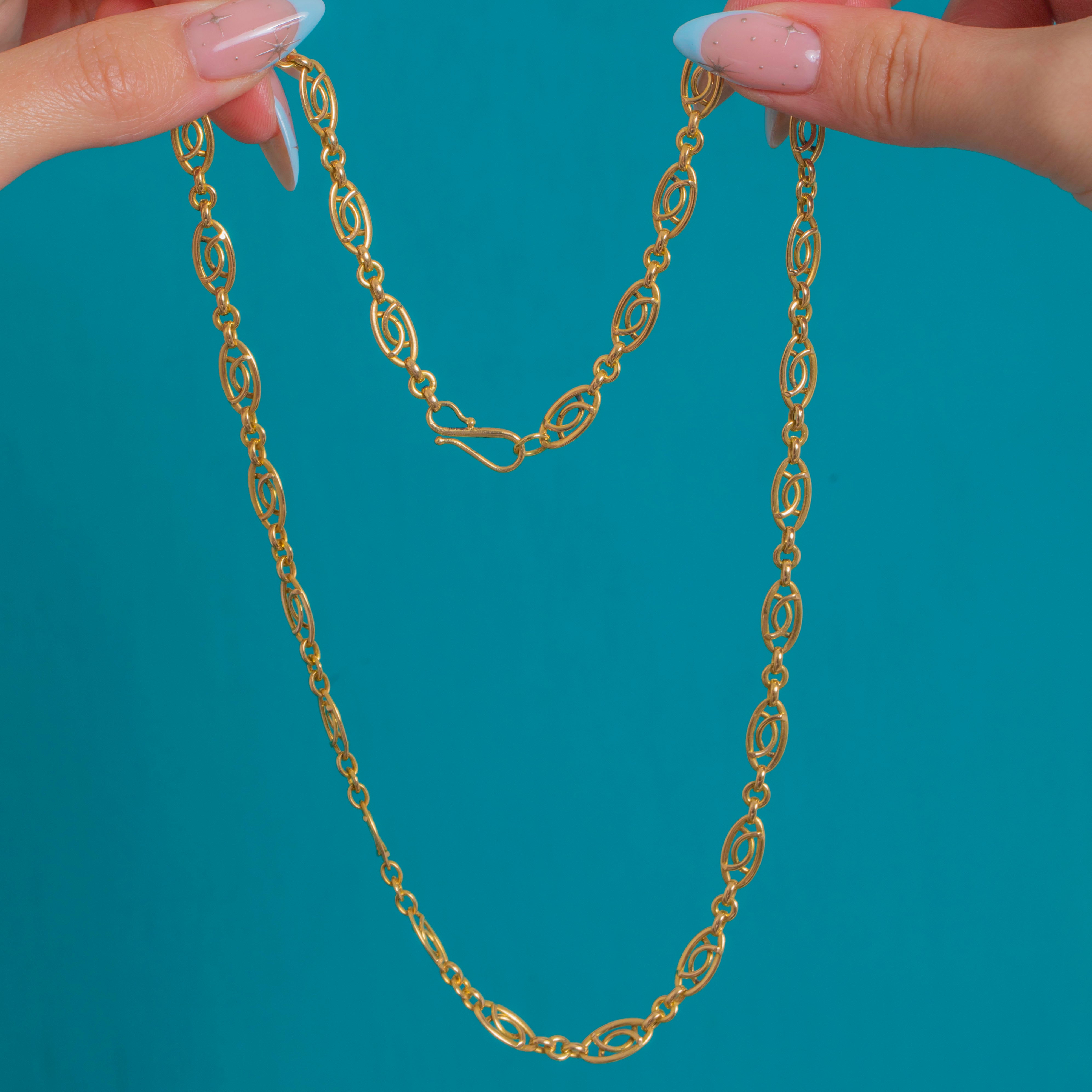 A beautiful Late Victorian fancy-link chain, crafted in rich 18ct Gold with an elegant French sensibility. Each openwork navette link is adorned with delicate soldered S-scrolls, joined by petite jump rings for a refined, articulate drape. The warm, bright glow of the Gold flatters the intricate wire-formed design, offering texture and movement in every link.
