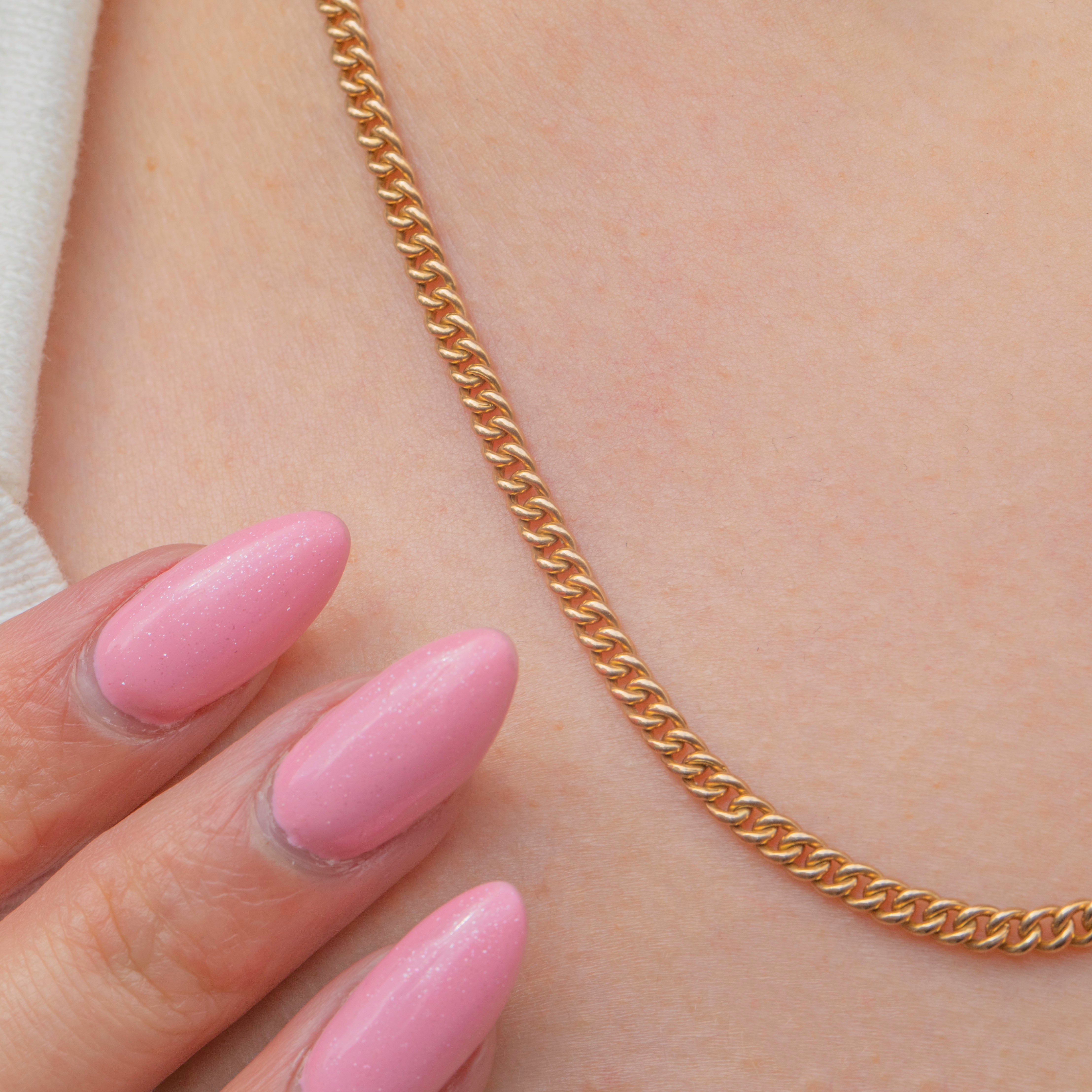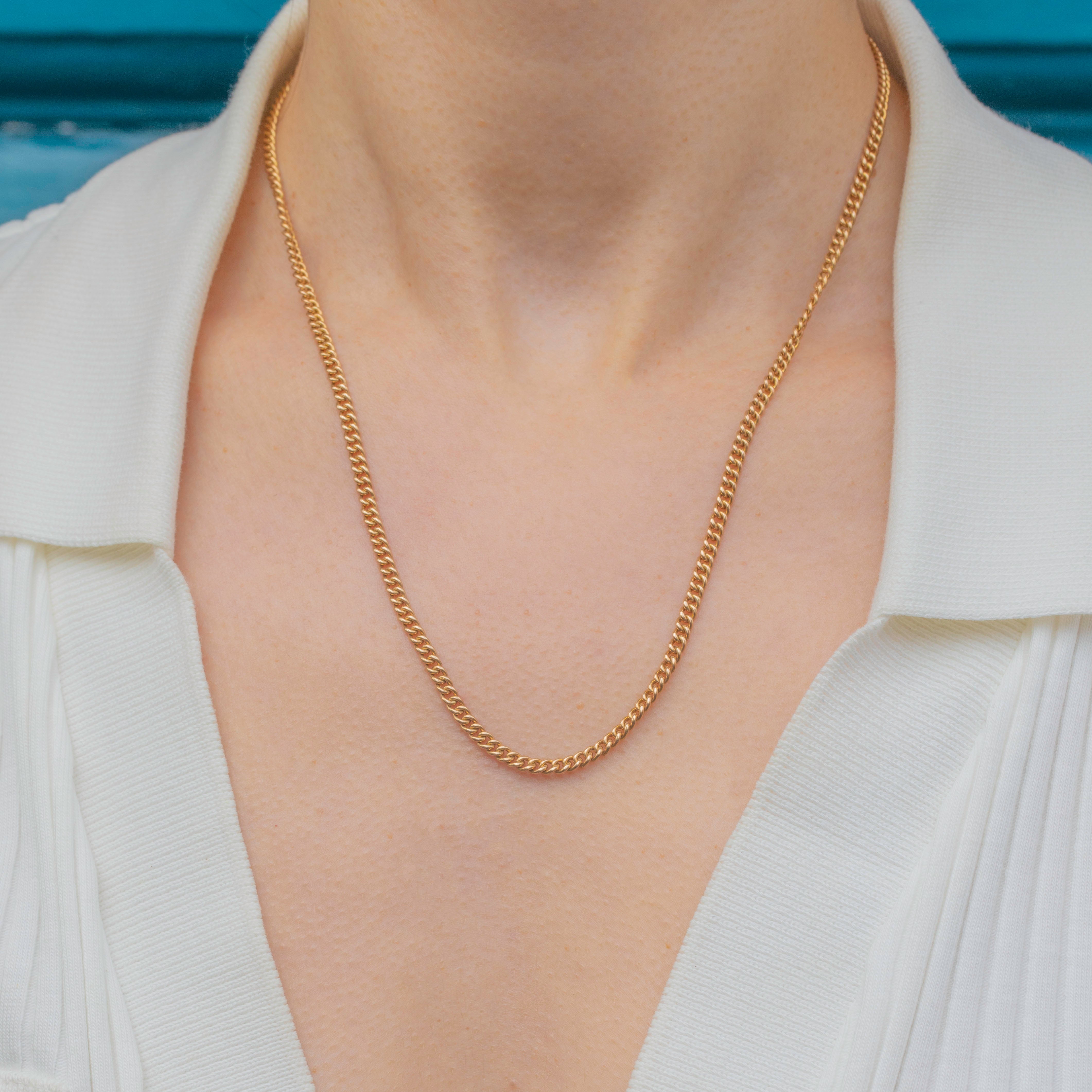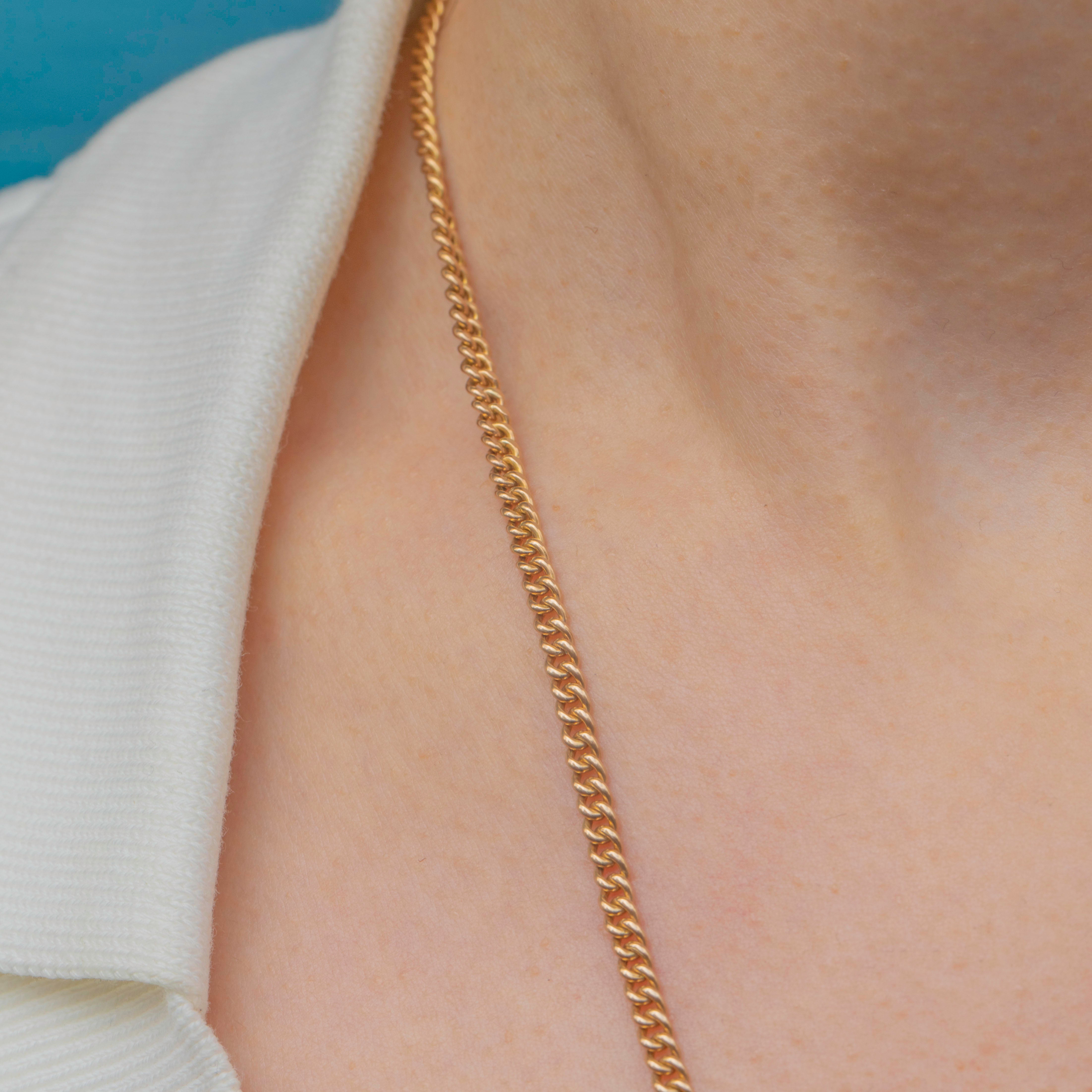 Make this 18" antique 15ct Gold curb link chain your new go-to piece! Her 18" length is crafted from bright and buttery 15ct Gold, trickling from one curb link to the next and radiating warmth as she adorns your neck.
