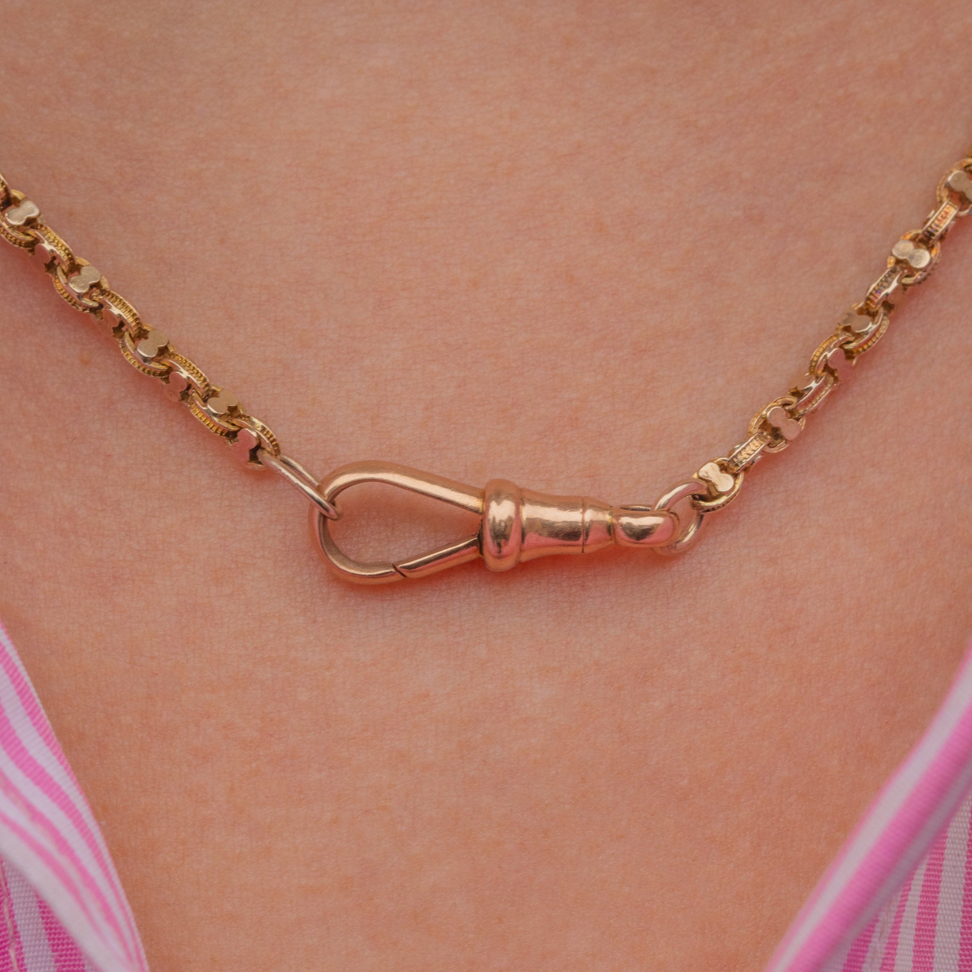 This 18" antique 9ct Gold fancy link chain is the perfect versatile piece to add to your collection! Crafted from buttery warm yellow 9ct Gold, this Victorian chain features gorgeous supple links and an adorable, highly sought-after dog-clip.