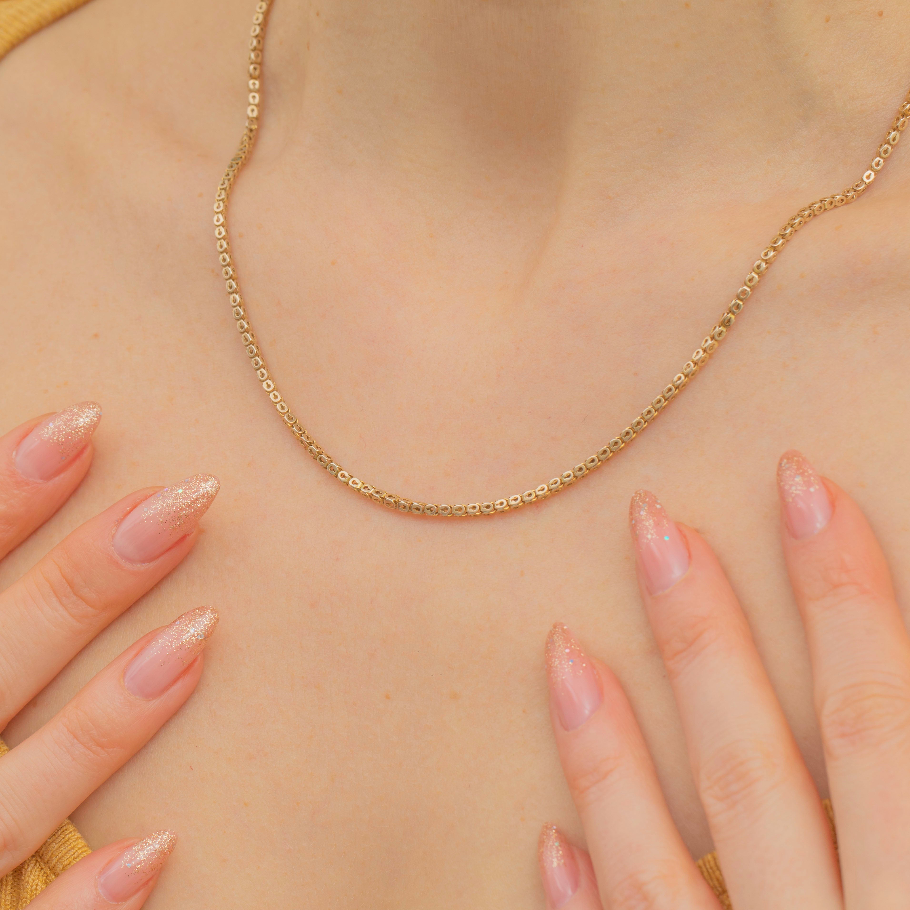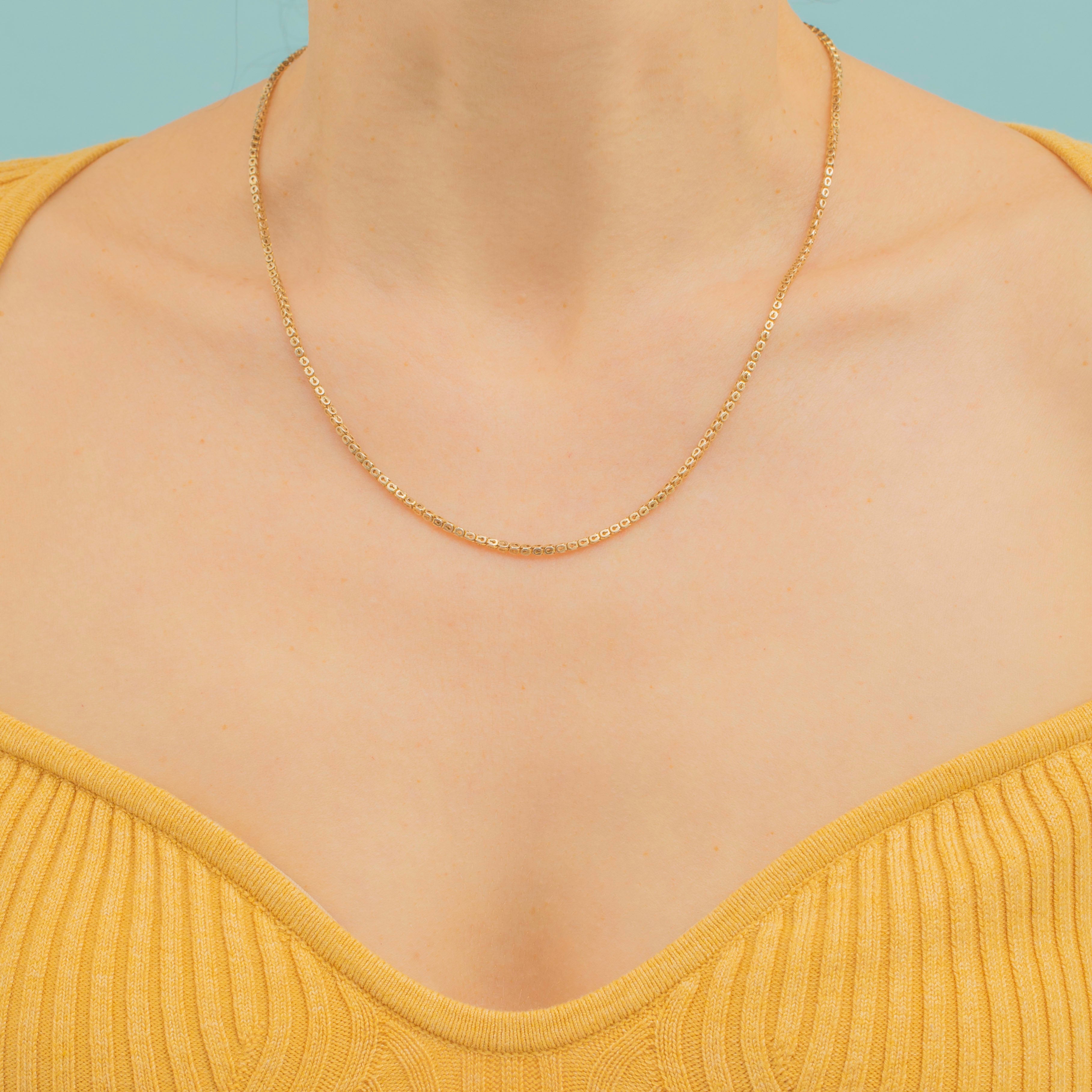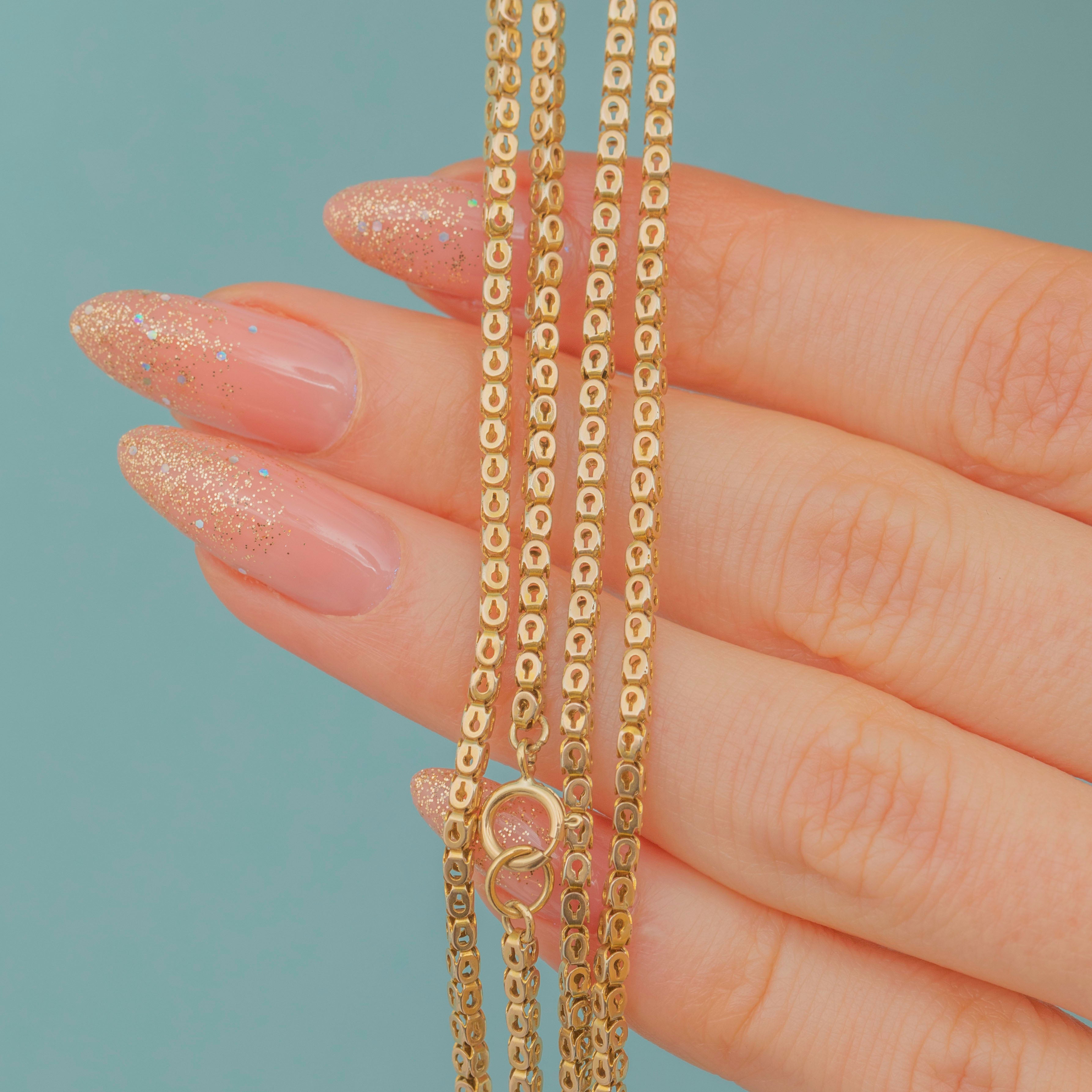 This 18" antique 9ct Gold pierced link chain is a timeless piece for you jewellery collection. Perfectly sinuous and silky, this Victorian Gold chain sits gracefully around the neck. Boasting a golden-hour glow, she has true Victorian splendour!