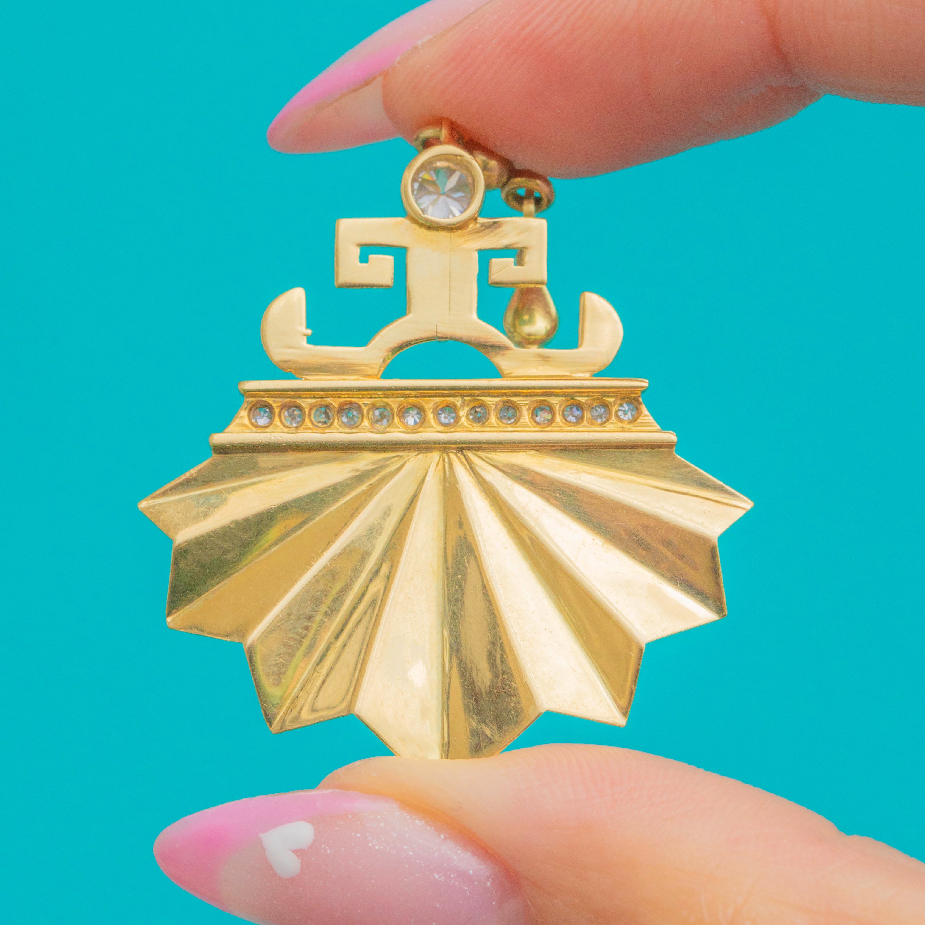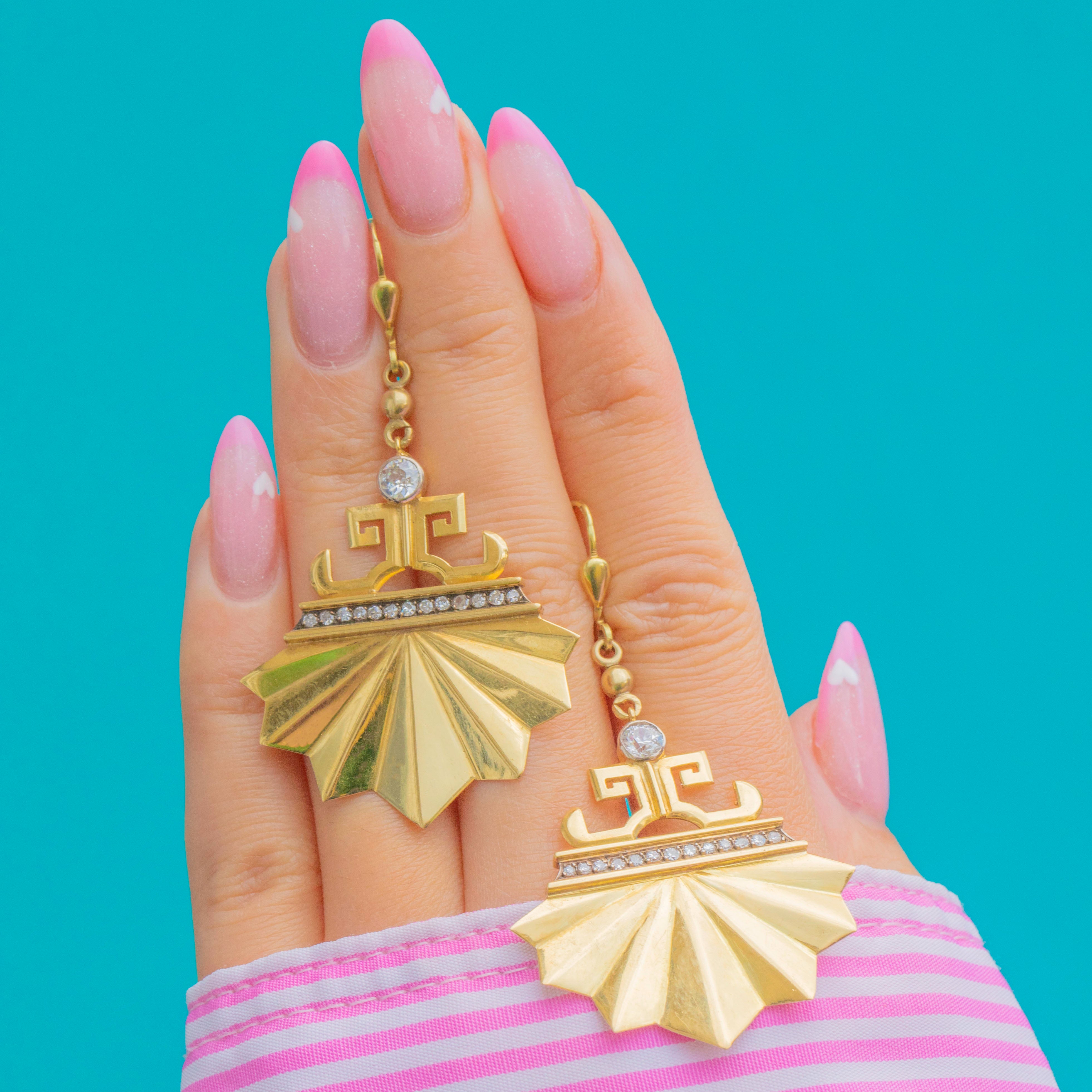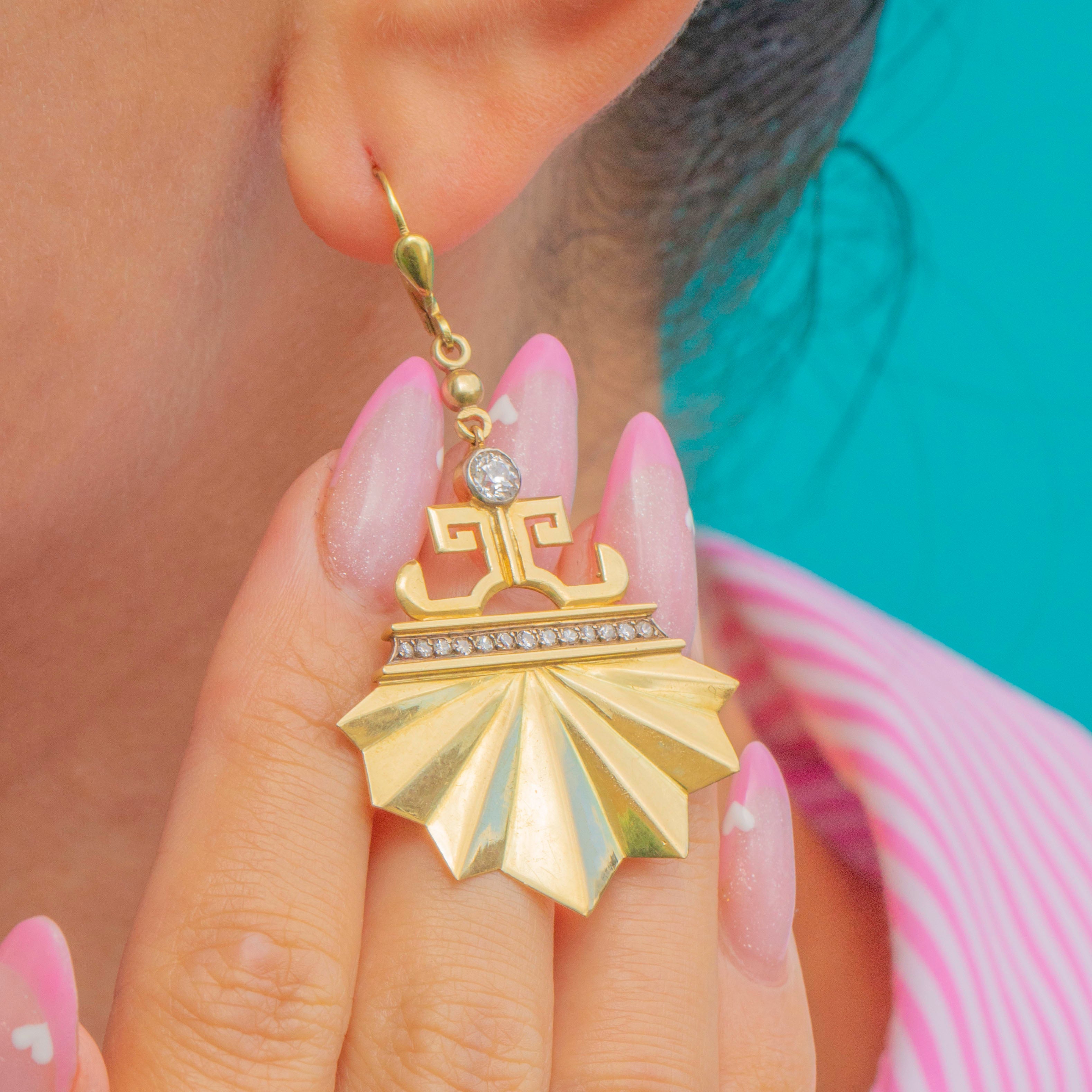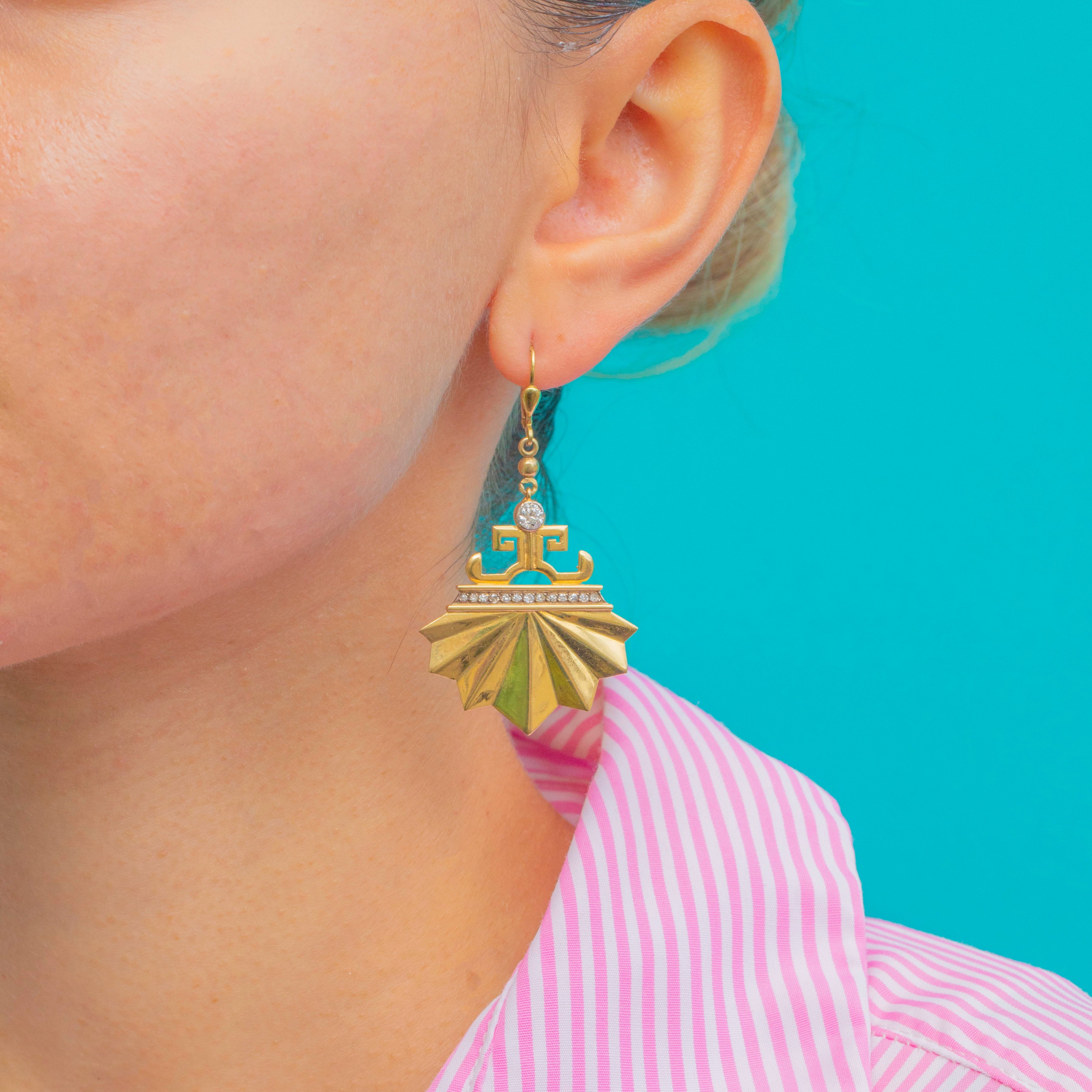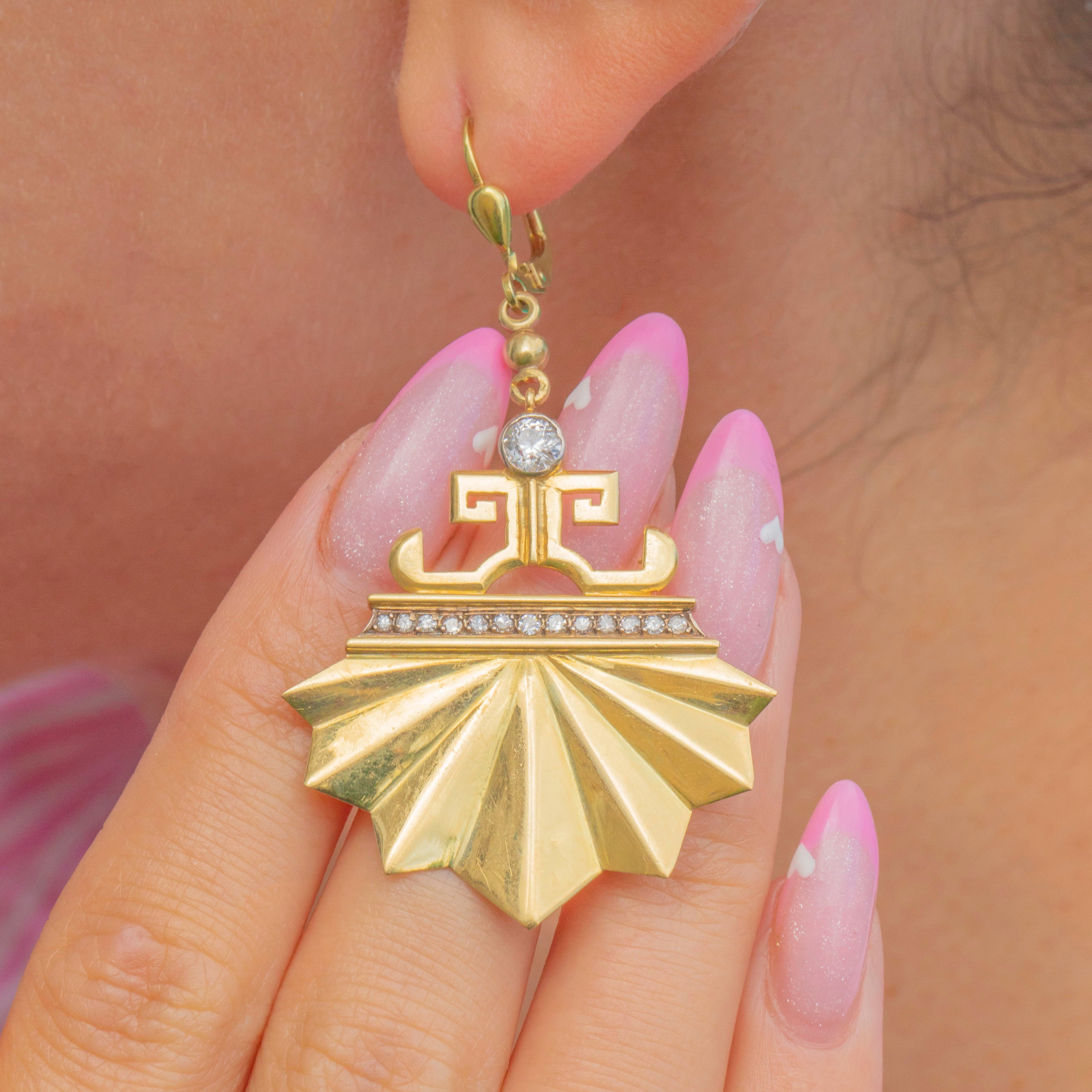 Exquisite and architectural, these Art Deco earrings are crafted in rich 18ct Gold and set with glinting Diamonds in a dramatic fan-shaped design. The bold geometric form captures the glamour and precision of the Deco era, while the later-added Gold ear hooks ensure comfortable and secure wear.