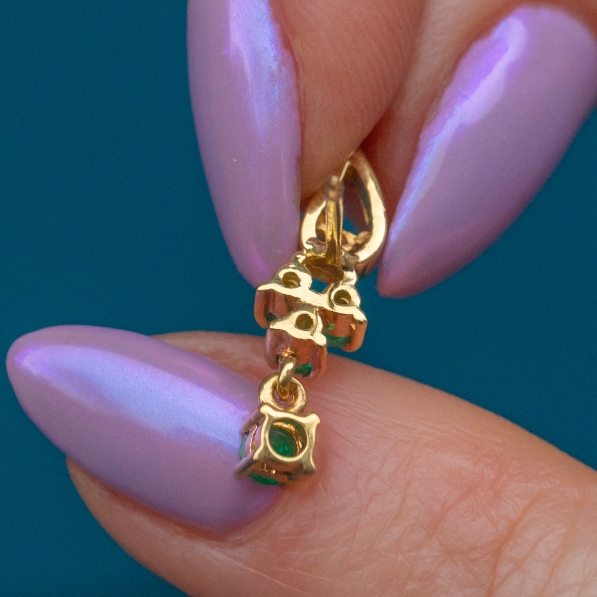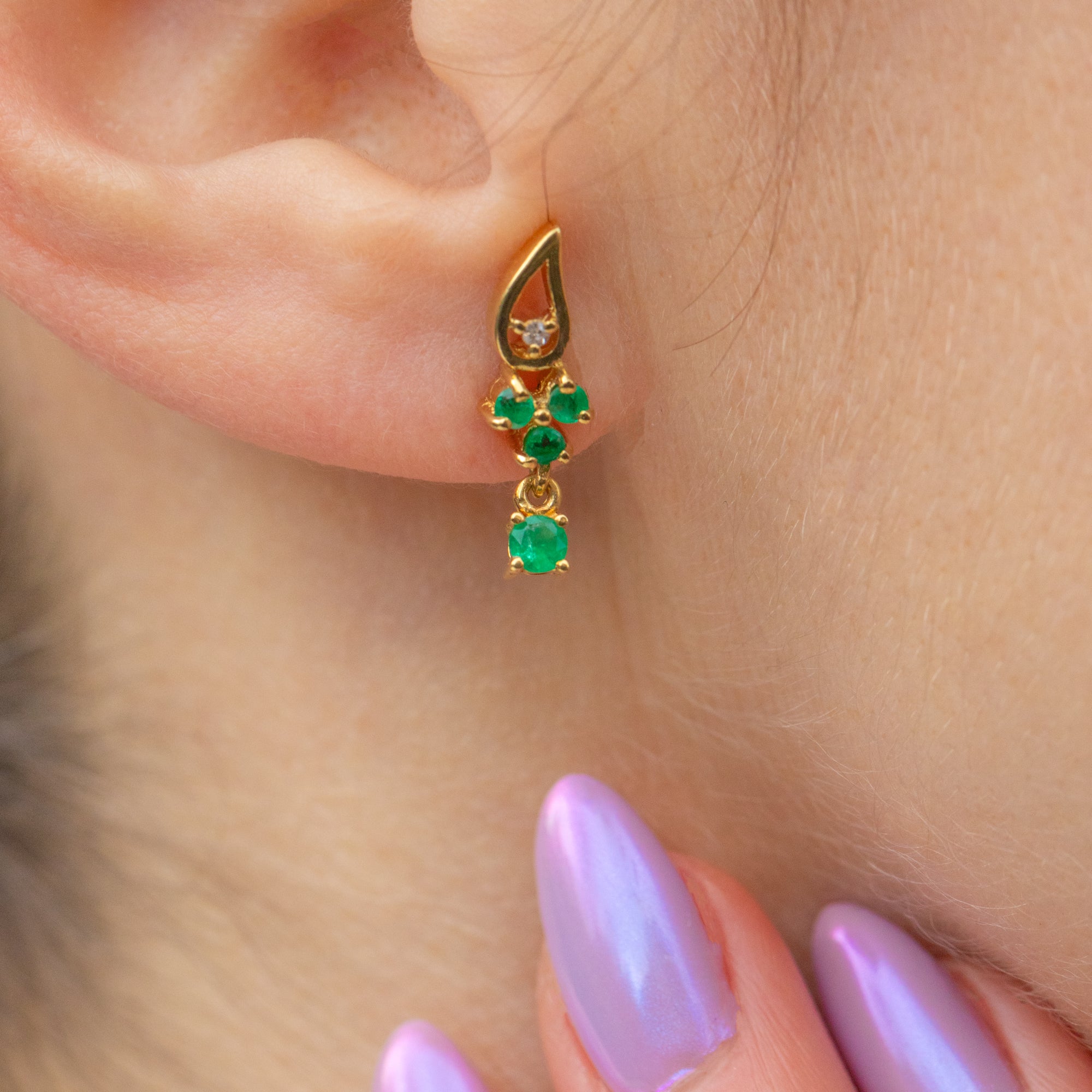 These elegant 18ct Gold Emerald Diamond earrings are an easy yes! Each stud features a distinct droplet form inlaid with a petite shimmering Diamond and suspending vibrant verdant Emeralds, all set in saturated 18ct Gold.