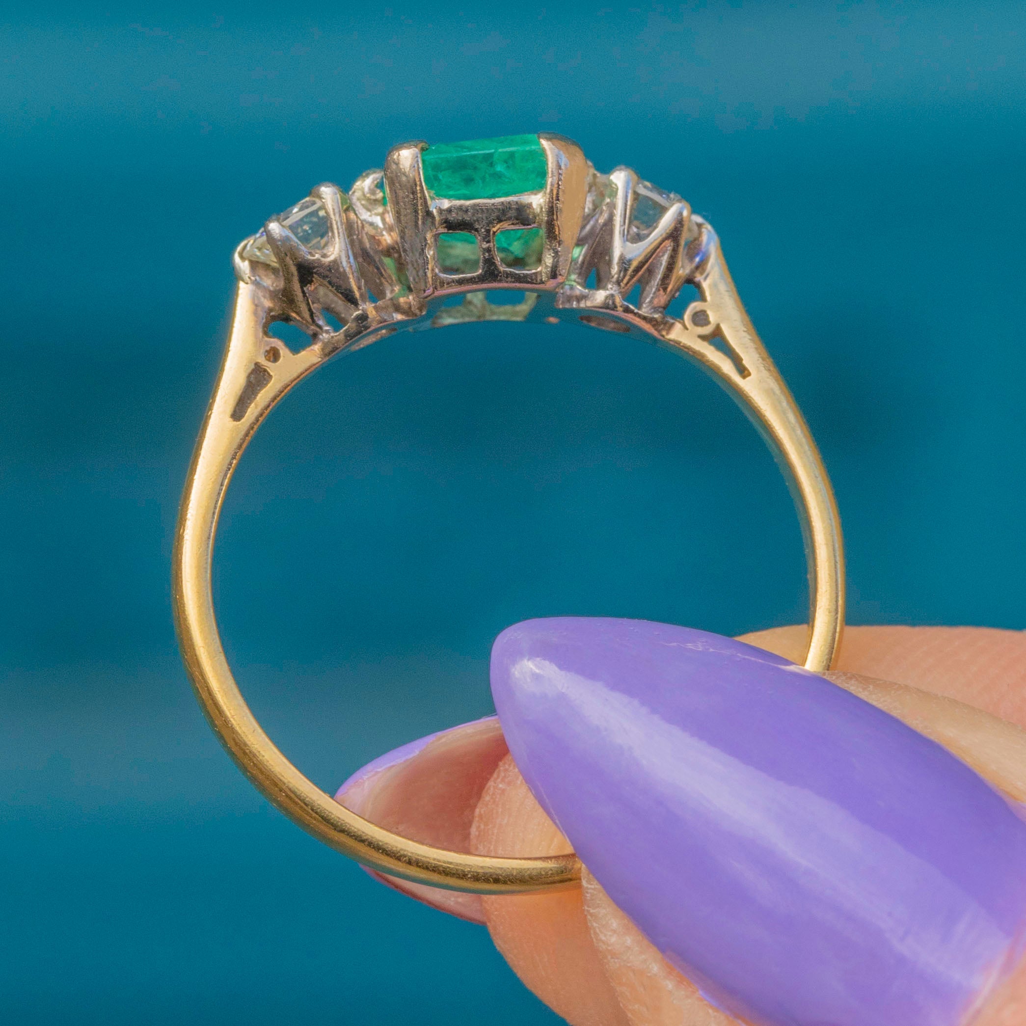 A divine 18ct Gold Emerald and Diamond trilogy ring to adorn your hand! Crafted from an 18ct Gold with Platinum settings, this is a robust piece that you can pop onto your finger for a vibrant pop of colour.