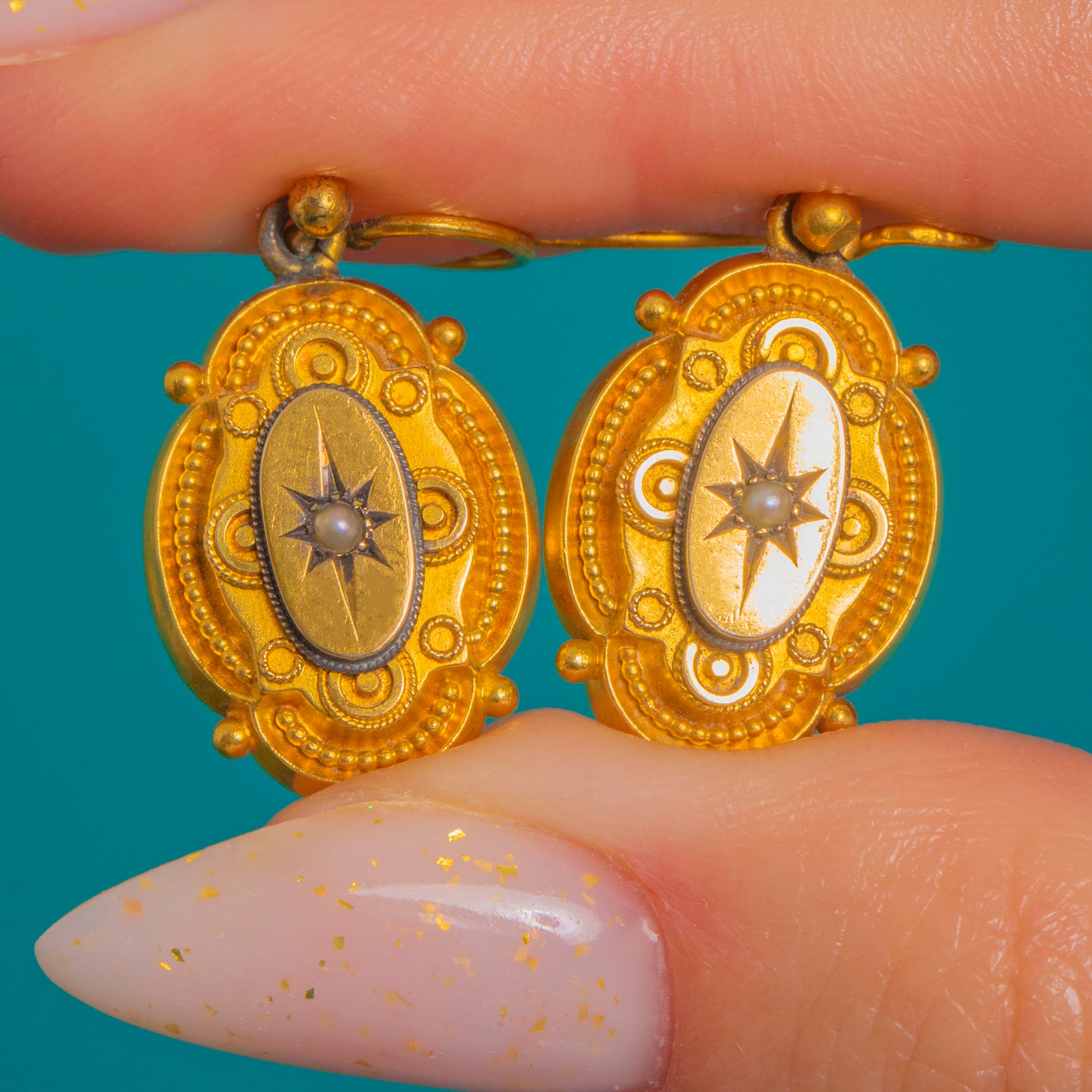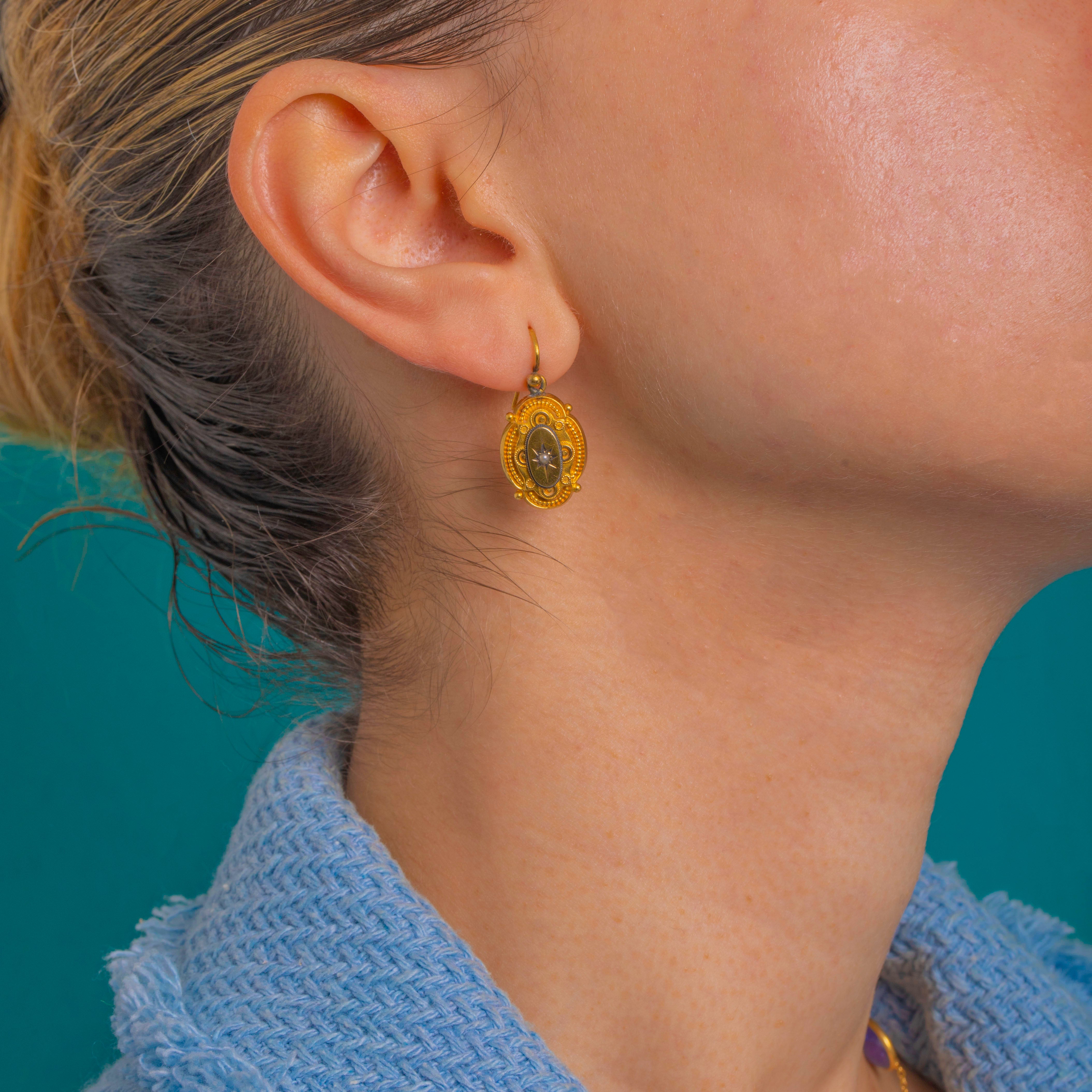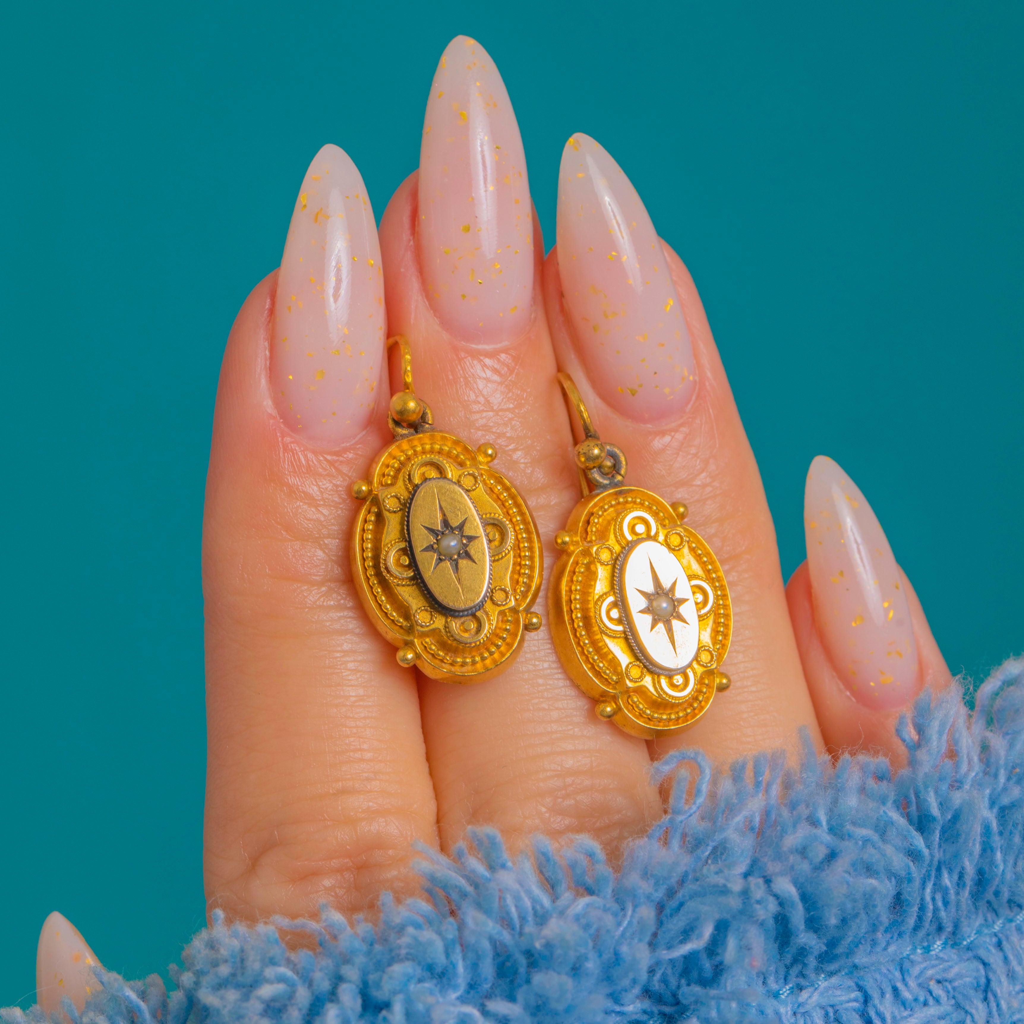 Elegant and ornate, these Victorian Etruscan Revival drop earrings are crafted in rich 18ct Gold. Each petite oval plaque is adorned with applied granulation, cannetille scrolls and a beaded border, centring an engraved eight‑point star set with a tiny white Pearl. The intricate wirework and beaded accents create a beautiful interplay of texture and light.