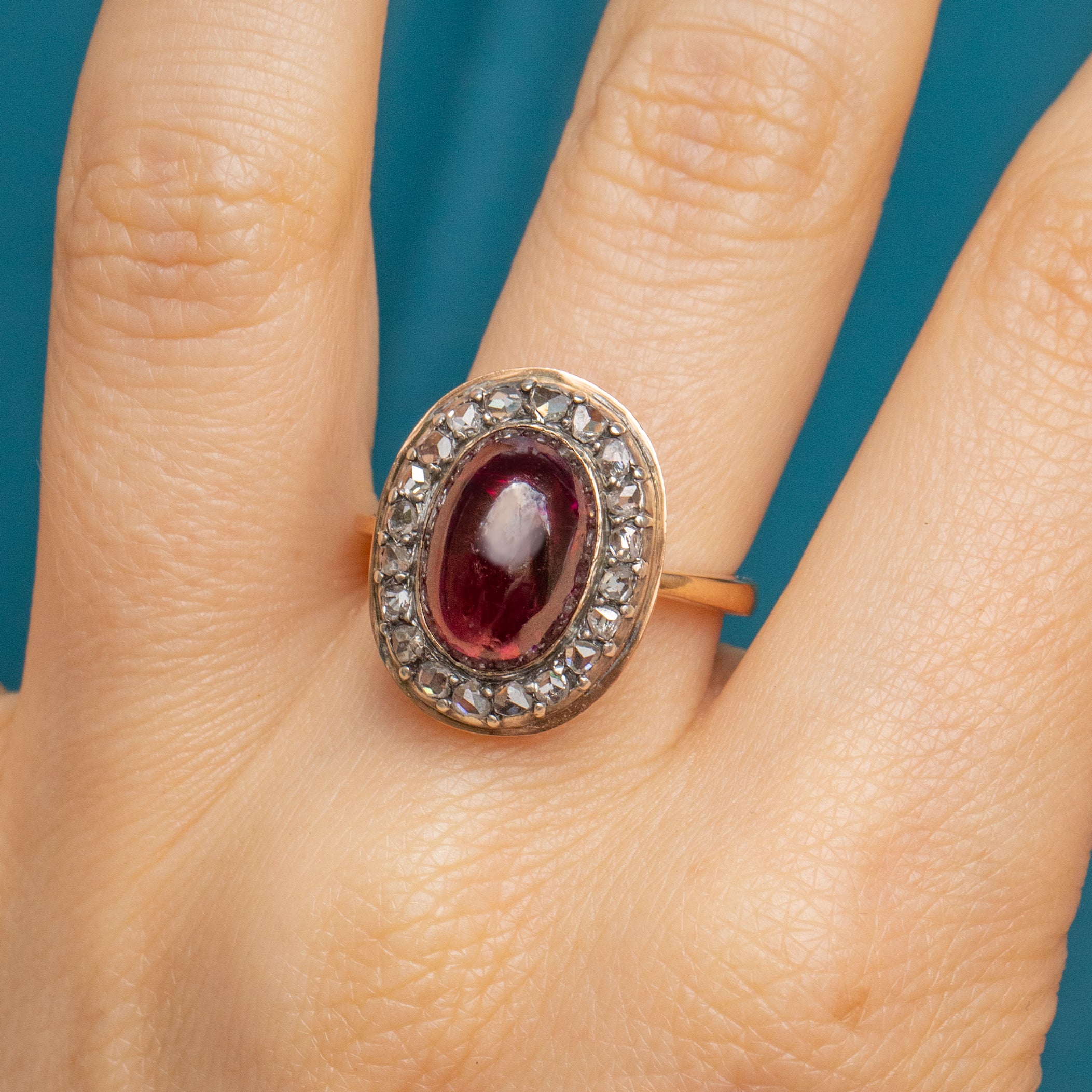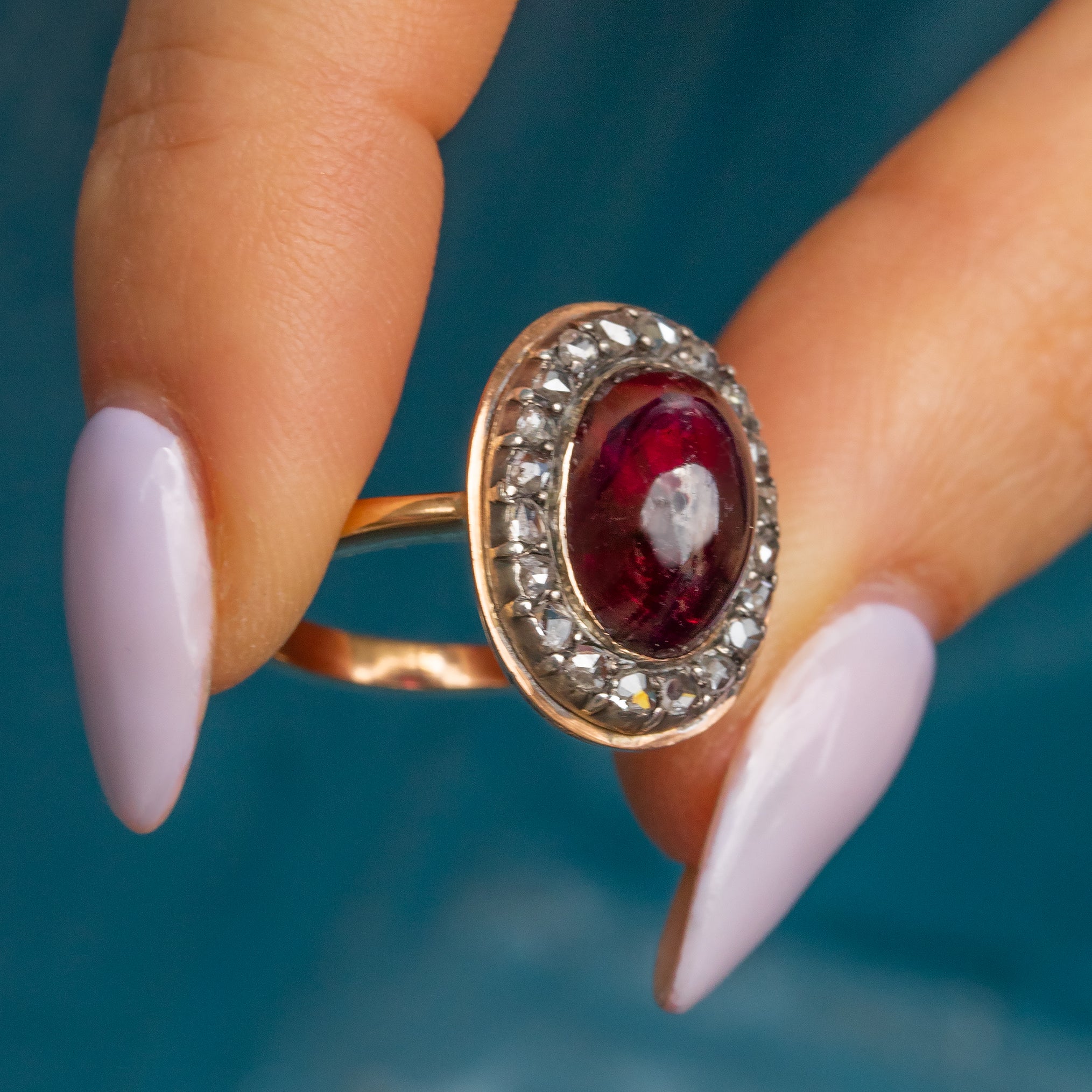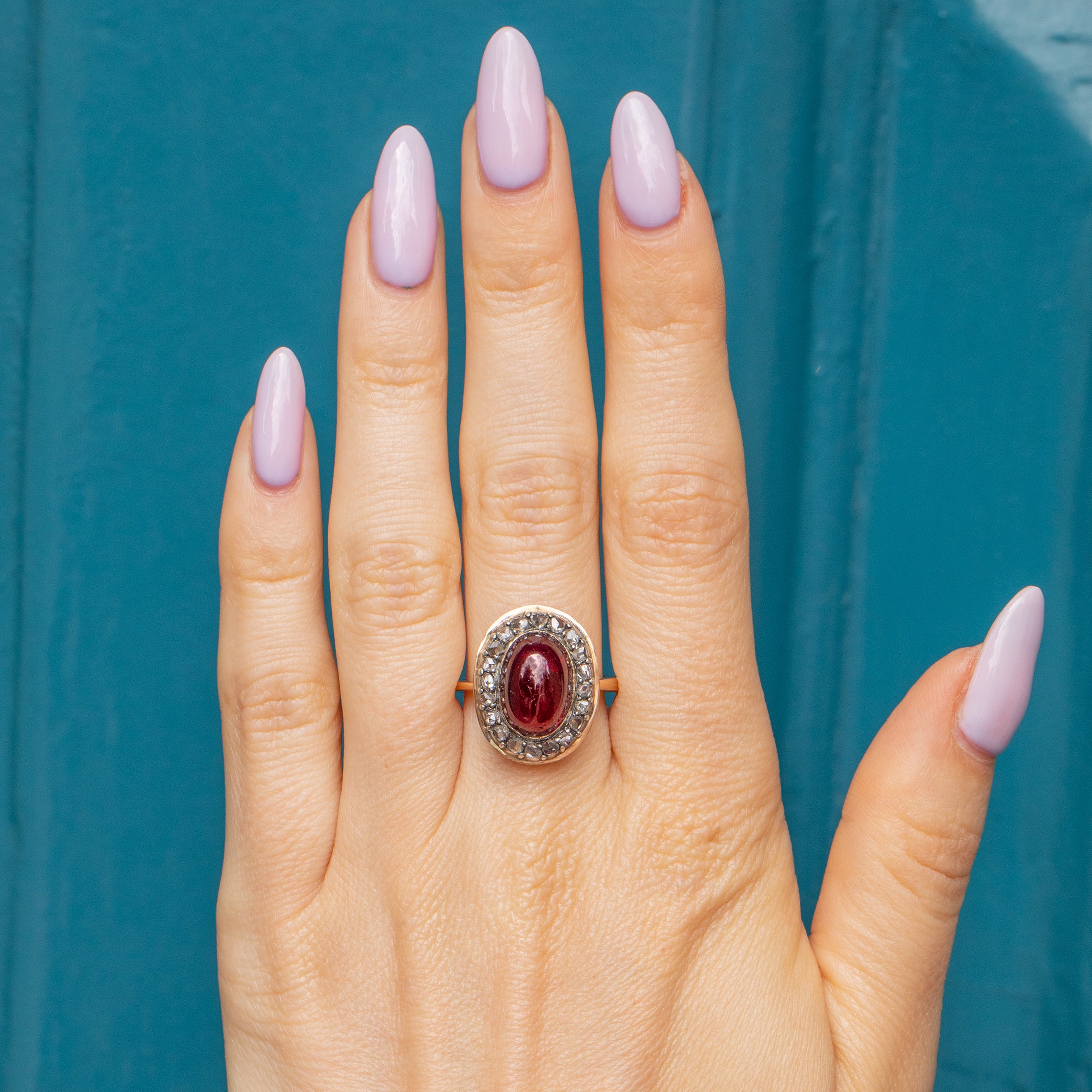 This is a sublime 18ct Gold Garnet cabochon Diamond cluster ring! Visually striking and technically beautiful, this ring emanates sophistication and seduction.