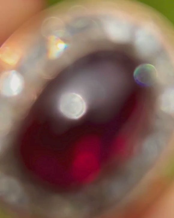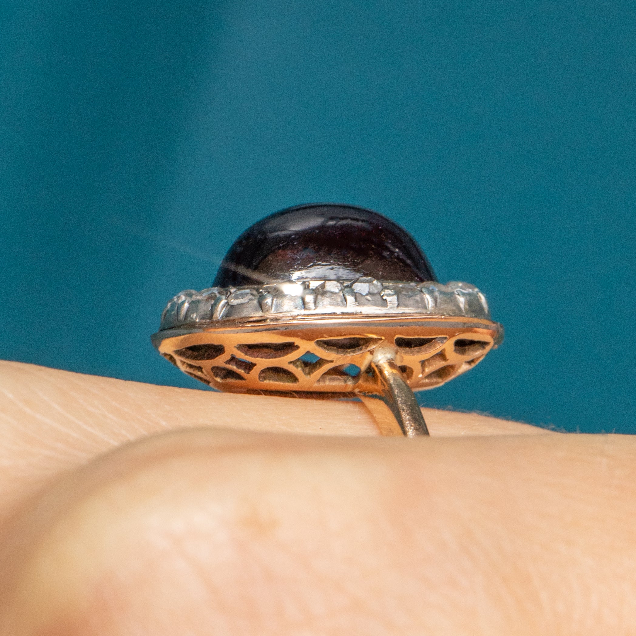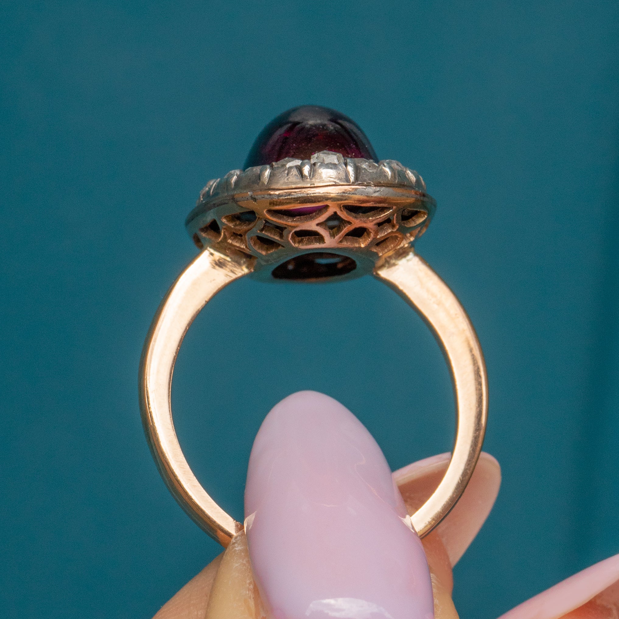 This is a sublime 18ct Gold Garnet cabochon Diamond cluster ring! Visually striking and technically beautiful, this ring emanates sophistication and seduction.