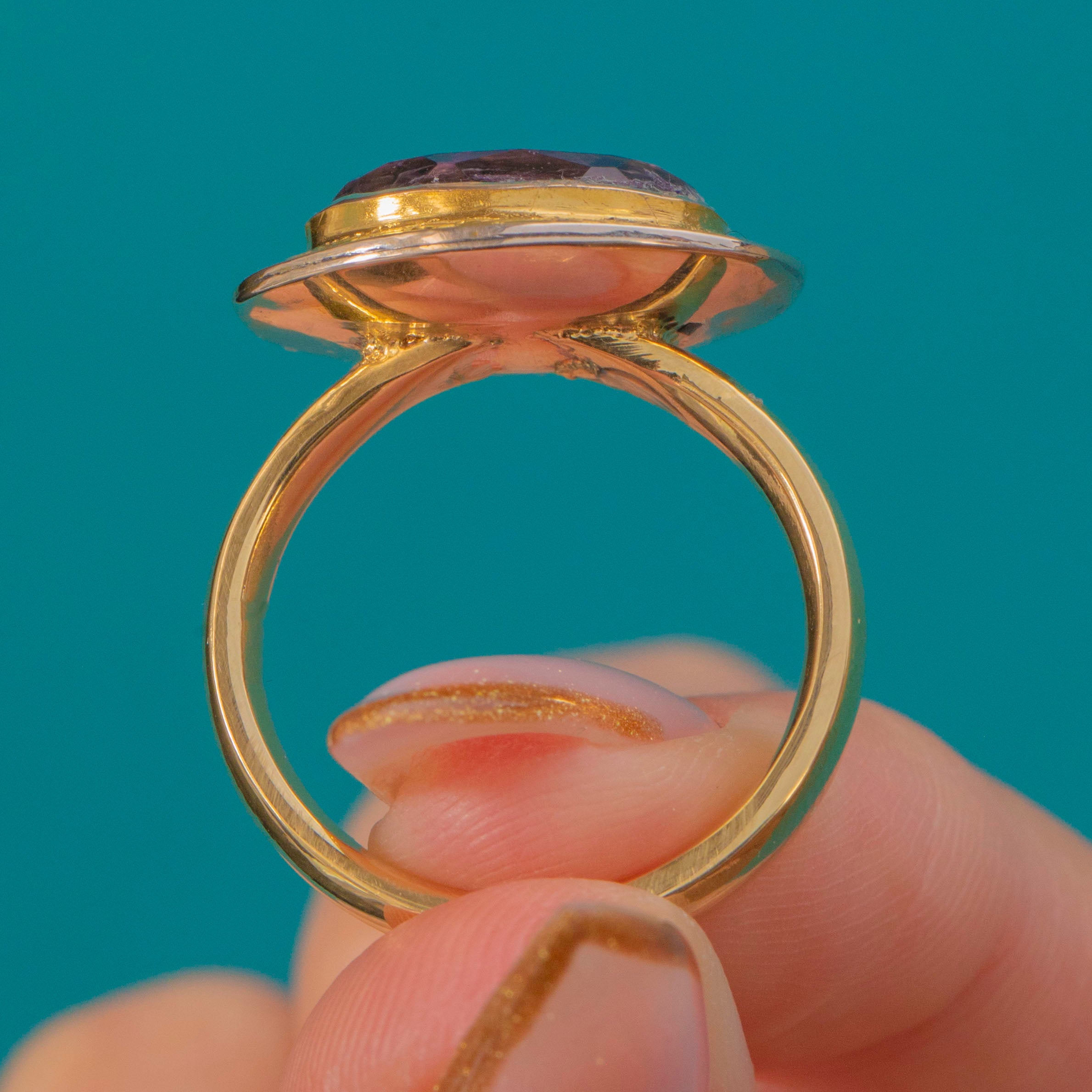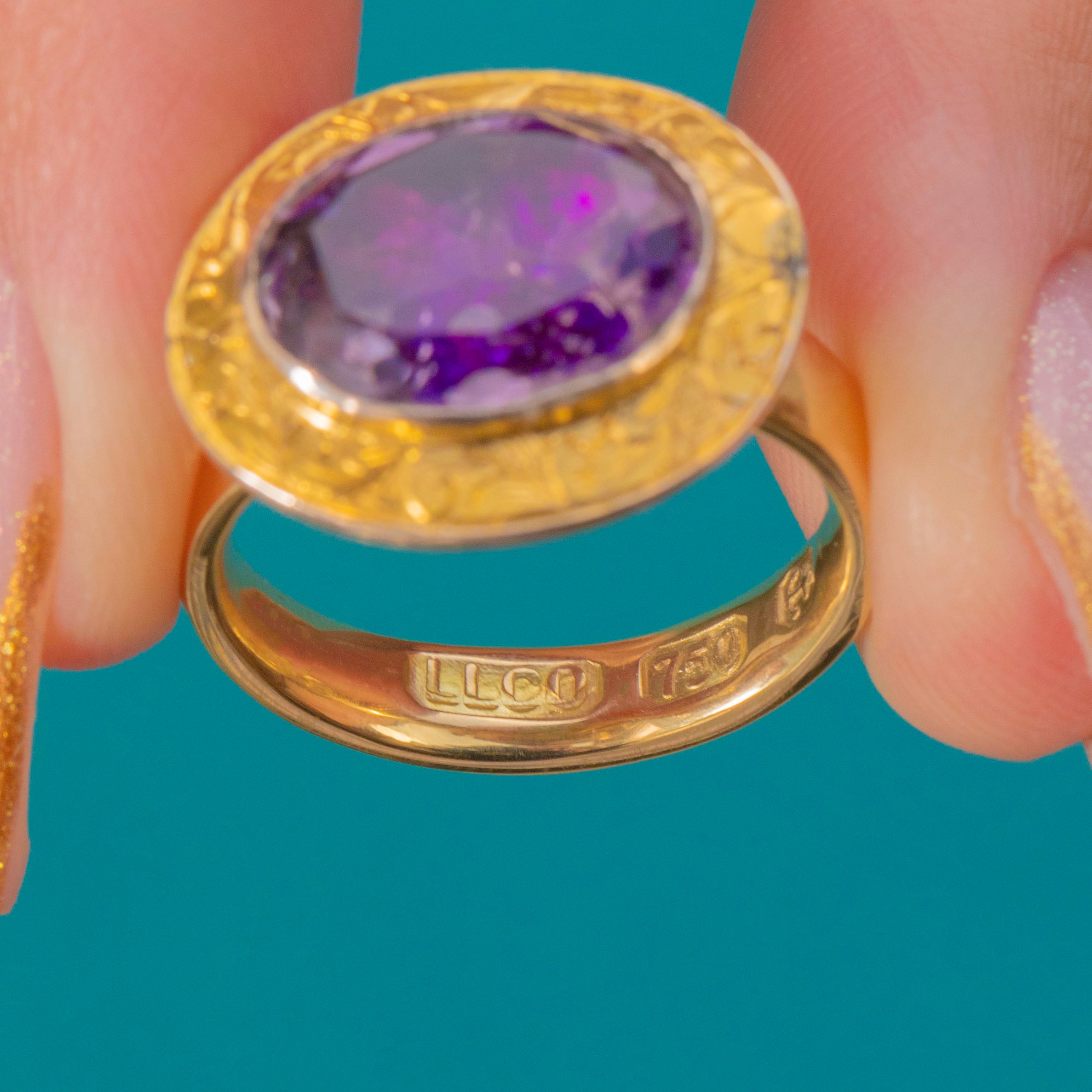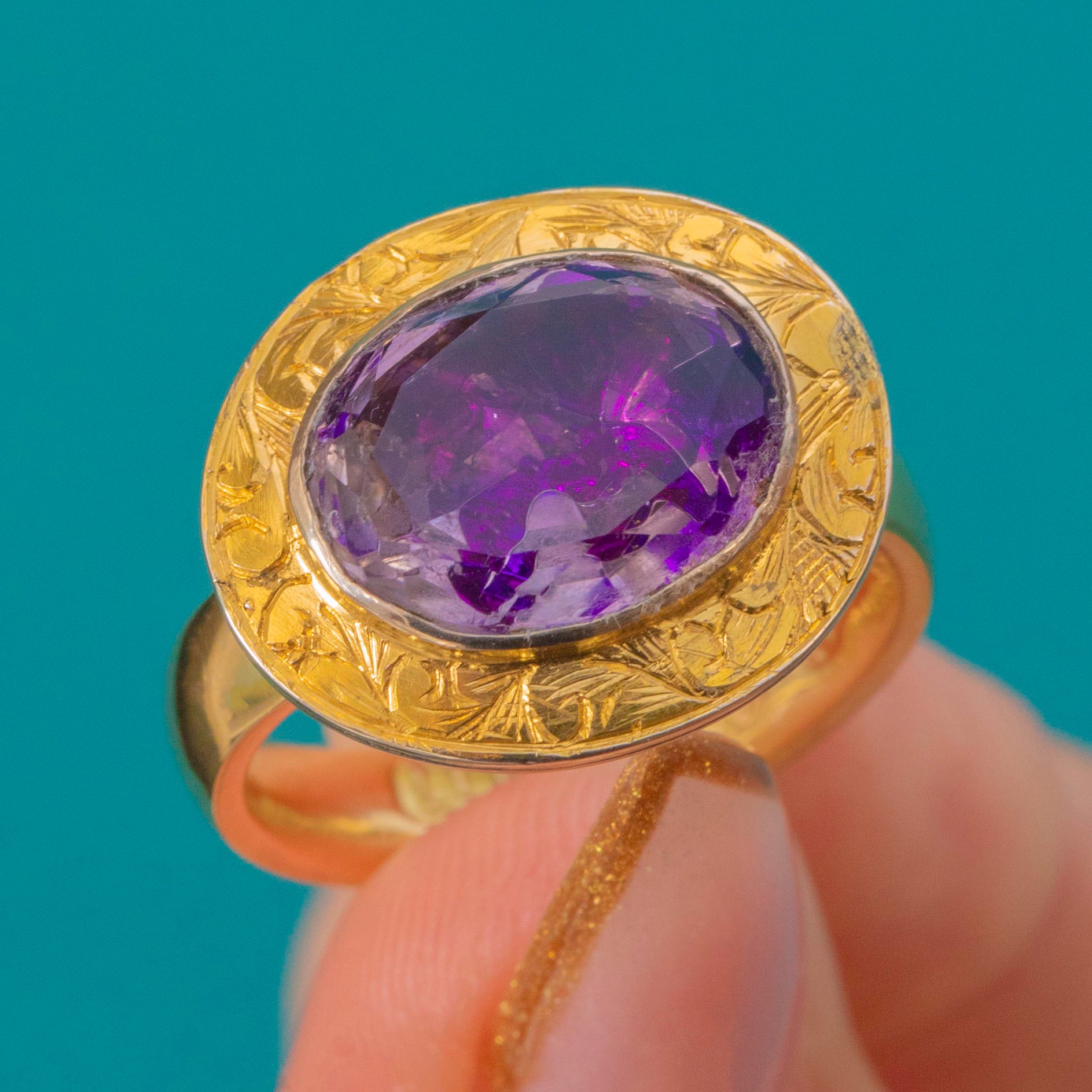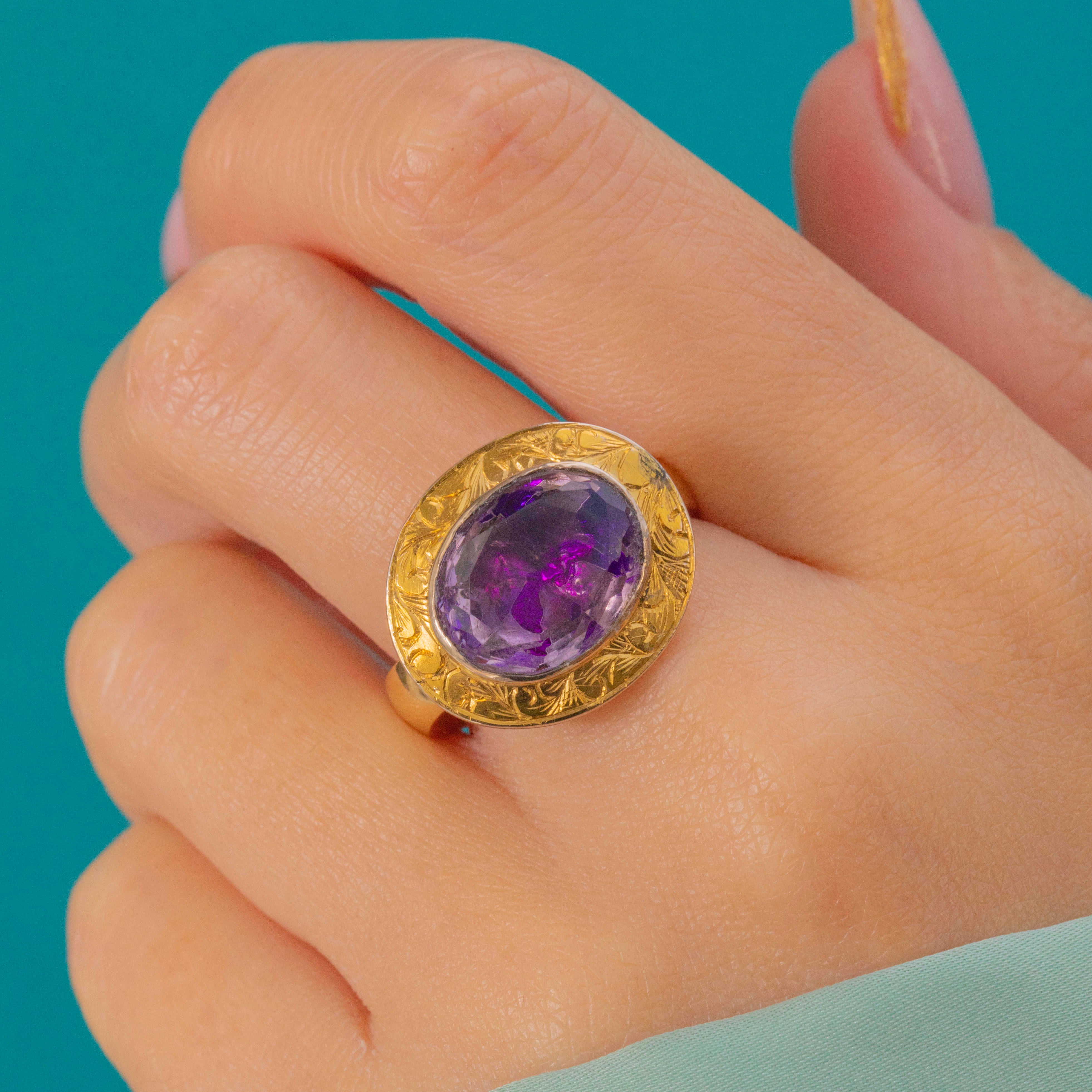 EXCELLENT: The foiled Amethyst shows exceptional colour and brilliance with only the gentle signs of age. The 18ct Gold band is newly made, substantial, and flawlessly polished, providing strength and elegance to this remarkable conversion. A perfect blend of antique artistry and contemporary luxury.