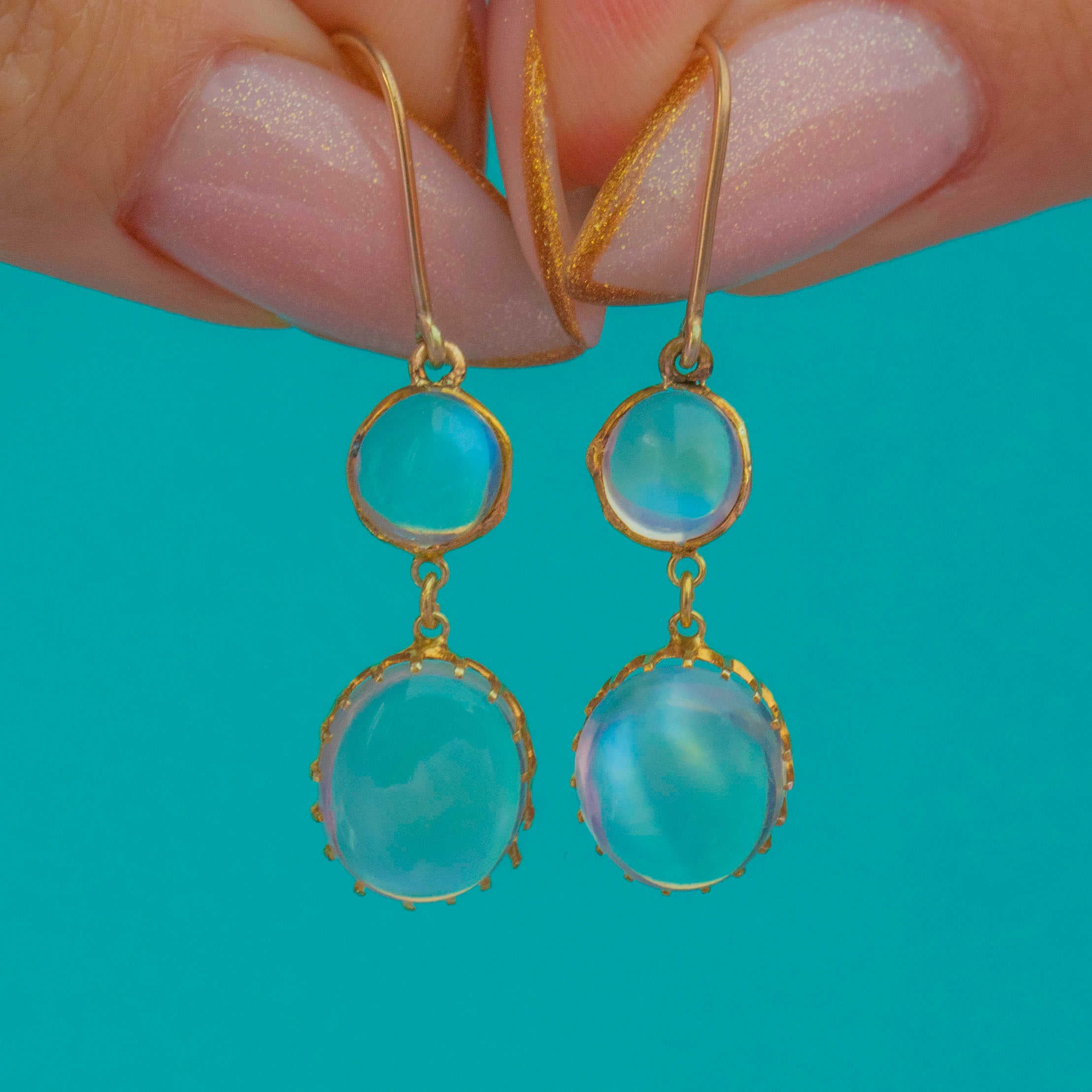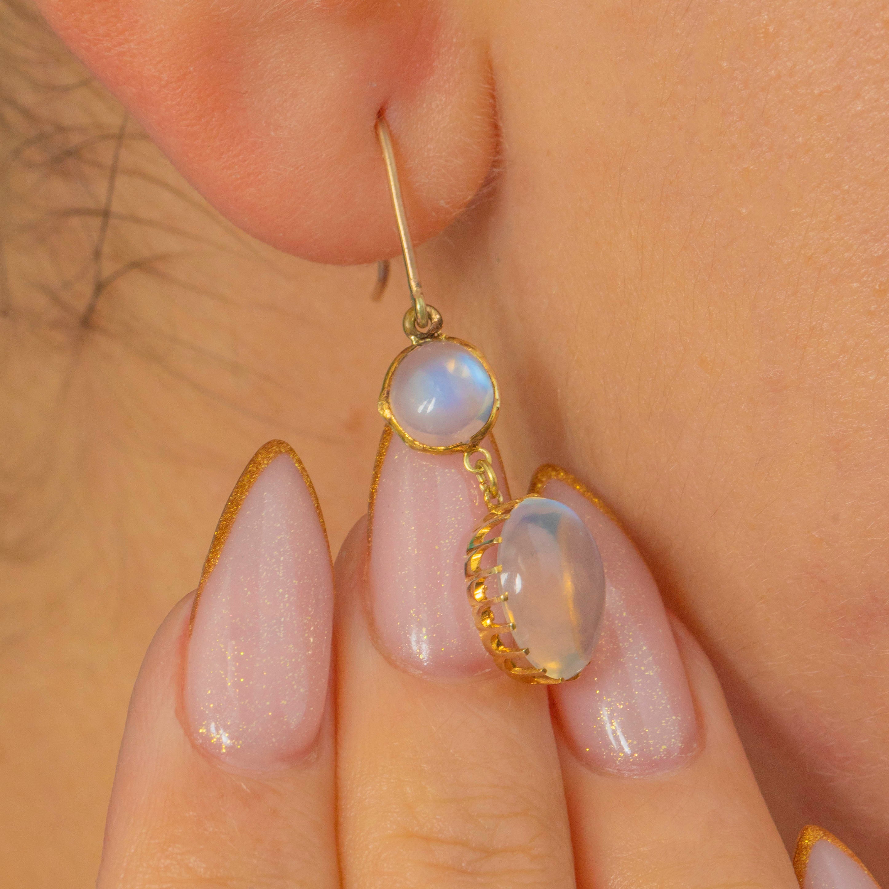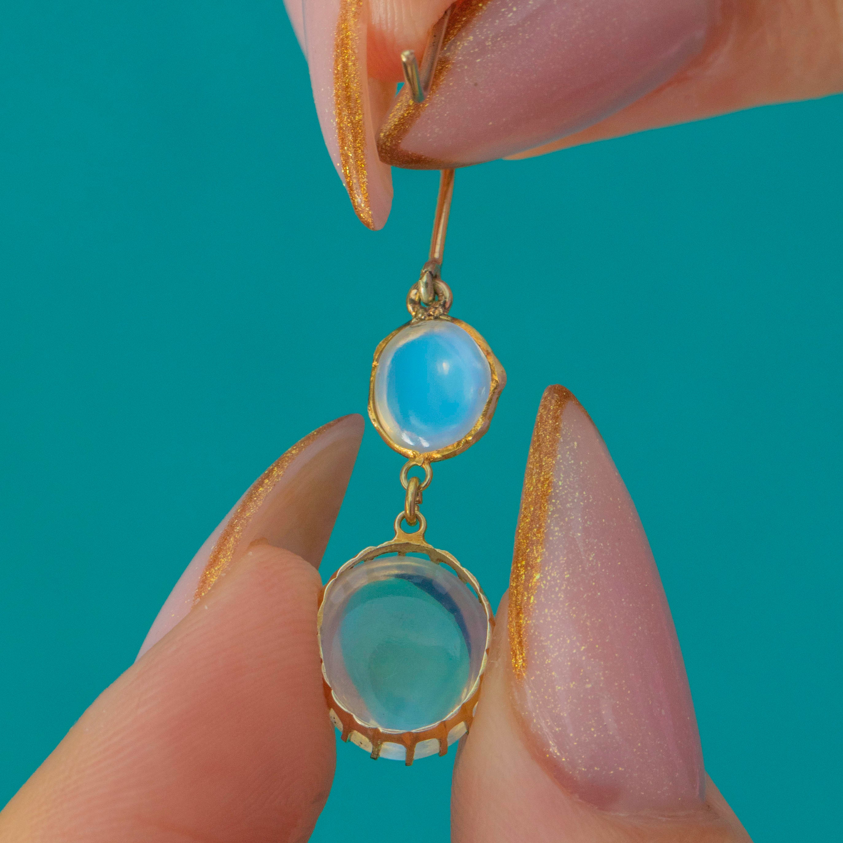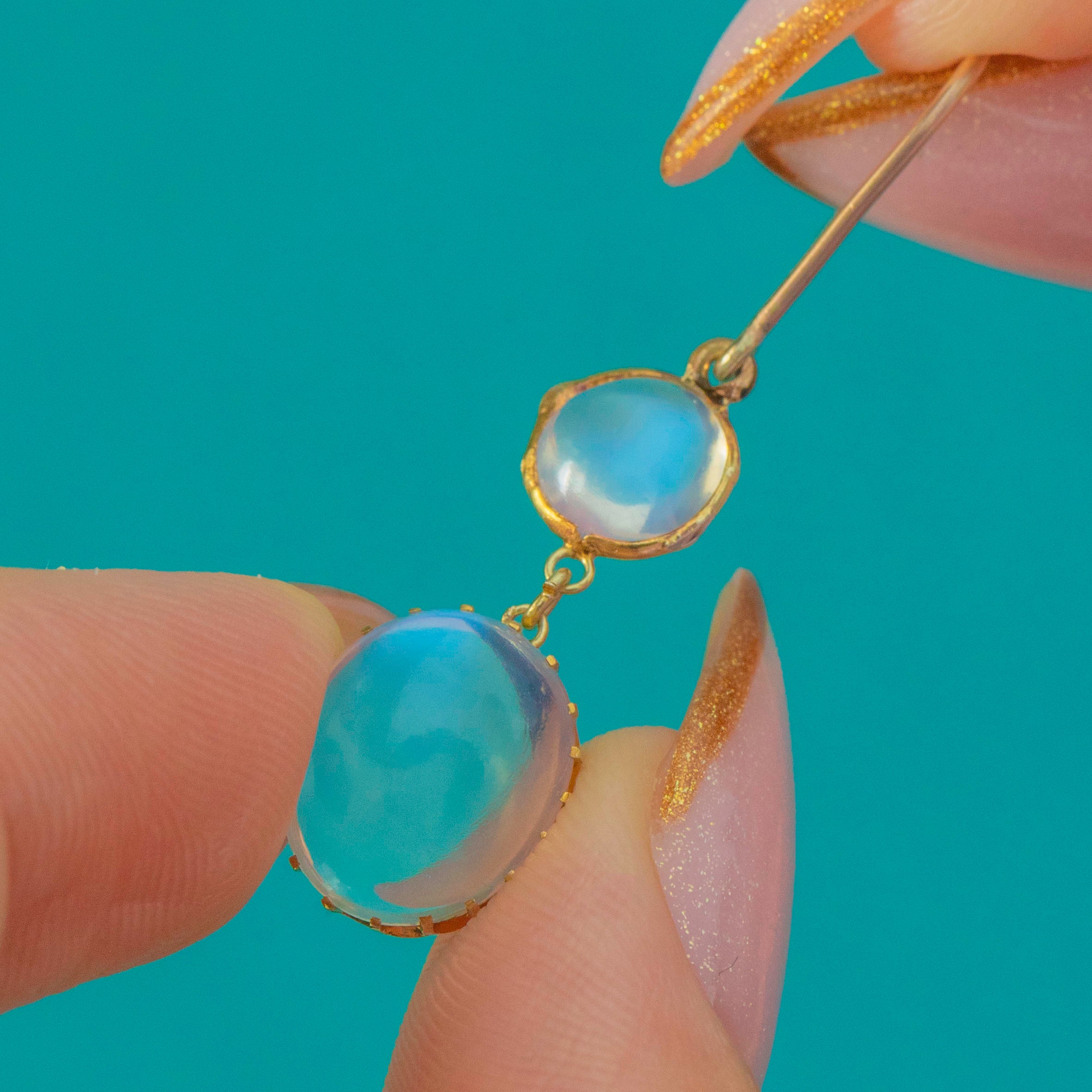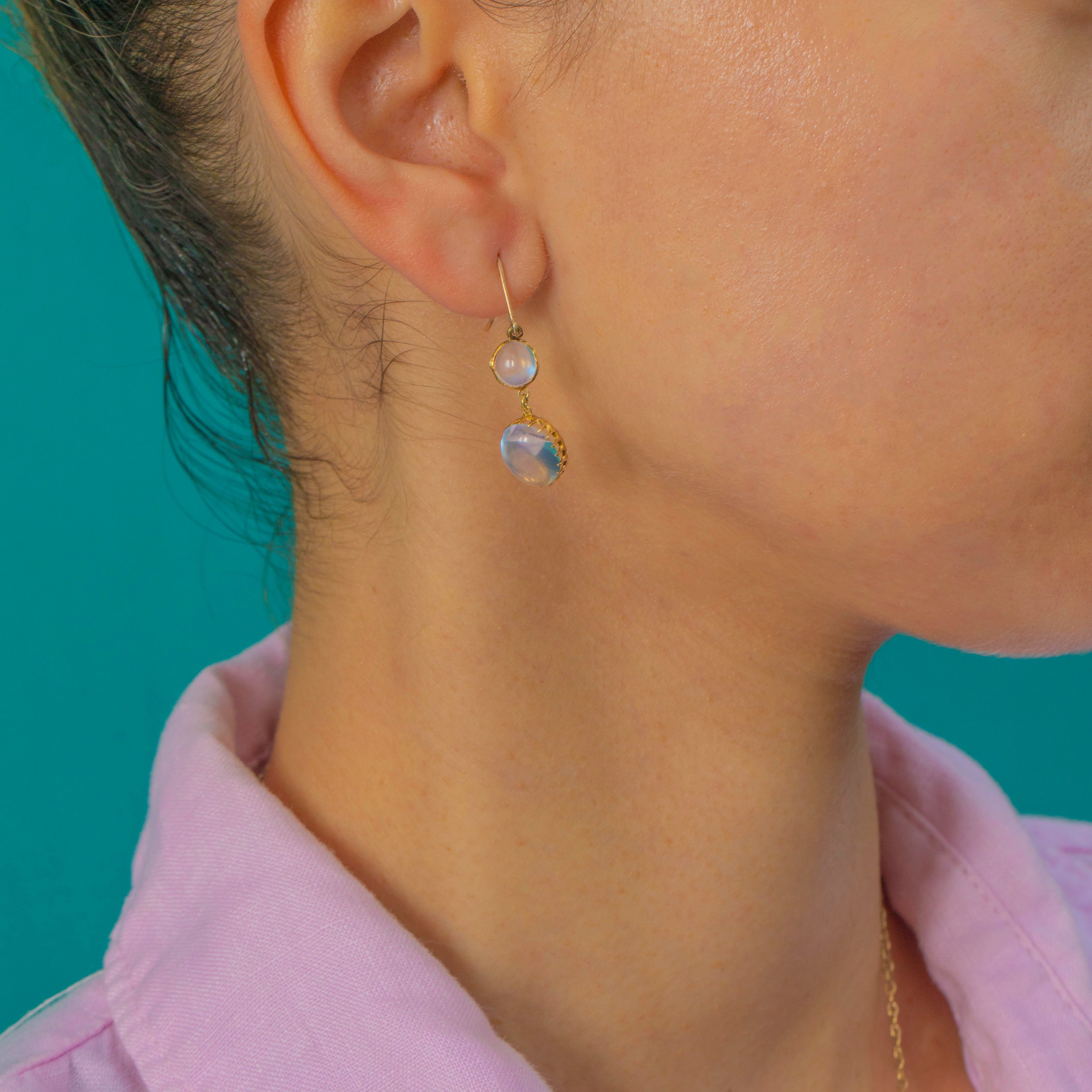 These glowing Victorian Moonstone earrings boast an ethereal double-drop design crafted in rich 18ct Gold. Each earring features a luminous round Moonstone above a larger oval cabochon, creating a beautiful play of adularescent blue light with every movement.