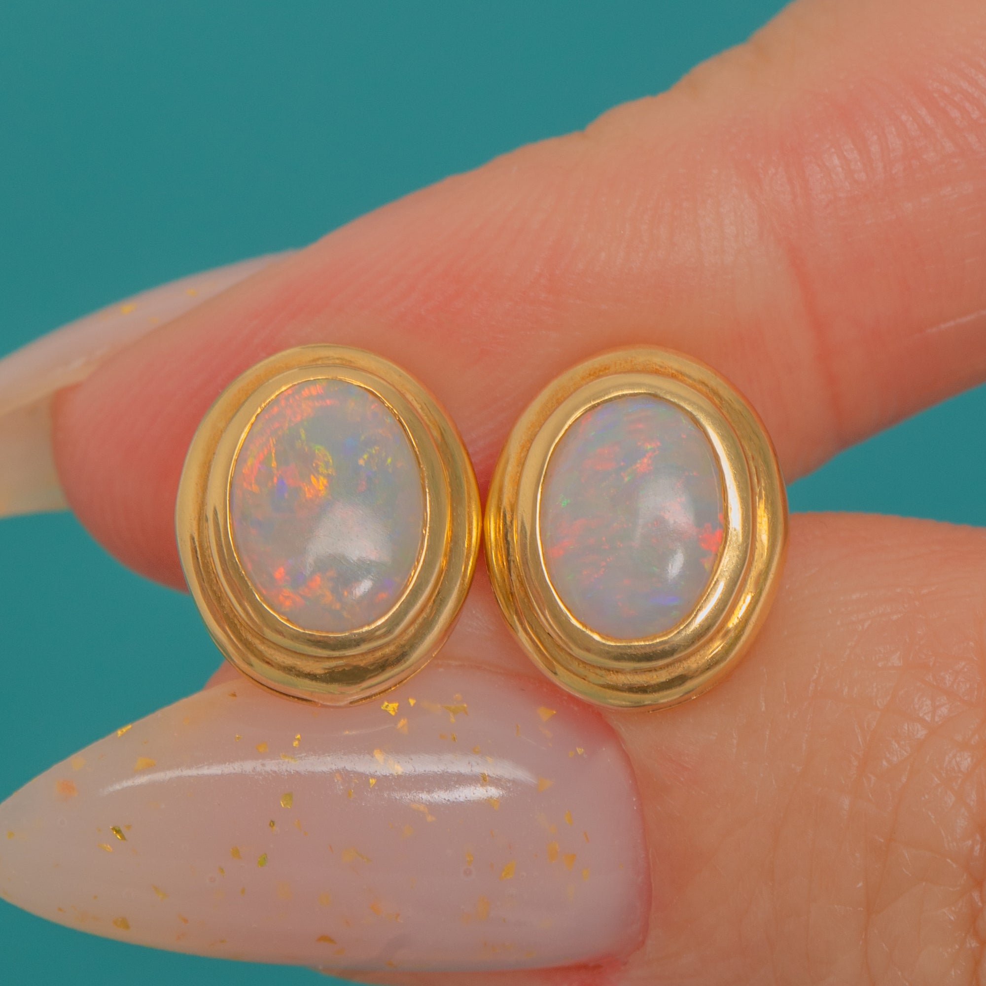 Understated and luminous, these Vintage Opal stud earrings are crafted in glowing 18ct Gold with a sleek rubover silhouette. Each oval cabochon Opal shimmers with lively play-of-colour—flashes of red, orange, green and blue—beautifully framed by a smooth stepped bezel for a refined, modernist finish.