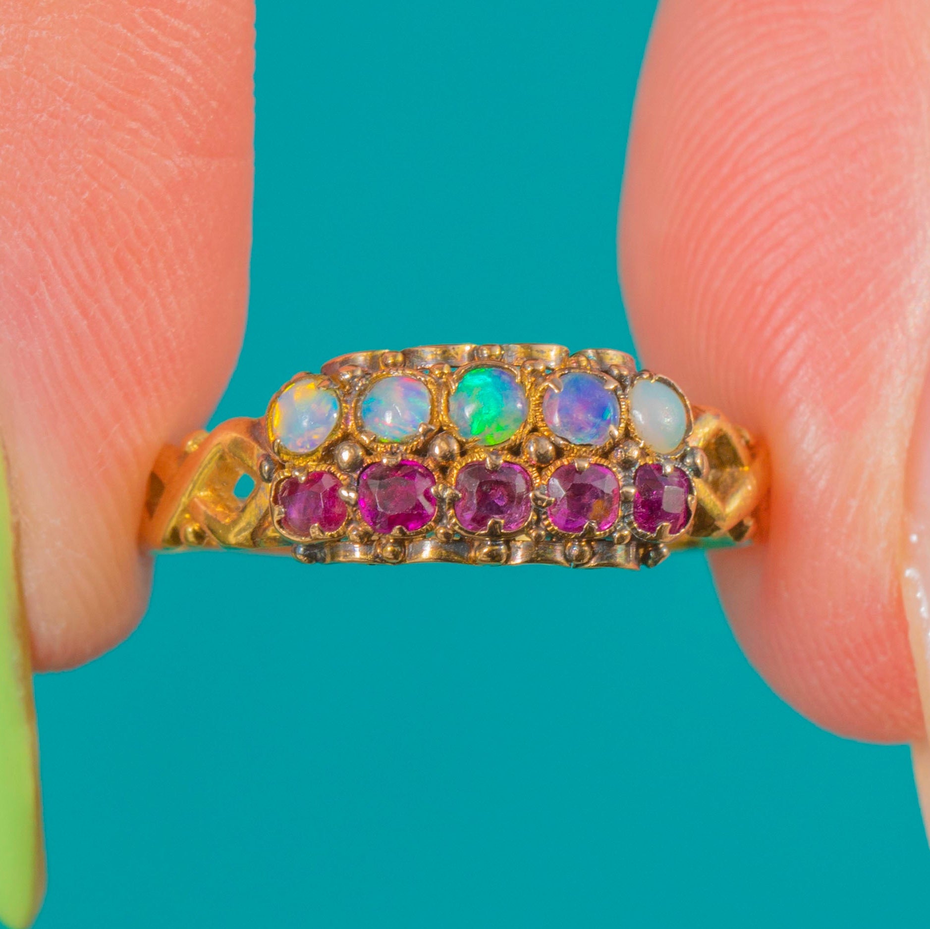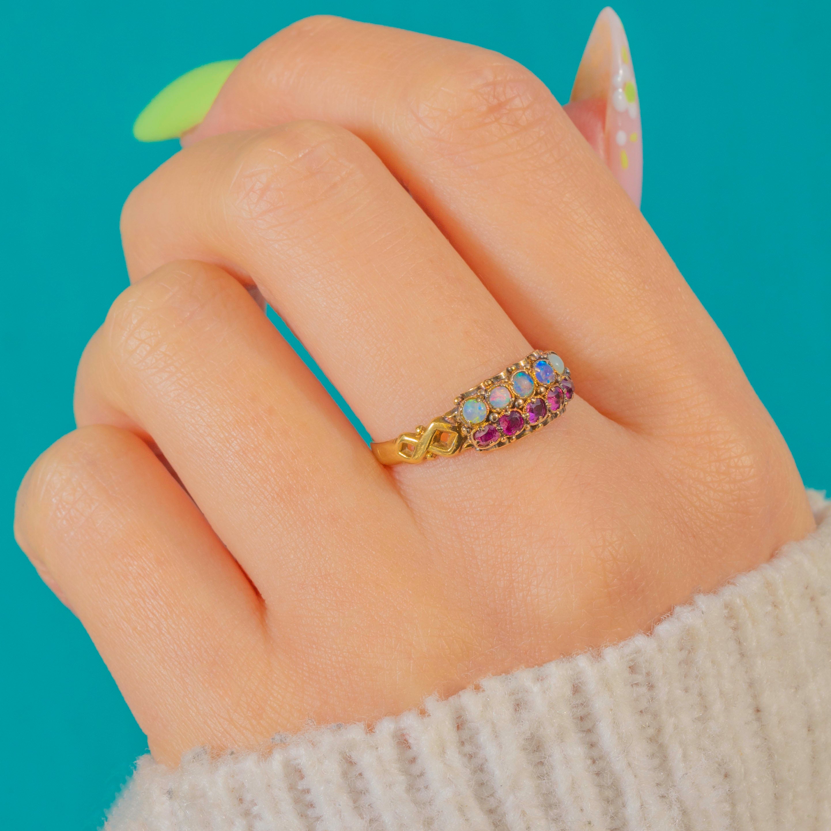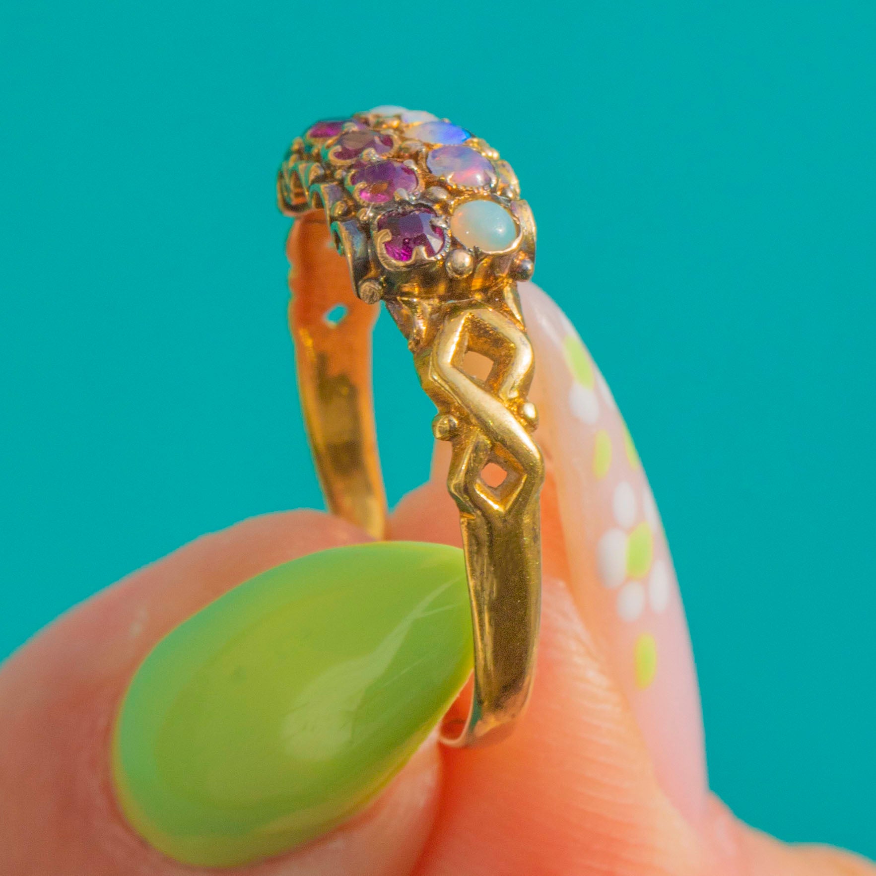 A charming Victorian two-row cluster ring, crafted in rich 18ct Gold and set with petite Opals and Rubies. The Opals glow with a soft play-of-colour, beautifully contrasted by the vivid sparkle of the Rubies. Delicate beaded settings, a pierced gallery and decorative openwork shoulders give this piece its unmistakably antique character.