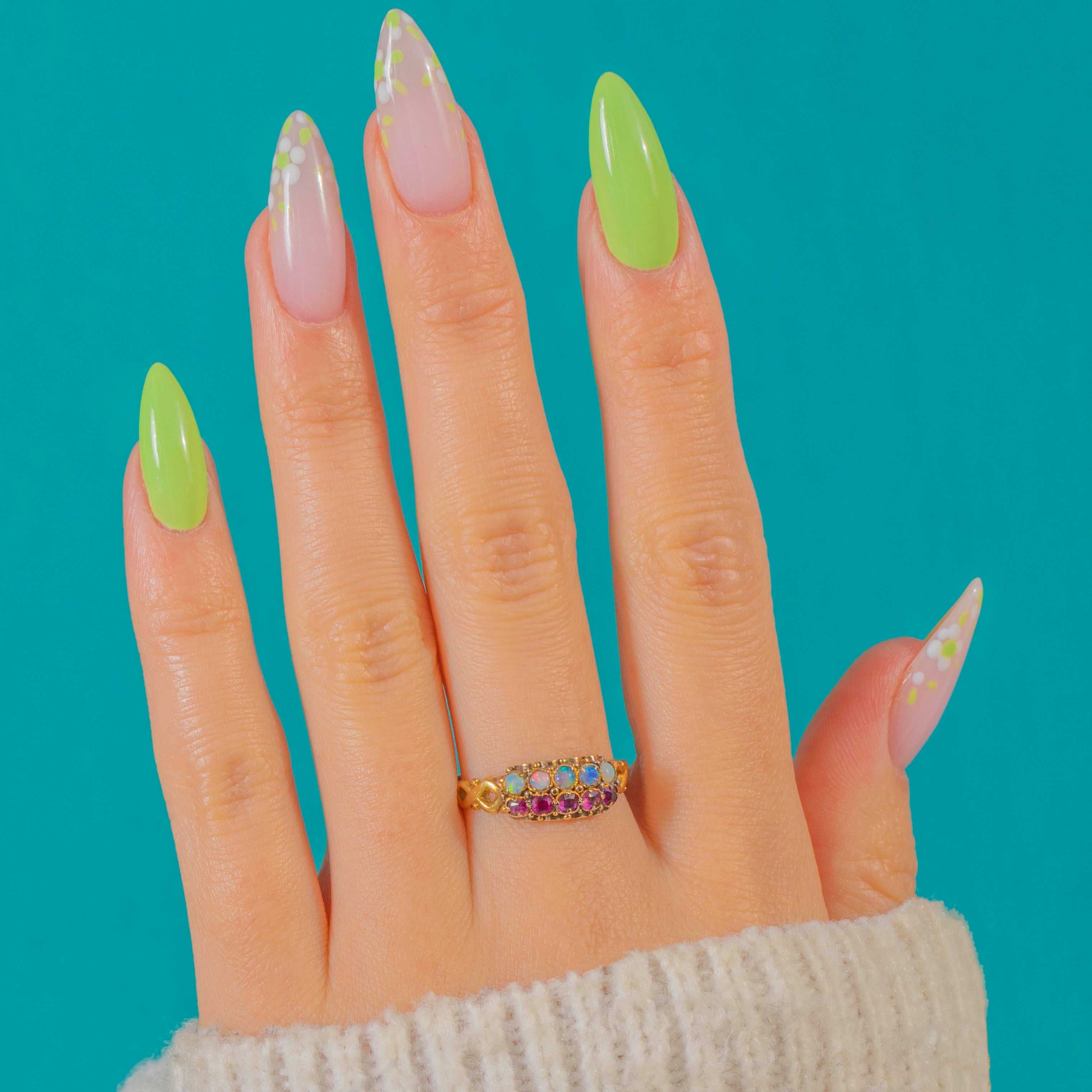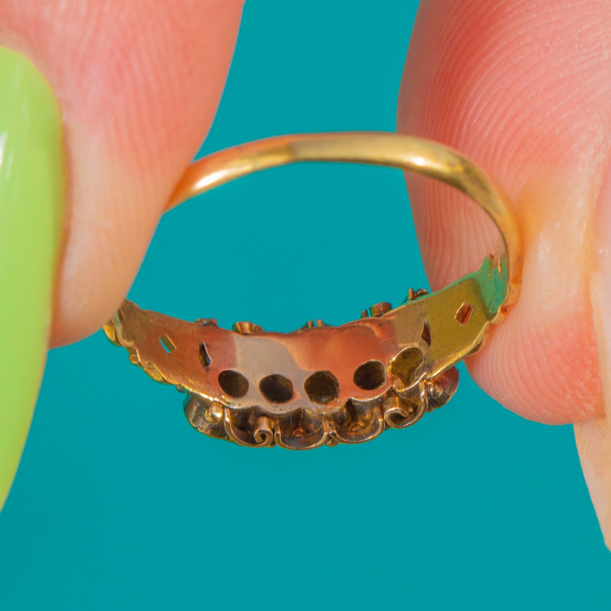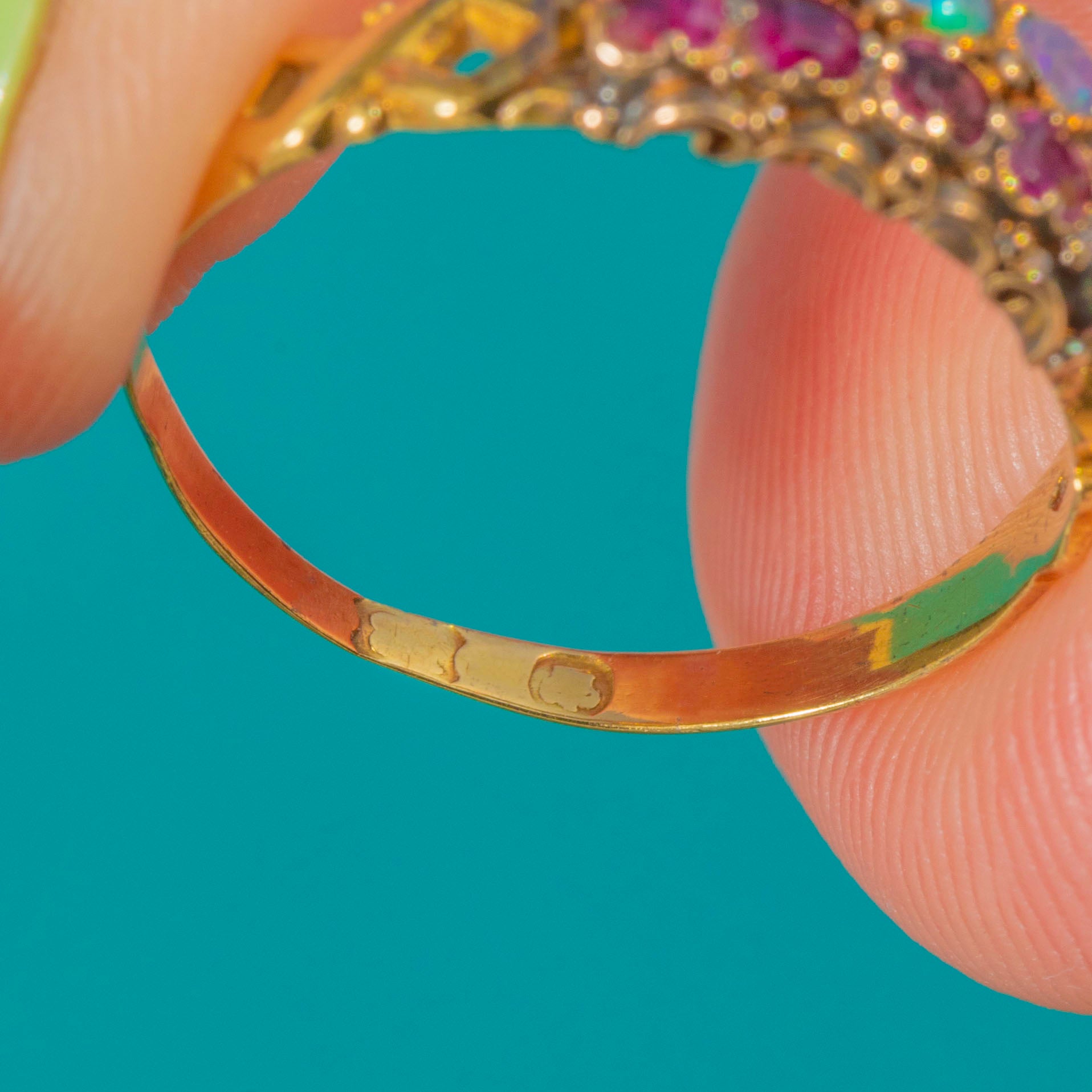 A charming Victorian two-row cluster ring, crafted in rich 18ct Gold and set with petite Opals and Rubies. The Opals glow with a soft play-of-colour, beautifully contrasted by the vivid sparkle of the Rubies. Delicate beaded settings, a pierced gallery and decorative openwork shoulders give this piece its unmistakably antique character.