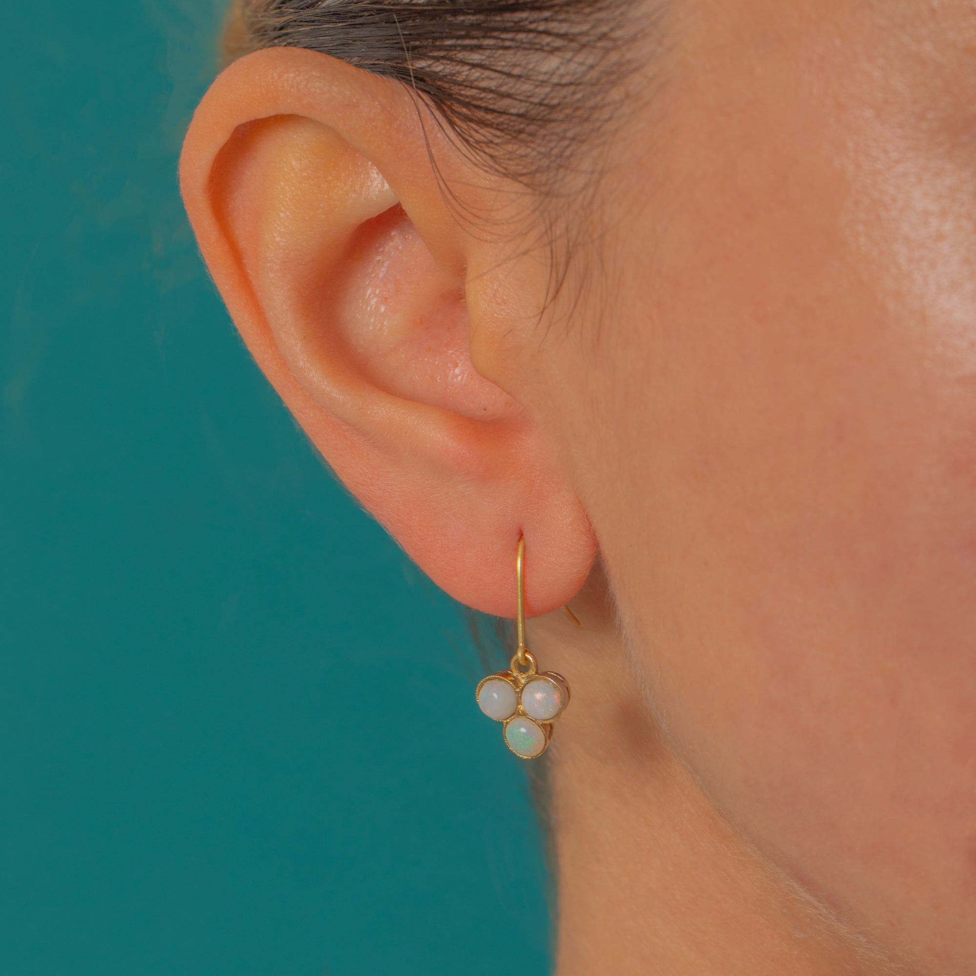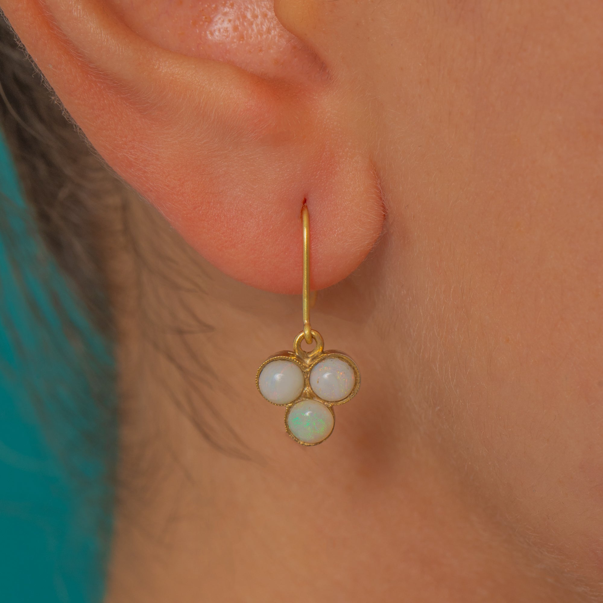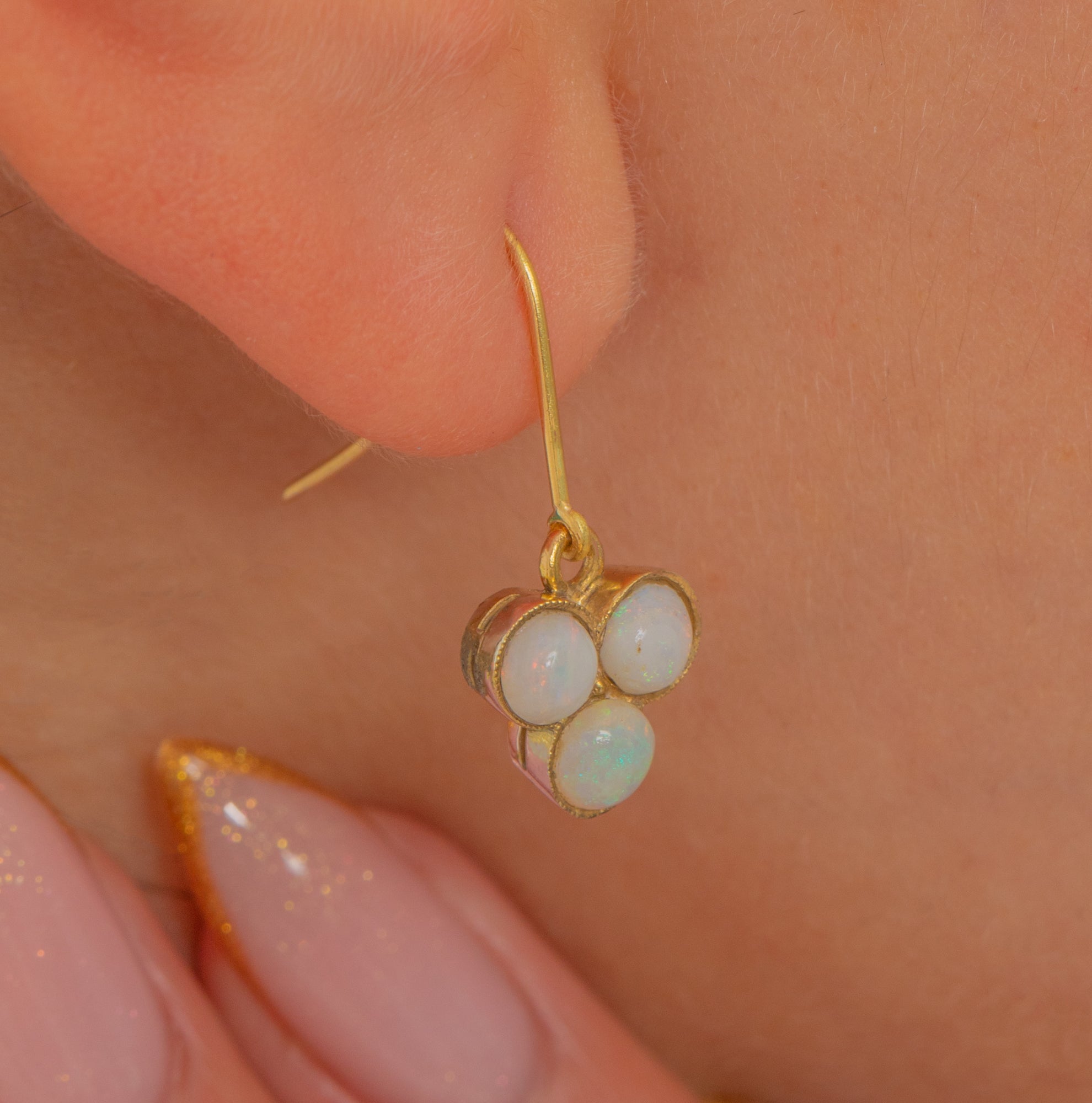 These beautiful Victorian 18ct Gold earrings showcase three natural Opals in a charming trefoil cluster design. Each Opal glows with a kaleidoscope of pastel blues, greens and pinks, creating a soft yet radiant look.