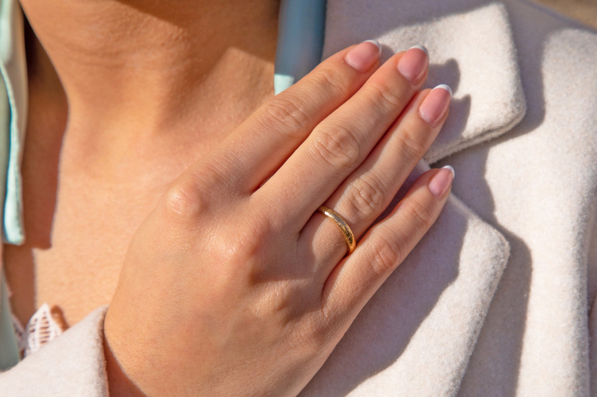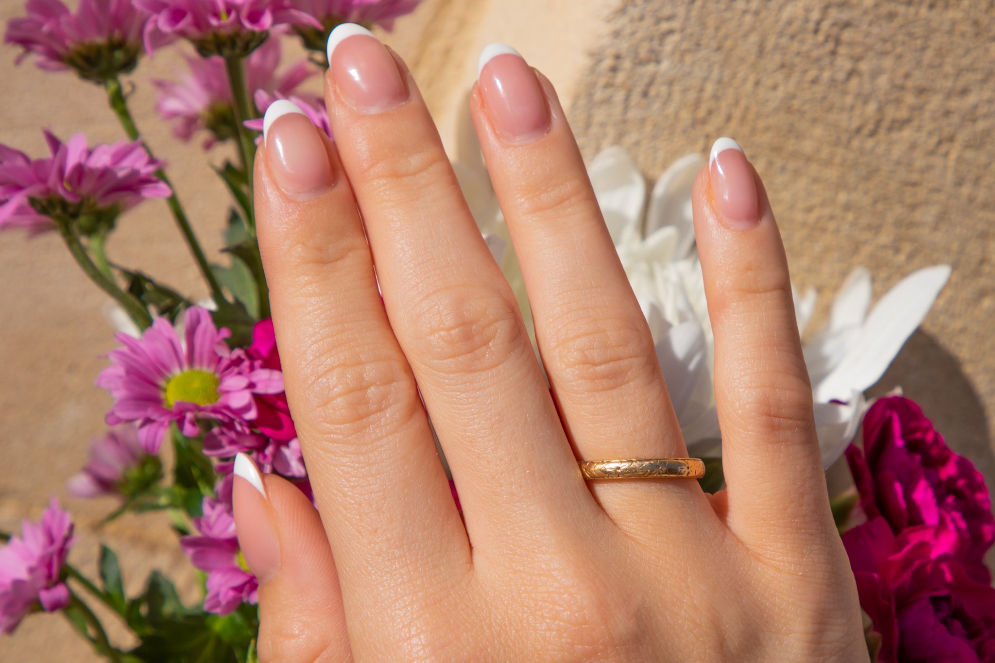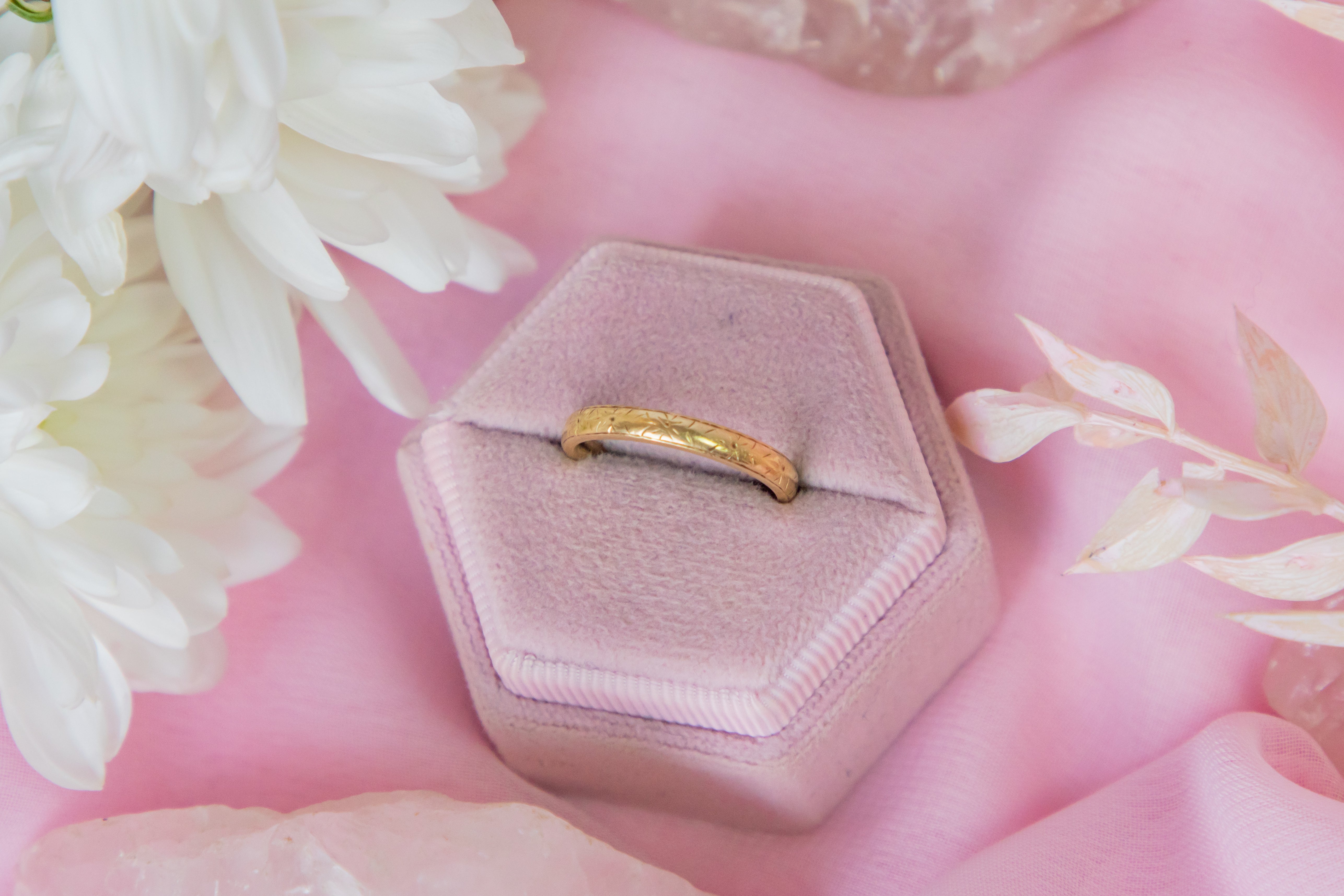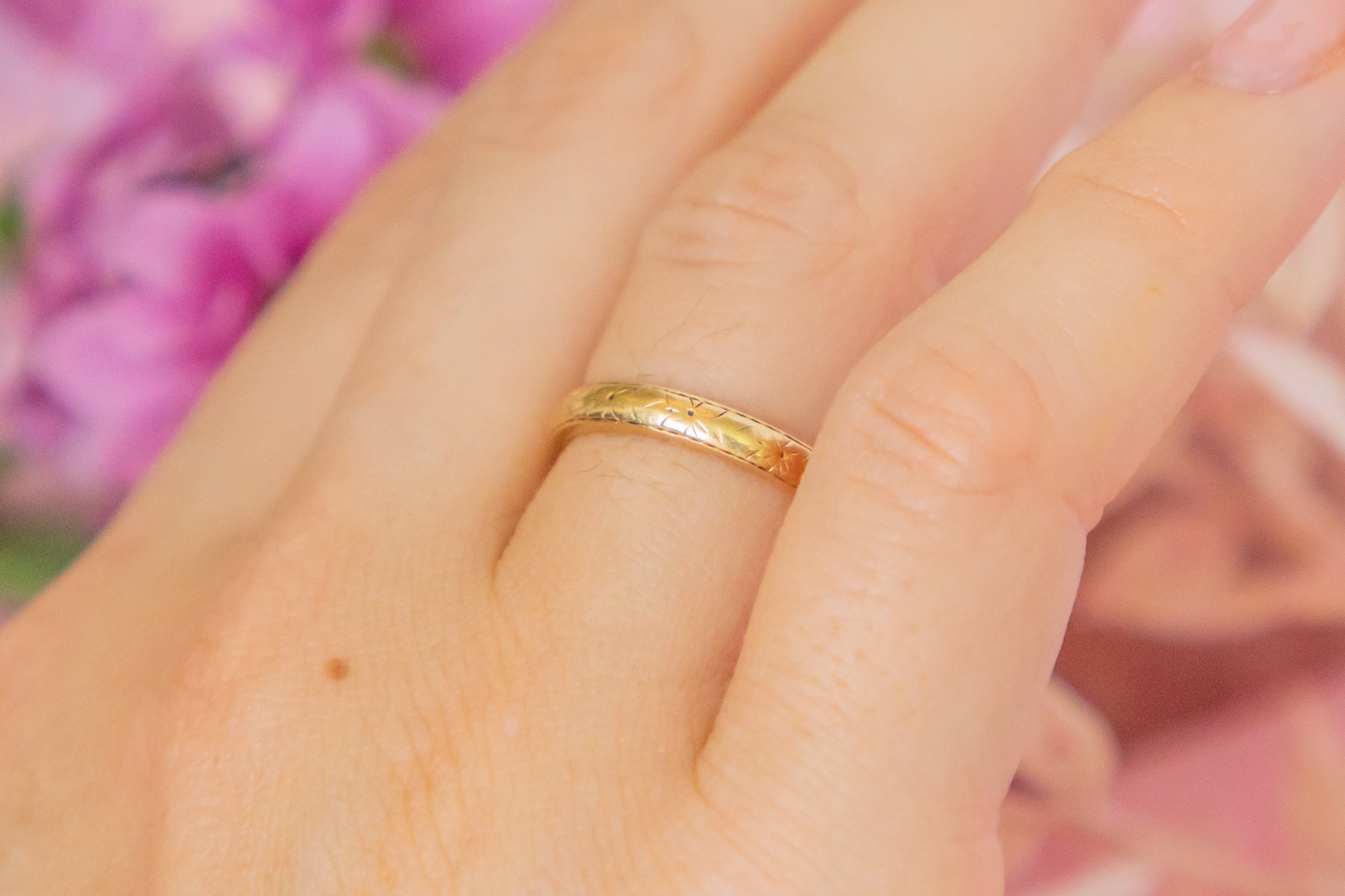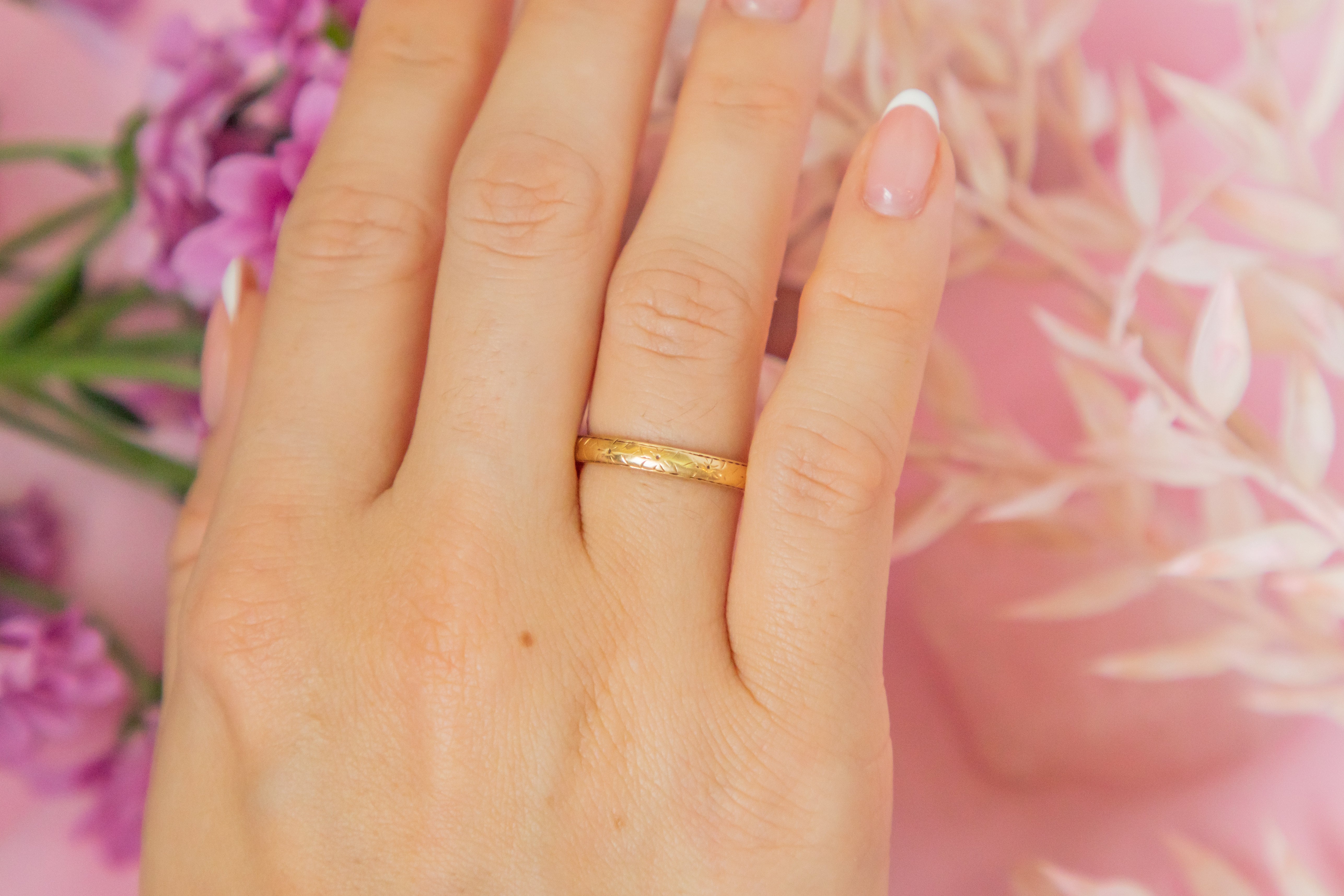 Our hearts have been stolen by this 18ct Gold orange blossom engraved wedding ring. The outside of the band has been covered in orange blossom flowers and the inside of the band is fittingly engraved with the word fidelity, which is exactly what orange blossoms symbolise.