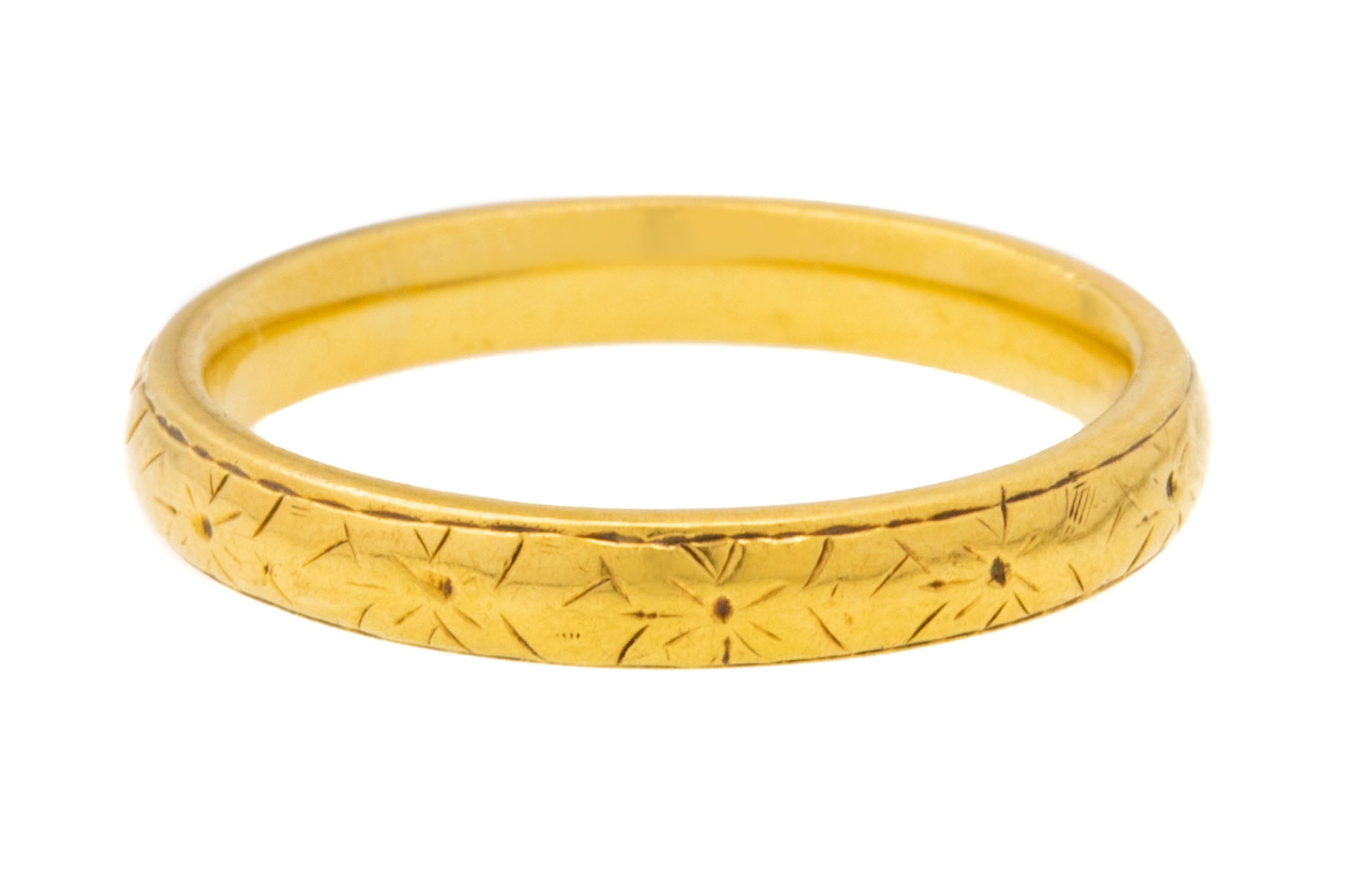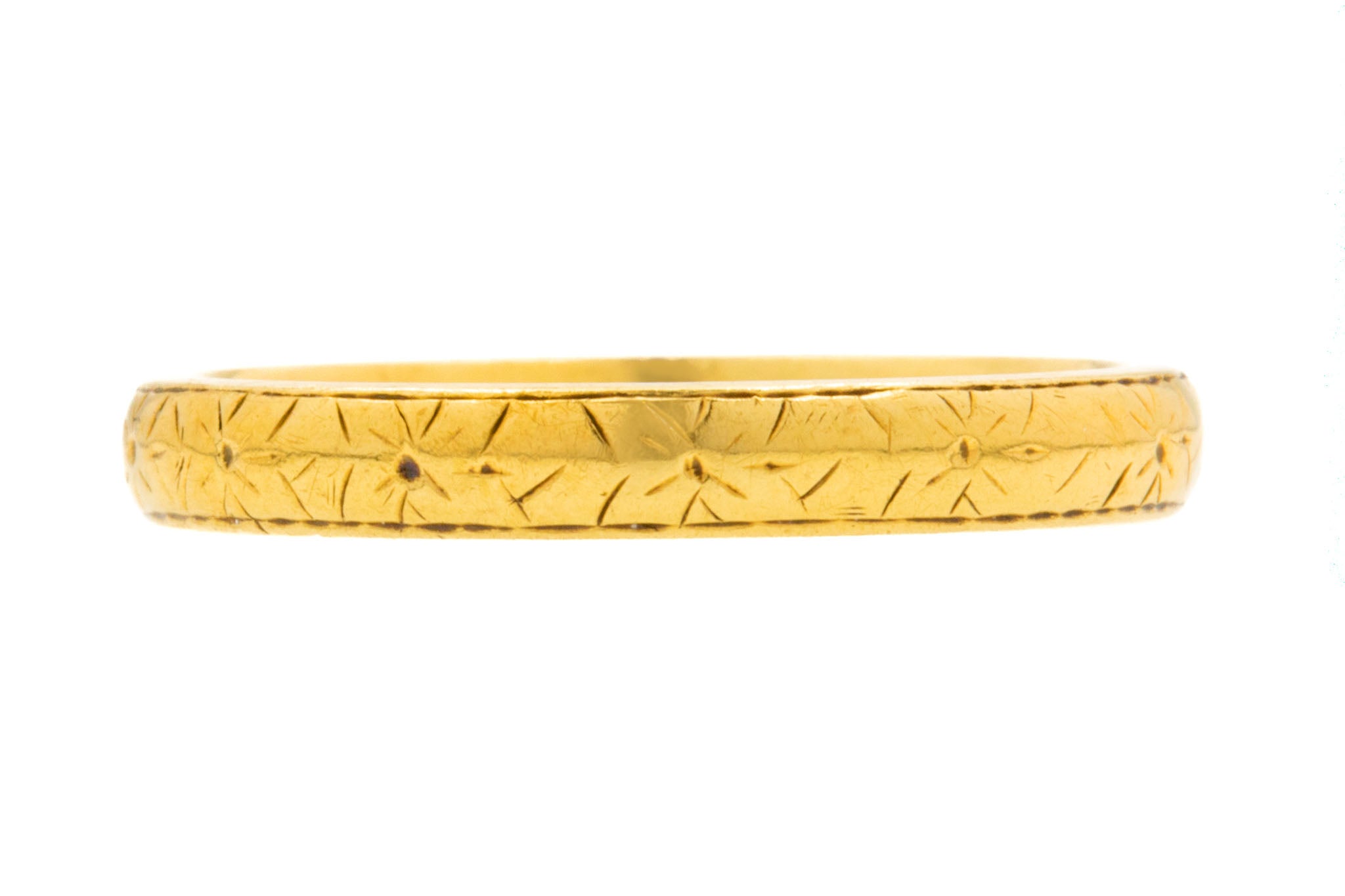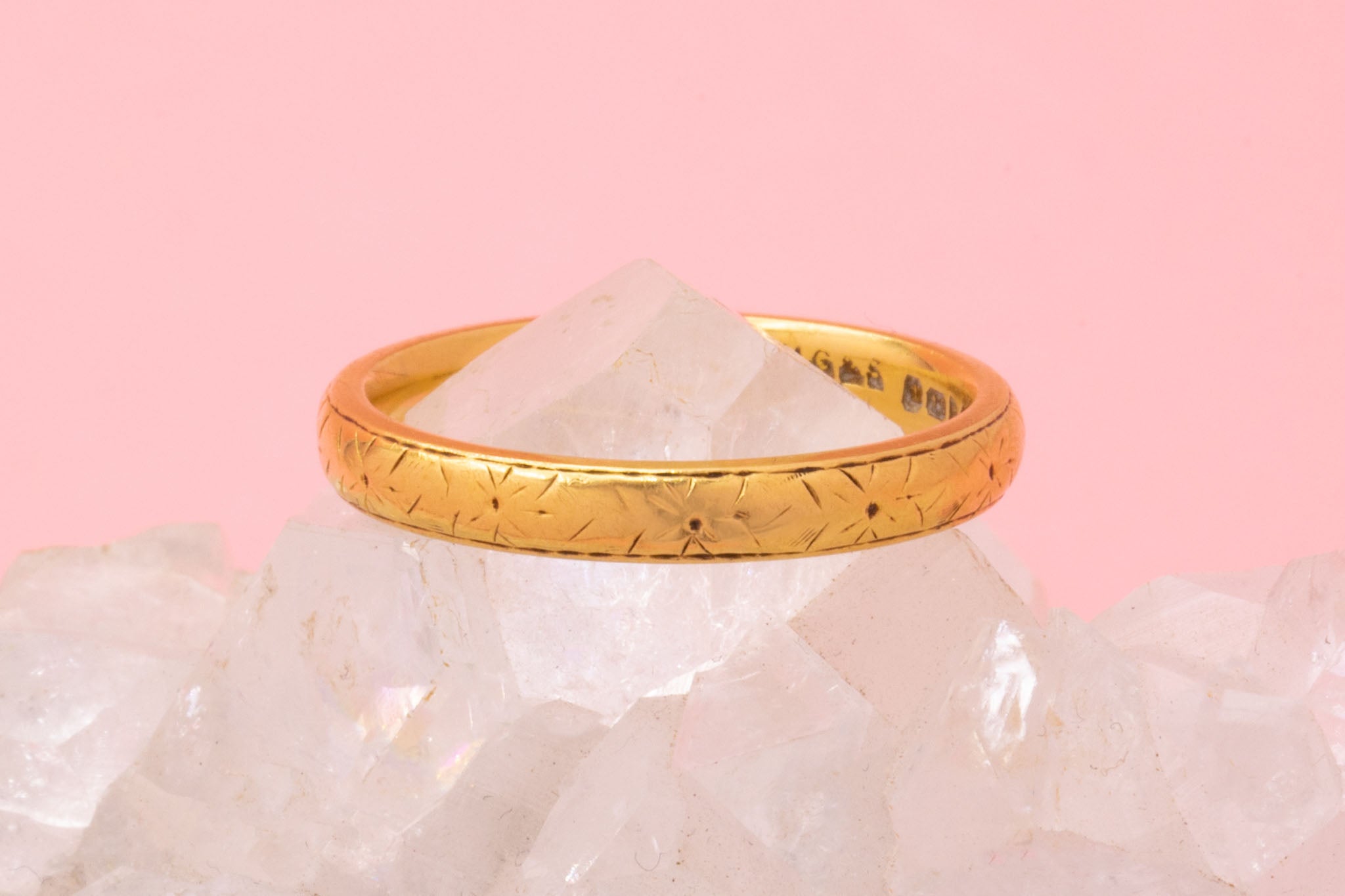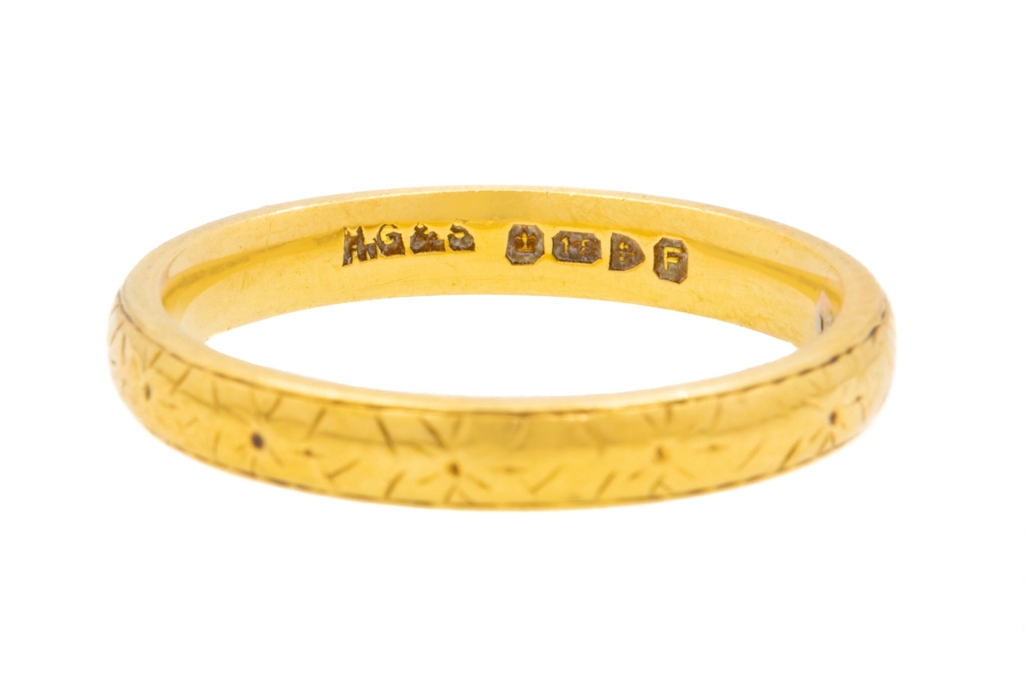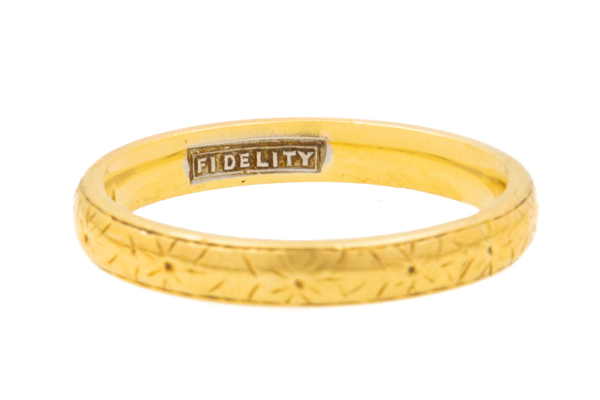 EXCELLENT. This 18ct Gold orange blossom engraved wedding ring is in excellent condition. The ring band has a beautifully engraved border, and we can still see the orange blossoms clearly. The inside of the band has a full set of hallmarks and stamped with the words fidelity -  an ever-so-sweet touch.